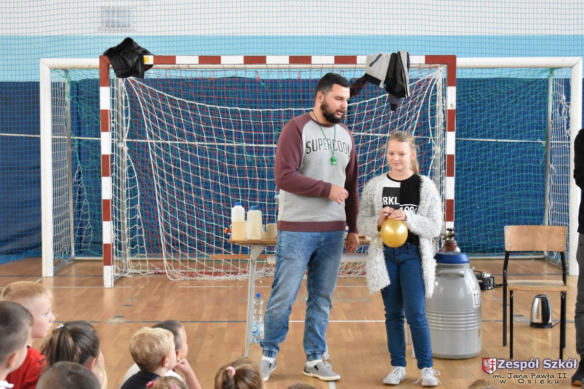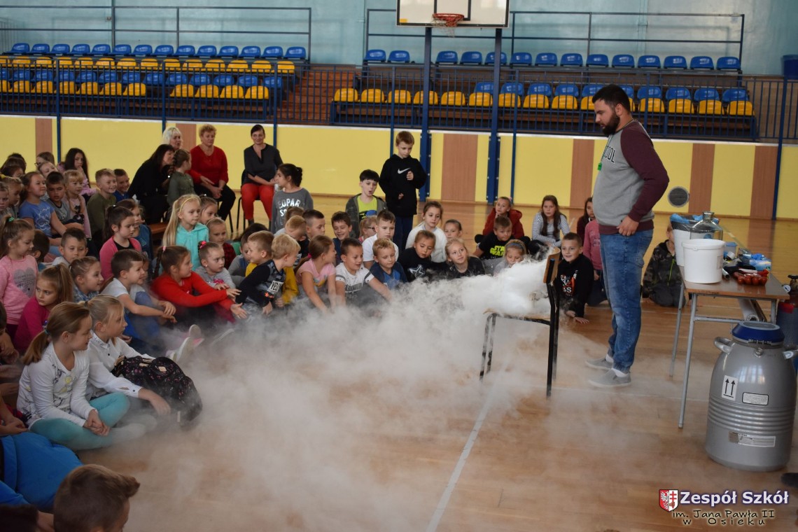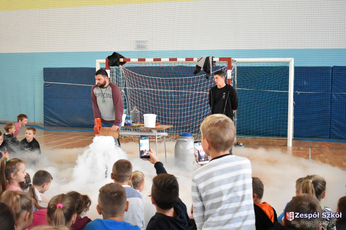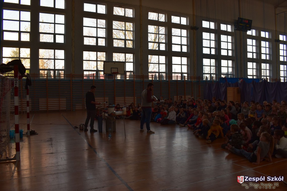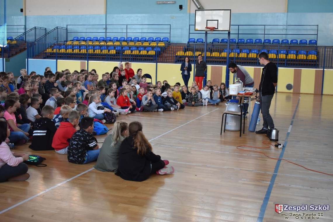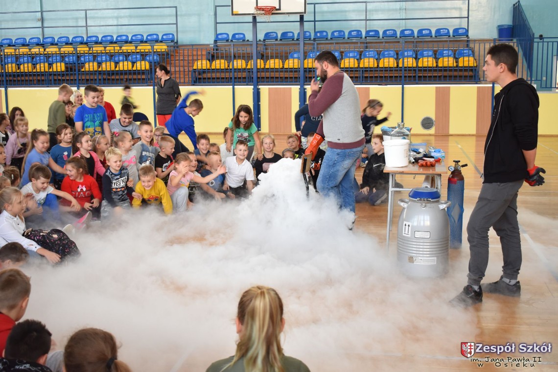 W dniu 08.11.2018 r. uczniowie ze wszystkich klas szkoły podstawowej oglądali i uczestniczyli w spektaklu „Fizyka wszędzie styka”, który był przedstawiony prze grupę Zaelektryzowani. Jest to grupa specjalizująca się w propagowaniu atrakcyjnej edukacji poprzez przedstawianie interaktywnych spektakli, których celem jest zaprezentowanie w sposób zabawny wybranych treści edukacyjnych z przyrody, fizyki i chemii. W ramach spektaklu dzieci miały okazję obejrzeć eksperymenty i dowiedzieć się na czym polegają: powstawanie wirów pierścieniowych, wytwarzanie wodoru, zabawy z helem i ciekłym azotem. Była to świetna zabaw dla uczestników, którzy w czynny sposób brali udział w wydarzeniach i eksperymentach.