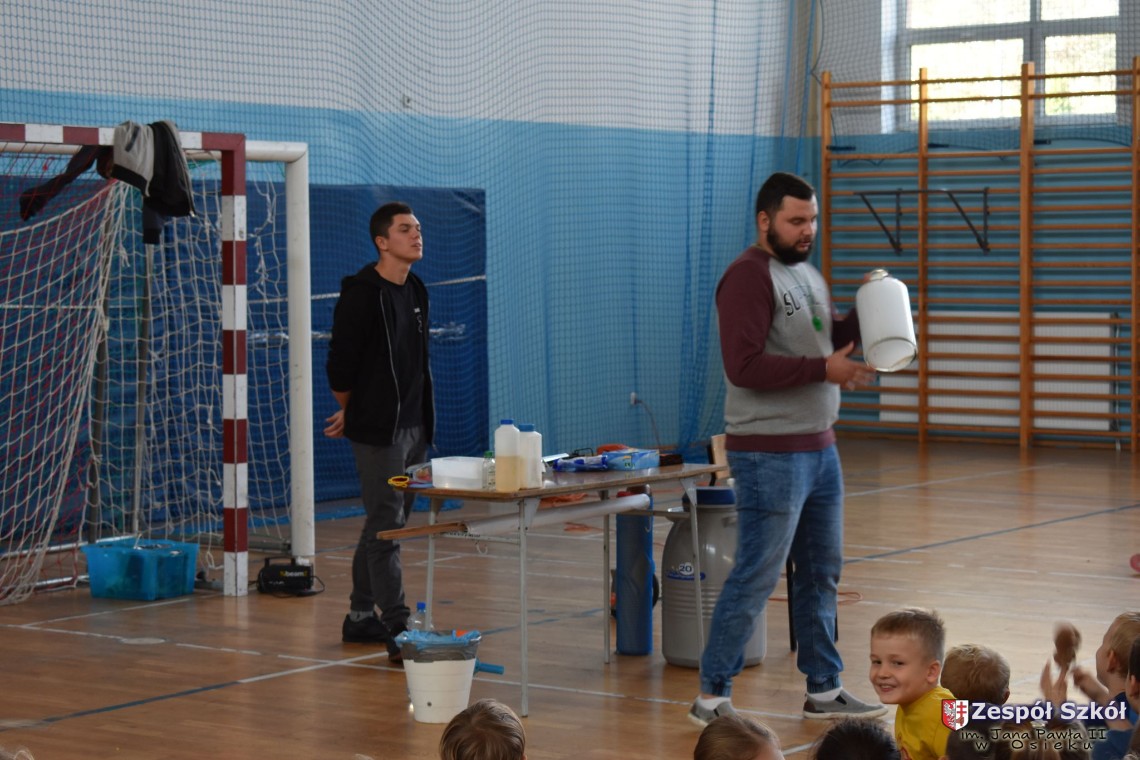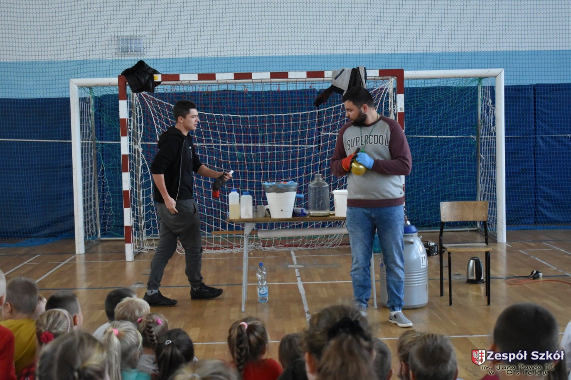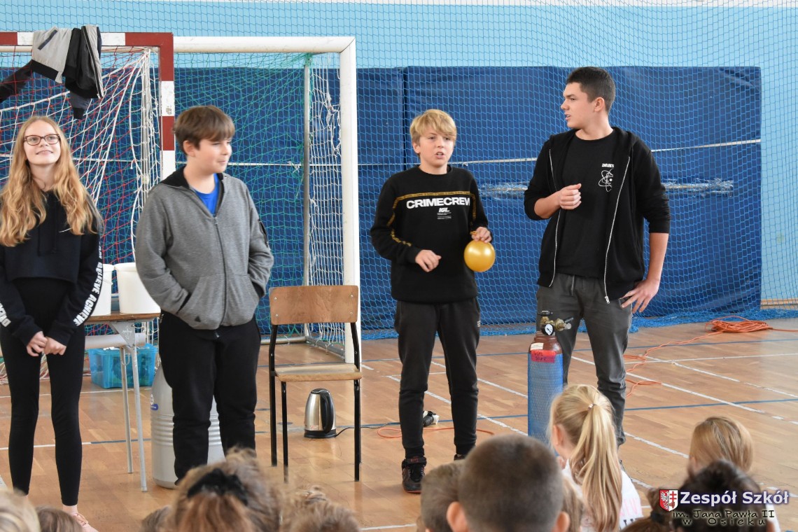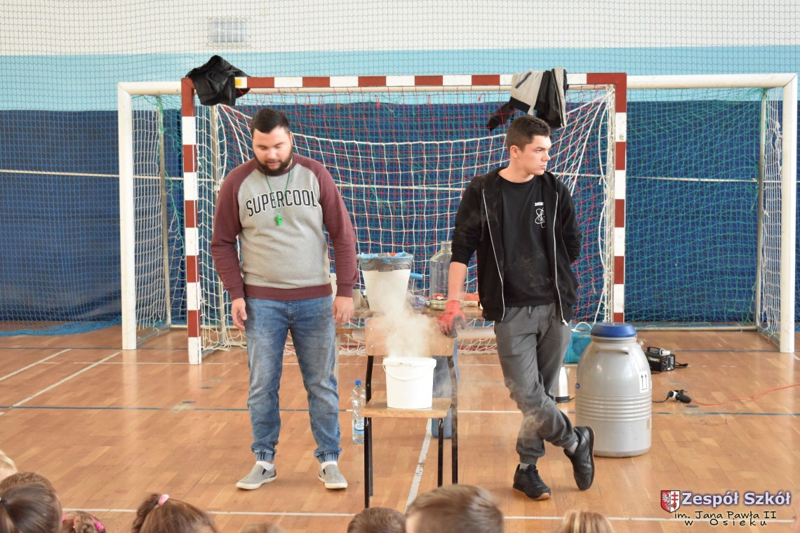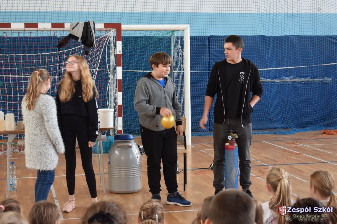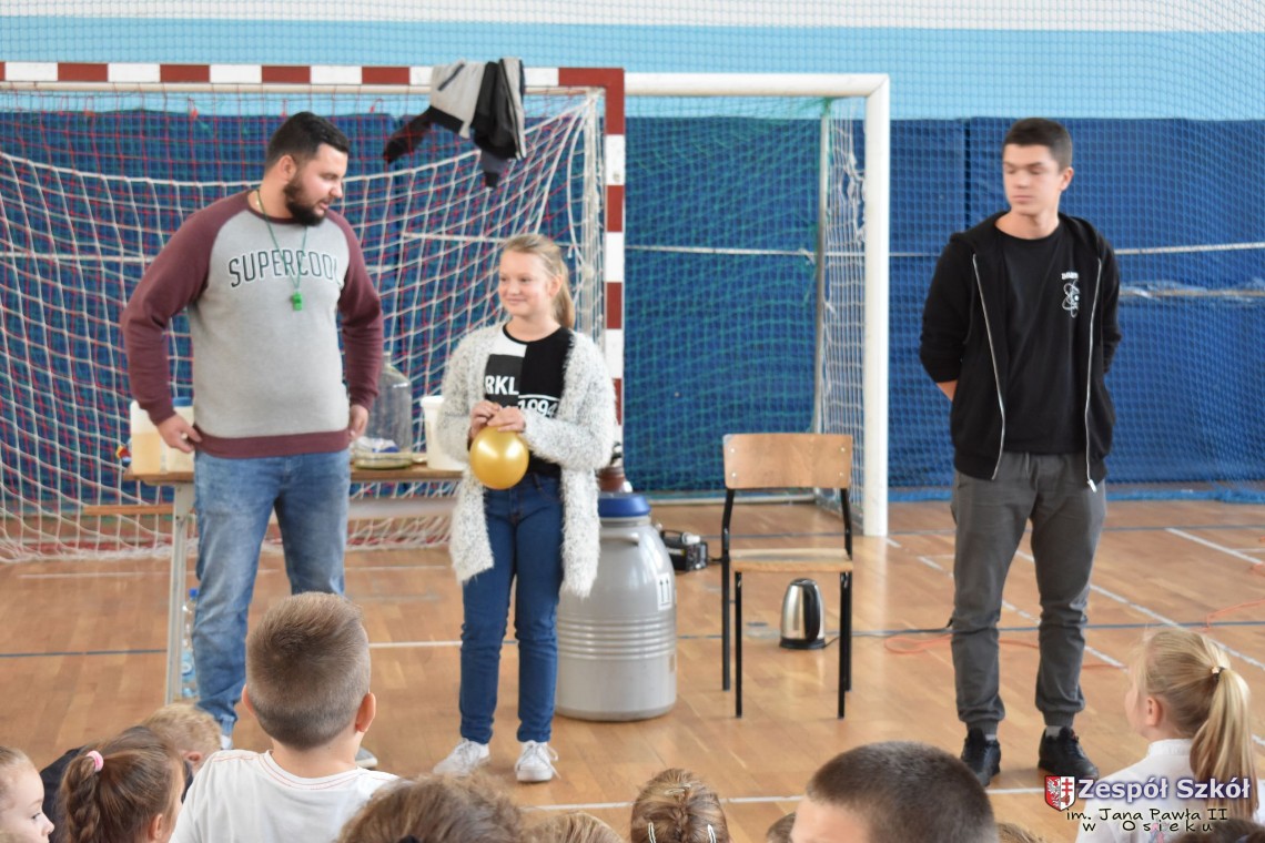W dniu 08.11.2018 r. uczniowie ze wszystkich klas szkoły podstawowej oglądali i uczestniczyli w spektaklu „Fizyka wszędzie styka”, który był przedstawiony prze grupę Zaelektryzowani. Jest to grupa specjalizująca się w propagowaniu atrakcyjnej edukacji poprzez przedstawianie interaktywnych spektakli, których celem jest zaprezentowanie w sposób zabawny wybranych treści edukacyjnych z przyrody, fizyki i chemii. W ramach spektaklu dzieci miały okazję obejrzeć eksperymenty i dowiedzieć się na czym polegają: powstawanie wirów pierścieniowych, wytwarzanie wodoru, zabawy z helem i ciekłym azotem. Była to świetna zabaw dla uczestników, którzy w czynny sposób brali udział w wydarzeniach i eksperymentach.