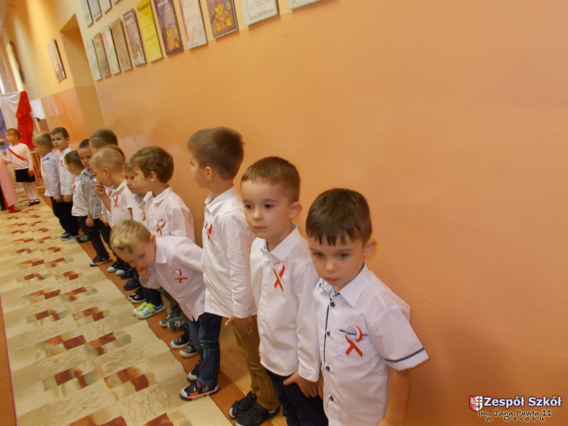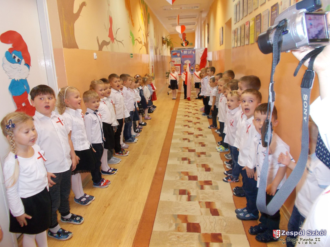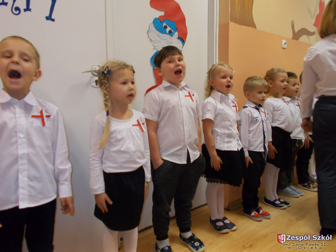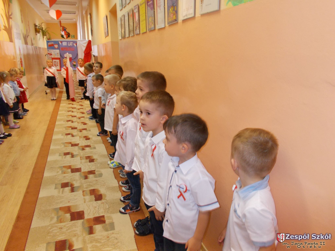 W związku z obchodami 100-lecia Odzyskania Niepodległości przez Polskę, dzieci z Publicznego Przedszkola z grup 3-4-5 latków, zaśpiewały 9.11.2018 r. o godz. 11.11 hymn państwowy. Podkreśliły to wizytowe stroje i kotyliony w barwach narodowych oraz postawa dzieci. Poczet sztandarowy przedszkolaków oraz dekoracje uświetniły tę uroczystą chwilę.