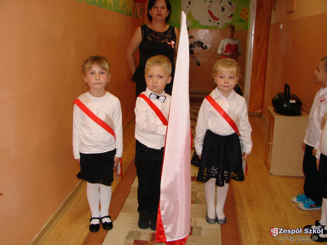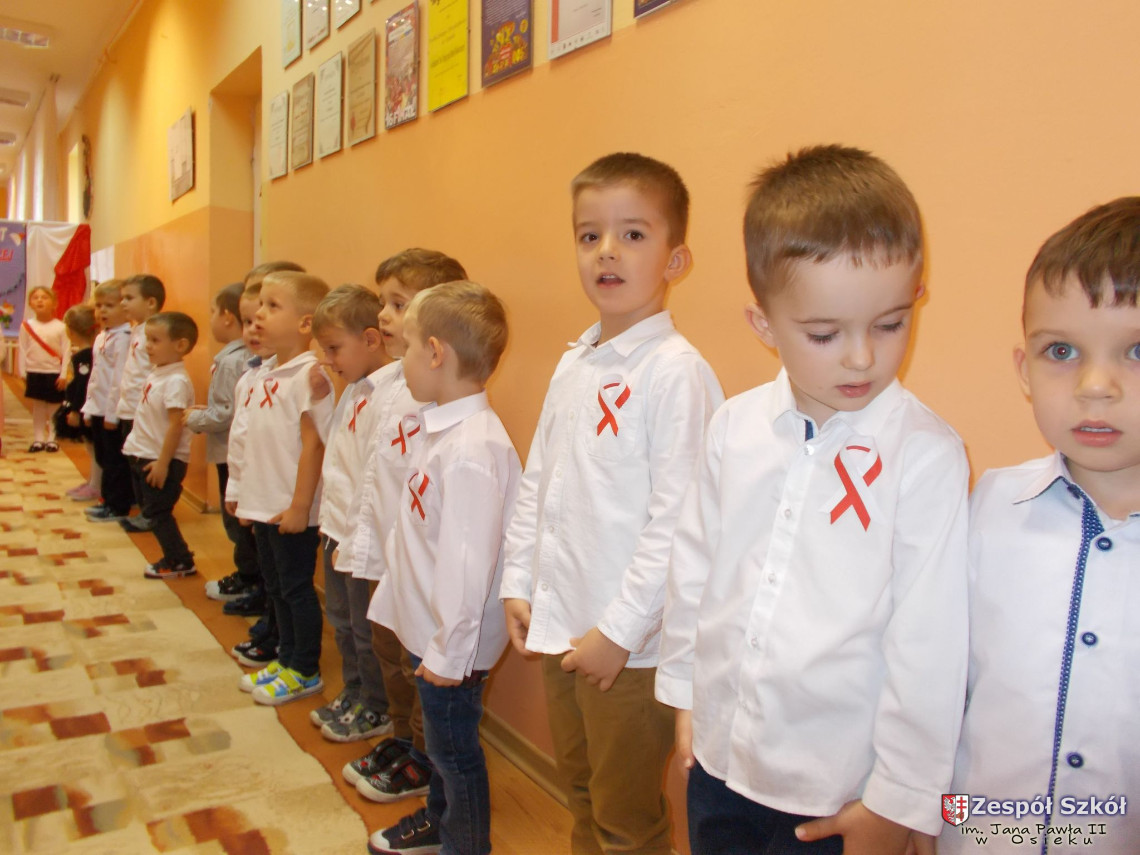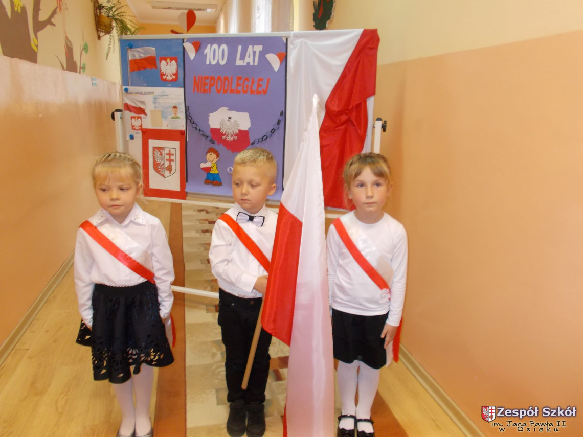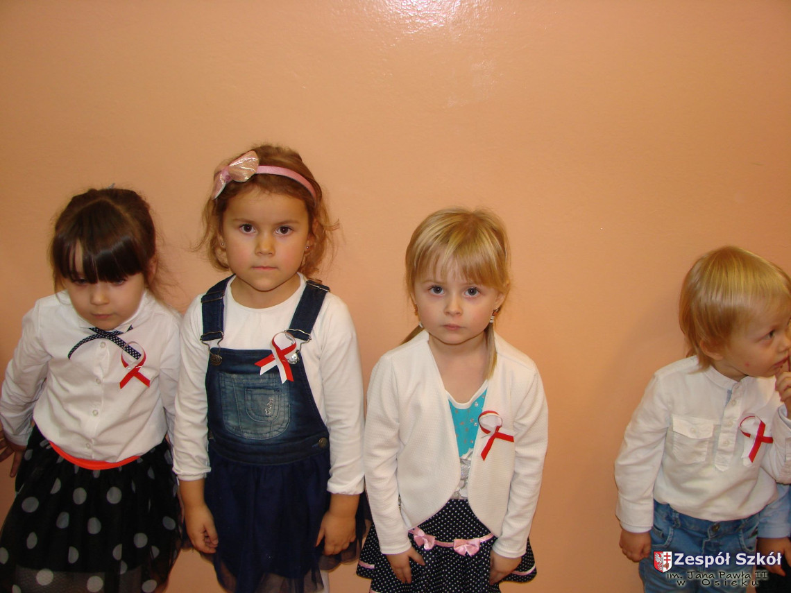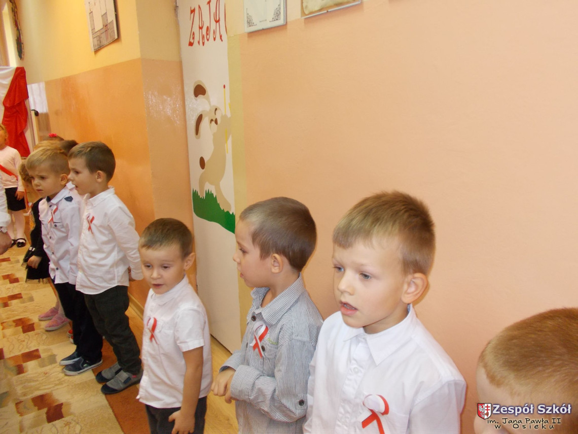 W związku z obchodami 100-lecia Odzyskania Niepodległości przez Polskę, dzieci z Publicznego Przedszkola z grup 3-4-5 latków, zaśpiewały 9.11.2018 r. o godz. 11.11 hymn państwowy. Podkreśliły to wizytowe stroje i kotyliony w barwach narodowych oraz postawa dzieci. Poczet sztandarowy przedszkolaków oraz dekoracje uświetniły tę uroczystą chwilę.