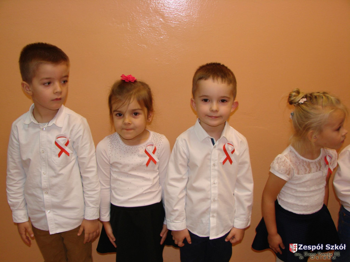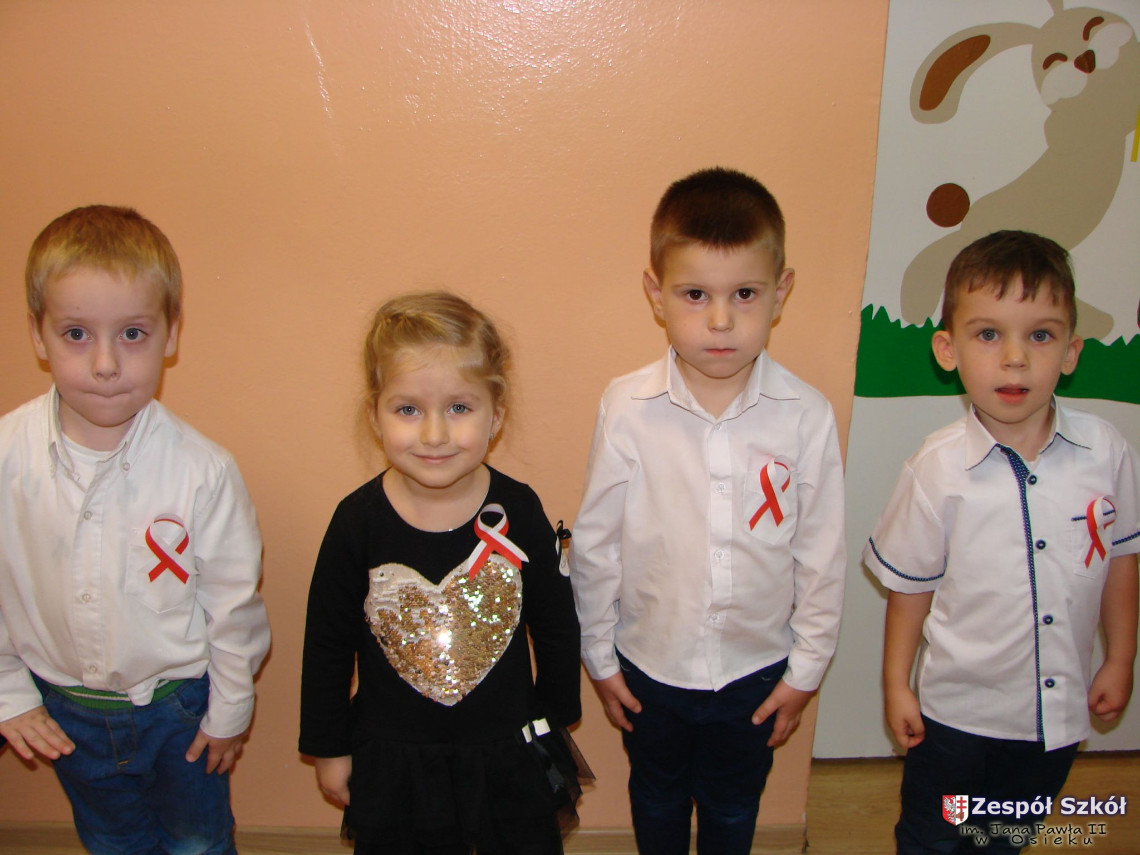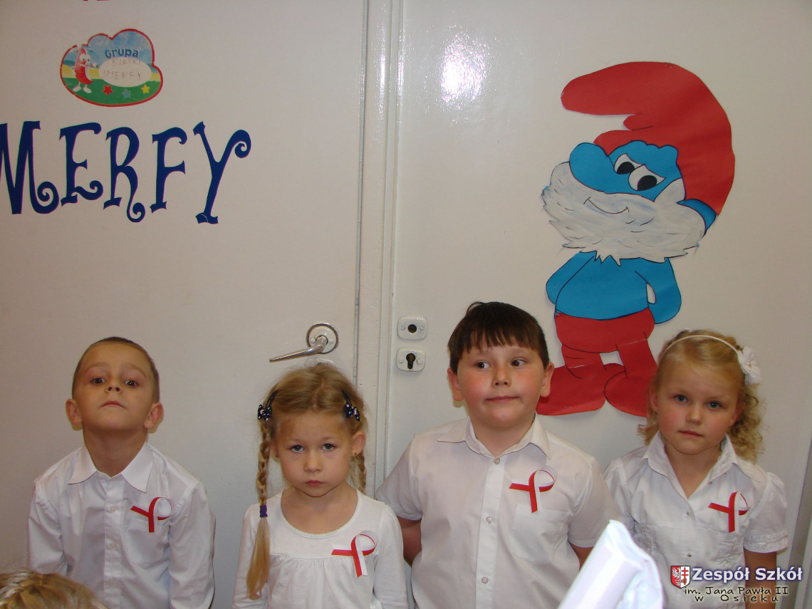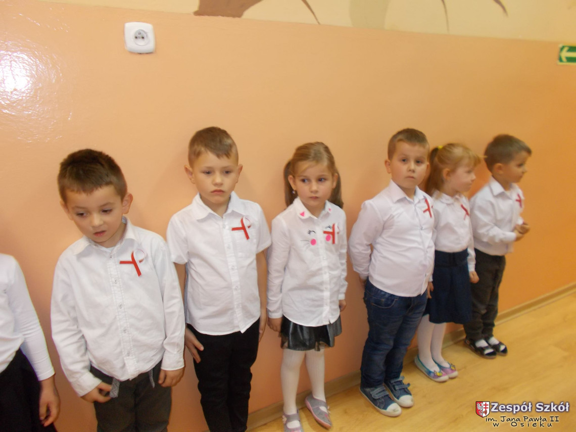 W związku z obchodami 100-lecia Odzyskania Niepodległości przez Polskę, dzieci z Publicznego Przedszkola z grup 3-4-5 latków, zaśpiewały 9.11.2018 r. o godz. 11.11 hymn państwowy. Podkreśliły to wizytowe stroje i kotyliony w barwach narodowych oraz postawa dzieci. Poczet sztandarowy przedszkolaków oraz dekoracje uświetniły tę uroczystą chwilę.
