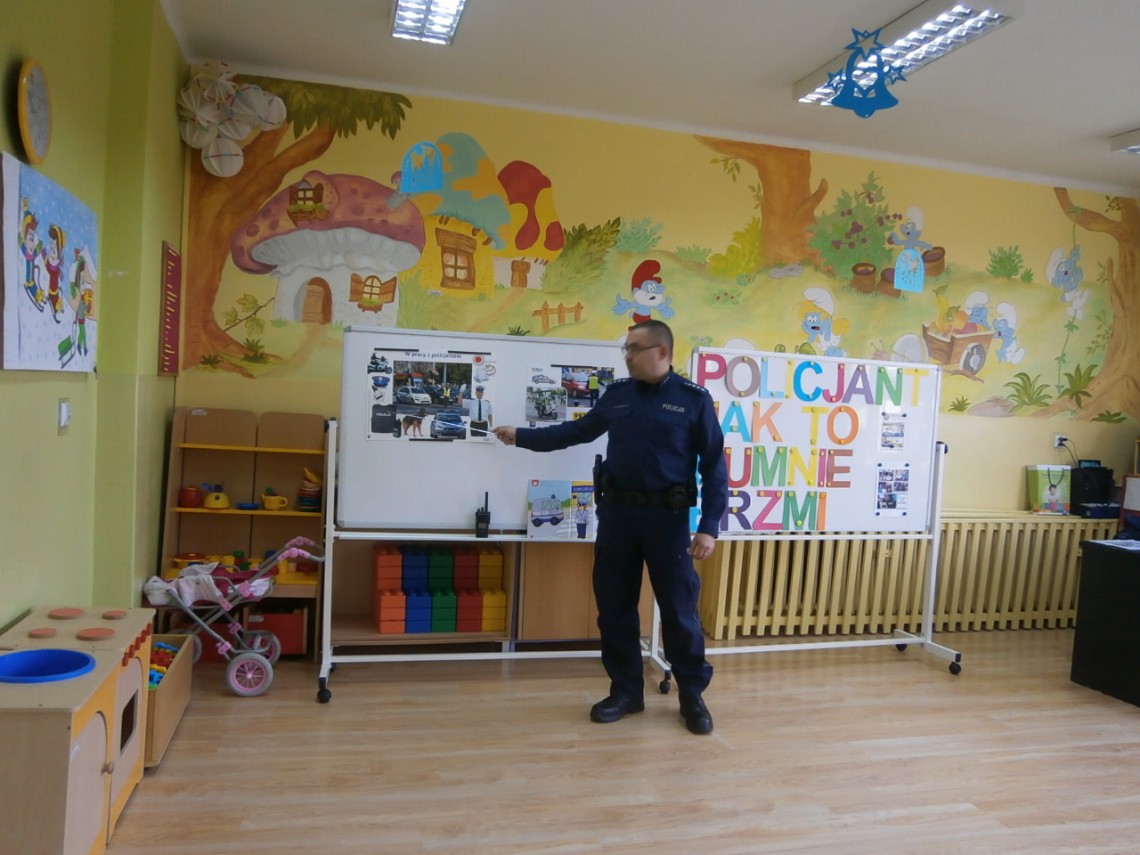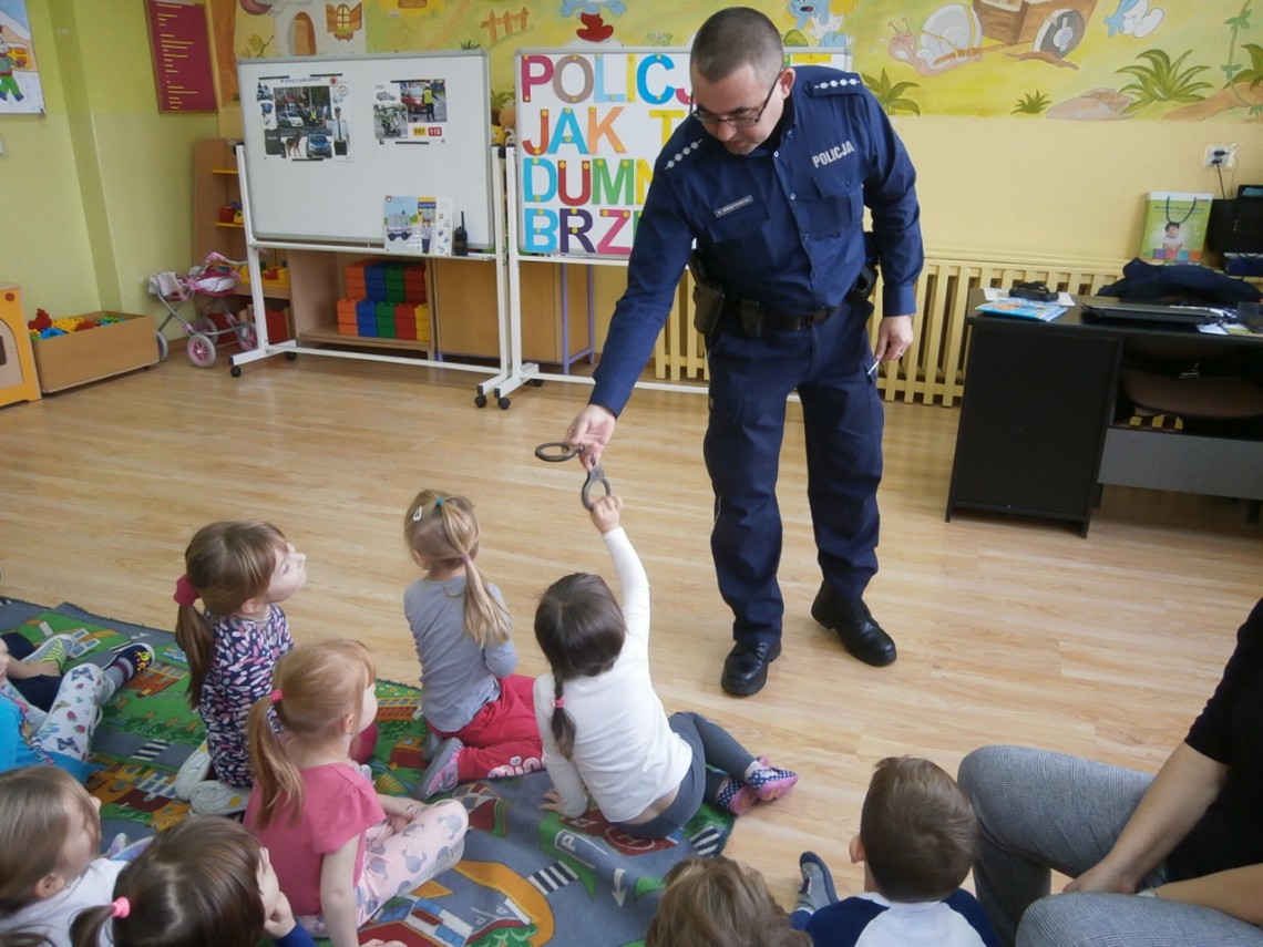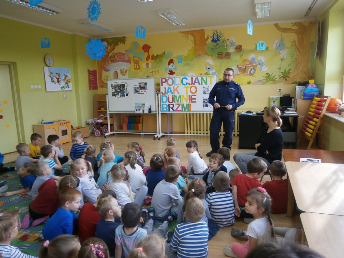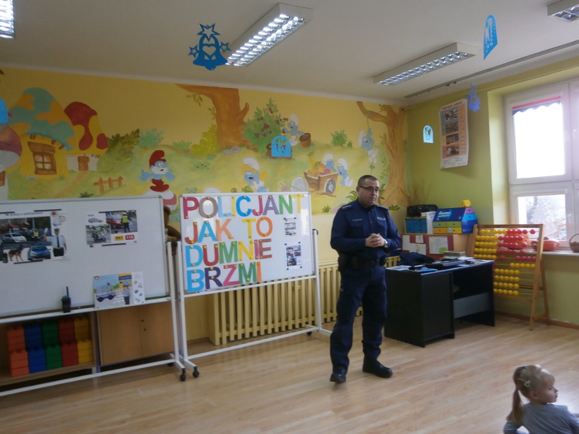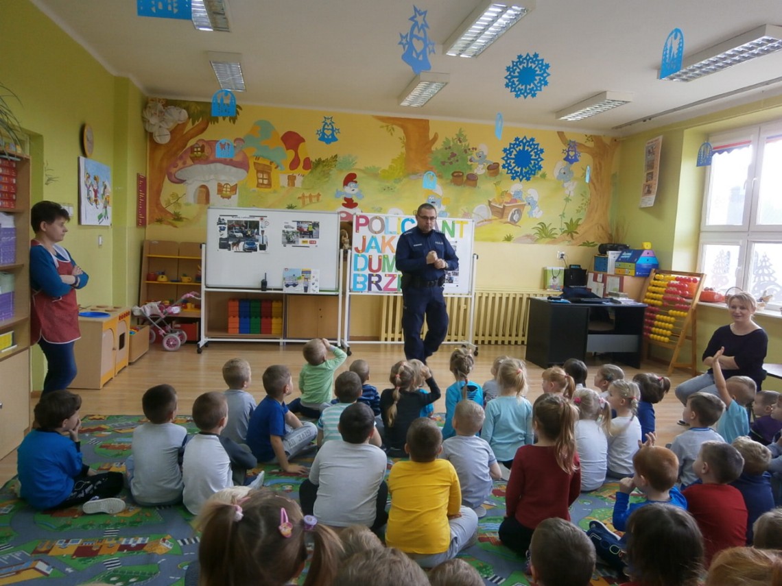 Zawód policjanta stanowi jedną z bardziej intrygujących profesji na rynku pracy. Do podstawowych zadań policji należy ochrona porządku publicznego, wykrywanie i walka z przestępczością, ściganie osób poszukiwanych oraz poszukiwania osób zaginionych. W zakresie zadań znajduje się również ochrona osób i mienia, działalność antykryzysowa w przypadku katastrof i klęsk żywiołowych, działalność antyterrorystyczna oraz wszelkie działania prewencyjne. O tym właśnie opowiadał przedszkolakom asp.szt. Krzysztof Kwiatkowski. Dzieci miały również możliwość zobaczyć wyposażenie policjanta i auto służbowe.