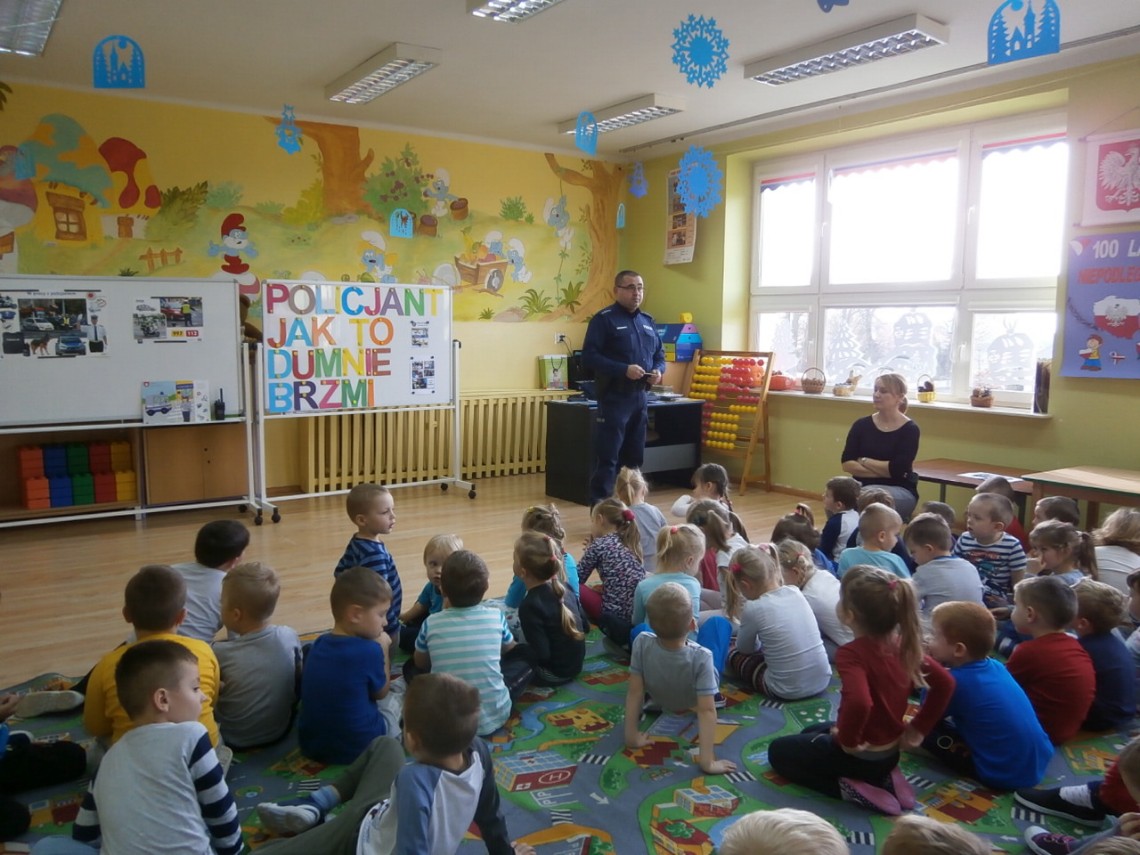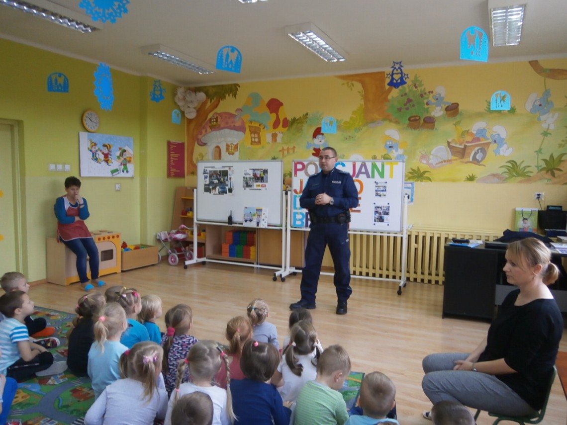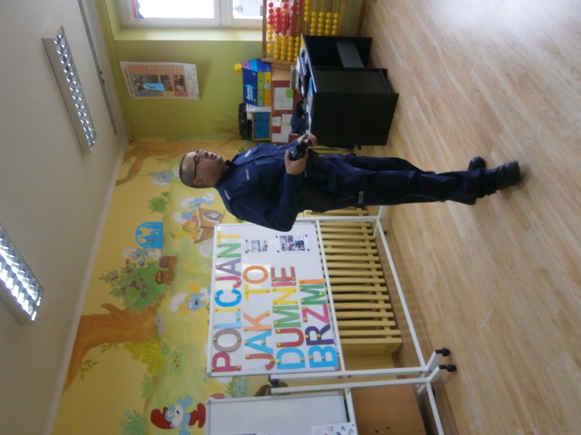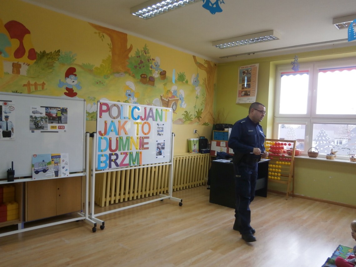Zawód policjanta stanowi jedną z bardziej intrygujących profesji na rynku pracy. Do podstawowych zadań policji należy ochrona porządku publicznego, wykrywanie i walka z przestępczością, ściganie osób poszukiwanych oraz poszukiwania osób zaginionych. W zakresie zadań znajduje się również ochrona osób i mienia, działalność antykryzysowa w przypadku katastrof i klęsk żywiołowych, działalność antyterrorystyczna oraz wszelkie działania prewencyjne. O tym właśnie opowiadał przedszkolakom asp.szt. Krzysztof Kwiatkowski. Dzieci miały również możliwość zobaczyć wyposażenie policjanta i auto służbowe.