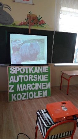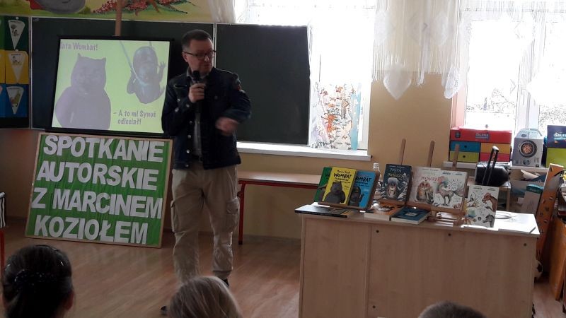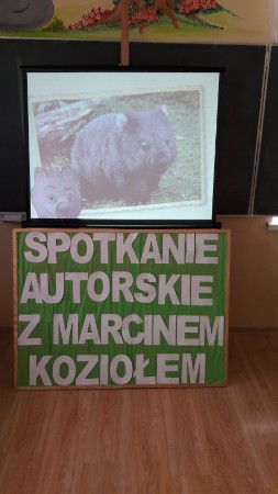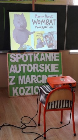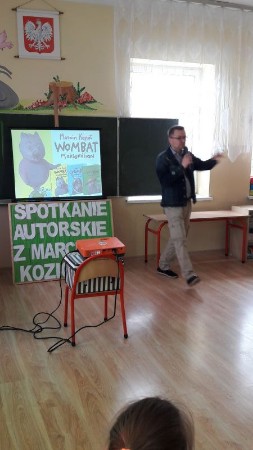W warsztatach multimedialnych z pisarzem wzięli udział uczniowie klas IIa z wych. p. Renatą Gazdecką  i III  z wych. p. Ewą Kruszewską. W obu klasach realizowane są autorskie projekty edukacyjno-czytelnicze. Spotkanie poświęcone było właśnie Wombatowi Maksymilianowi i jego przygodom. Dzieci dokładnie poznały głównego bohatera książki, który jest przedstawicielem tego mało znanego gatunku. Dowiedziały się gdzie zamieszkuje i jak żyje. Pan Marcin Kozioł opowiedział także o podróżach, geografii i kulturze niezwykłego królestwa w Himalajach, jakim jest Bhutan (tam rozgrywa się akcja pierwszej książki: „Wombat Maksymilian i Królestwo Grzmiącego Smoka”), a także sąsiedniego Nepalu, gdzie Wombat zawędrował w drugiej części pt. „Wombat Maksymilian i misja na dachu świata”.