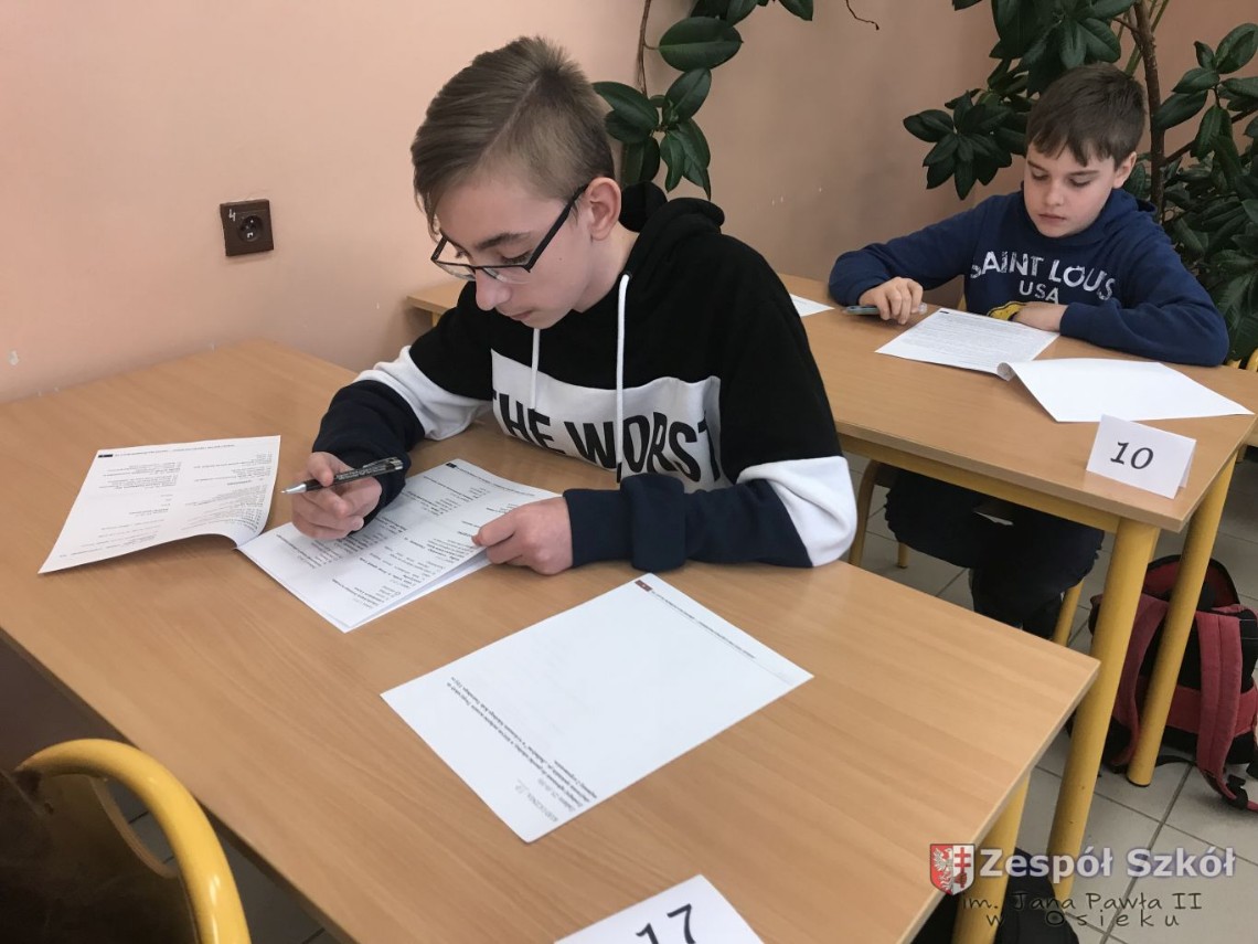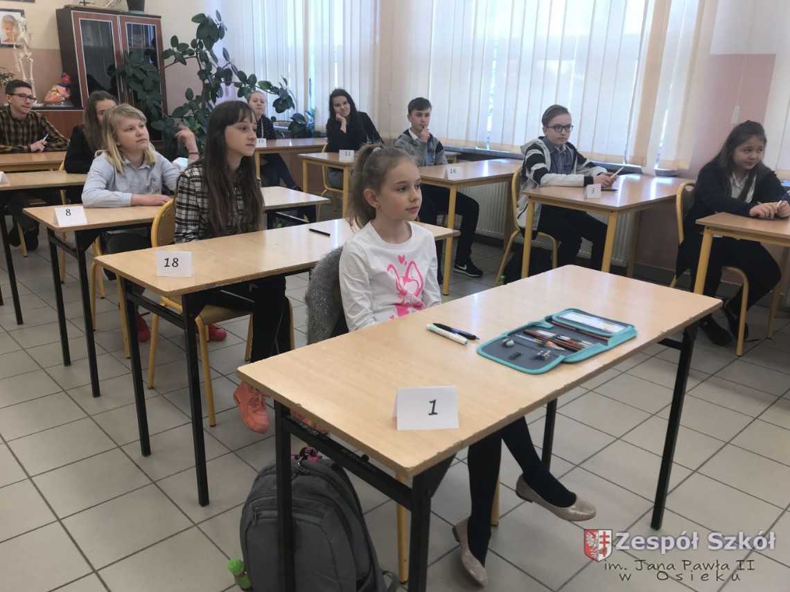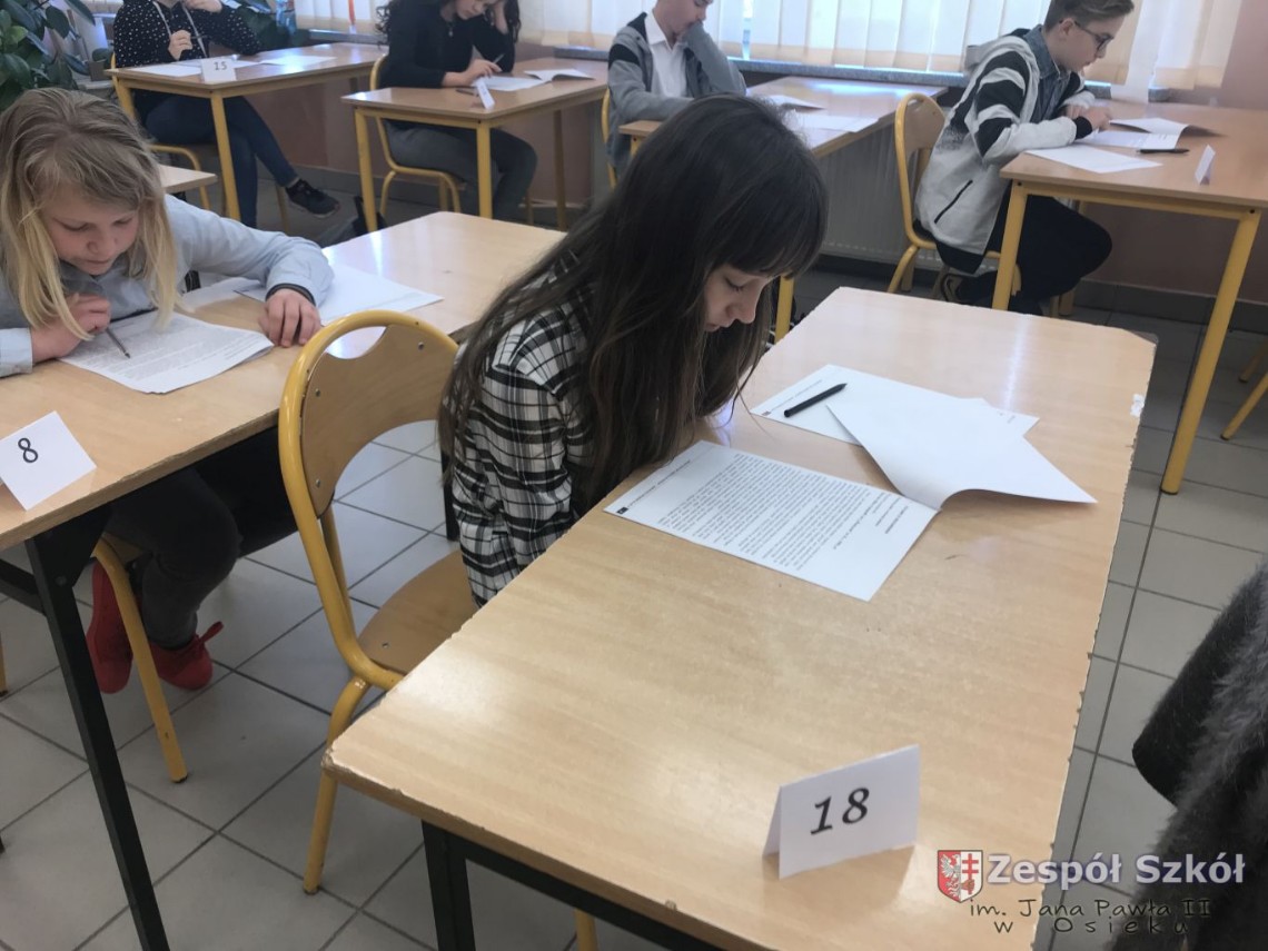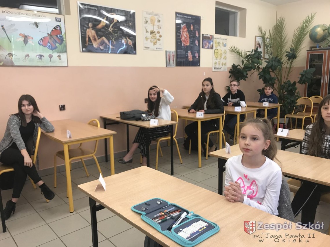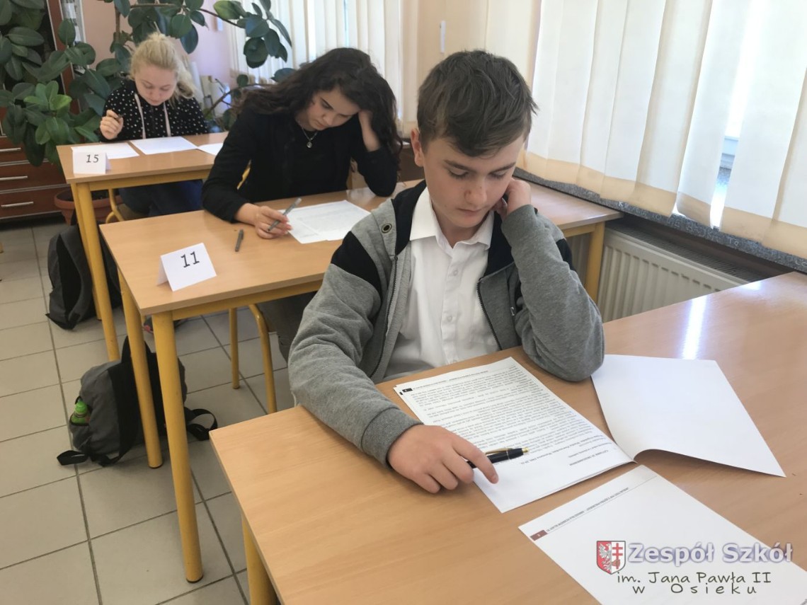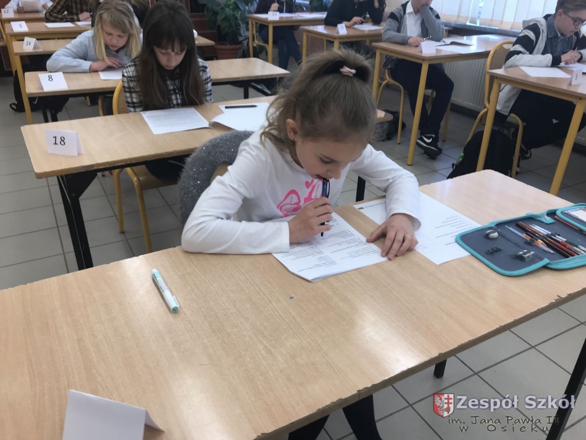 7 maja 2019 roku w Publicznej Szkole Podstawowej w Zespole Szkół im. Jana Pawła II w Osieku odbył się „Wielki Test PSP z Języka Polskiego”. Konkurs skierowany był do uczniów klas V-VIII PSP, którzy znakomicie wykazali się wiedzą w części pisemnej, ustnej i online. Na początku uczestnicy rozwiązywali test, który składał się z zadań otwartych i zamkniętych. Każdy arkusz był dostosowany według grupy wiekowej i sprawdzał wiedzę uczniów z zakresu czytania ze zrozumieniem, gramatyki i literatury. Ostatnim zadaniem na każdej pracy było zredagowanie pisma użytkowego – zaproszenia, ogłoszenia lub podania. Po wykonaniu zadań, uczniowie udali się do pracowni komputerowej, aby przystąpić do części online. Uczestnicy bardzo dobrze rozpoznali cytaty ze znanych utworów oraz nieobce im były postacie przedstawione na fotografiach. Konkurs zakończyła część ustna, w której uczniowie zdobyli dużą ilość punktów.