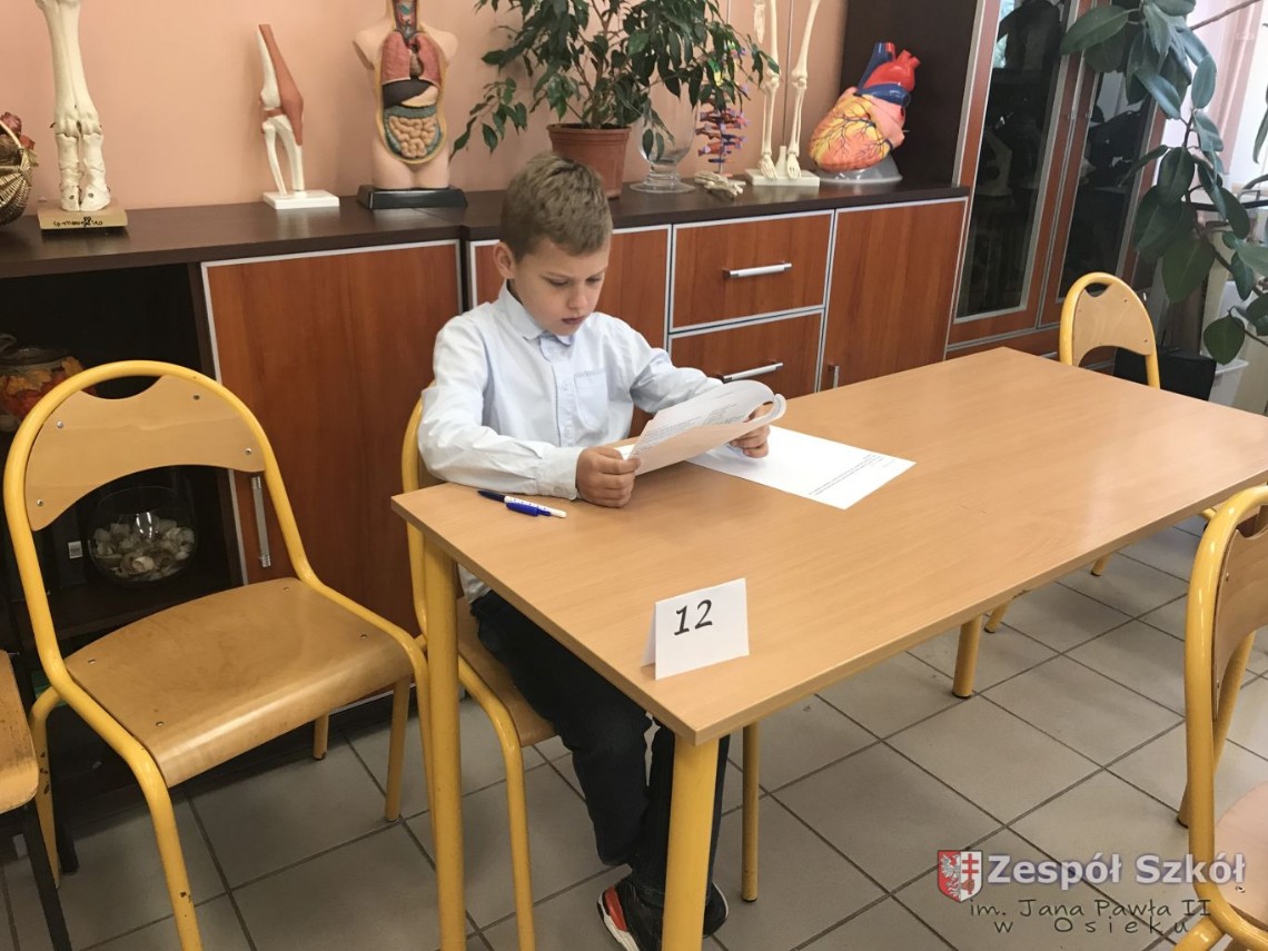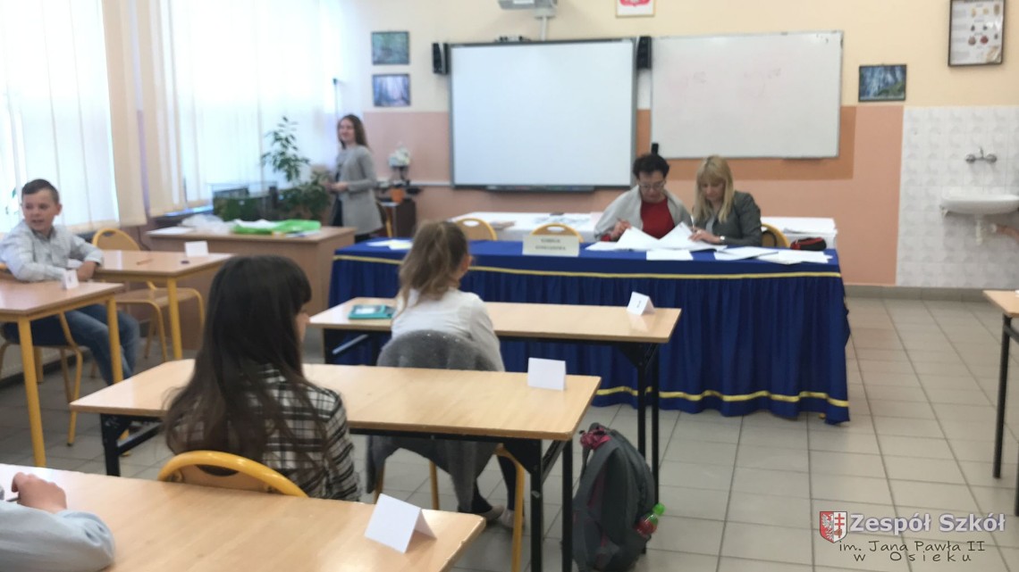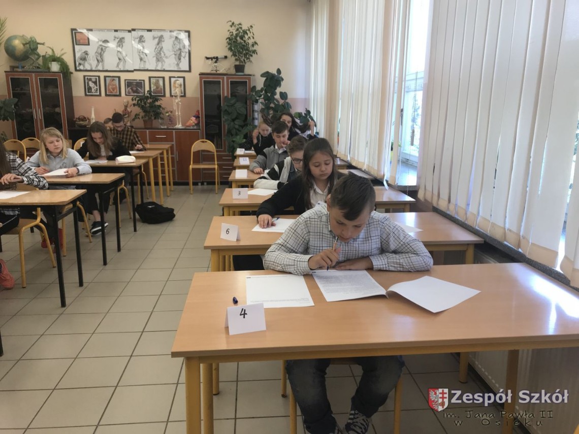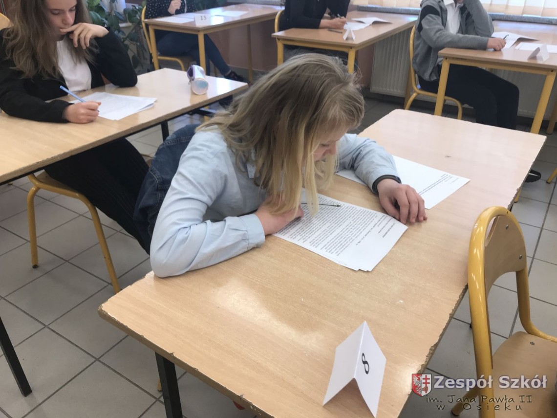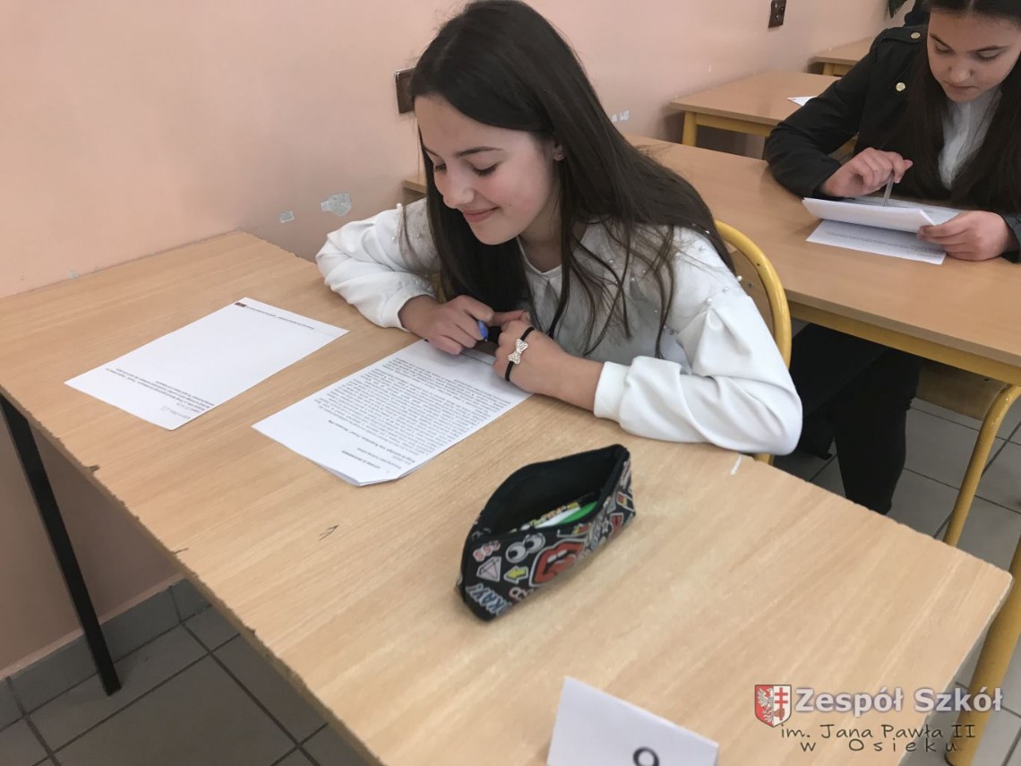 7 maja 2019 roku w Publicznej Szkole Podstawowej w Zespole Szkół im. Jana Pawła II w Osieku odbył się „Wielki Test PSP z Języka Polskiego”. Konkurs skierowany był do uczniów klas V-VIII PSP, którzy znakomicie wykazali się wiedzą w części pisemnej, ustnej i online. Na początku uczestnicy rozwiązywali test, który składał się z zadań otwartych i zamkniętych. Każdy arkusz był dostosowany według grupy wiekowej i sprawdzał wiedzę uczniów z zakresu czytania ze zrozumieniem, gramatyki i literatury. Ostatnim zadaniem na każdej pracy było zredagowanie pisma użytkowego – zaproszenia, ogłoszenia lub podania. Po wykonaniu zadań, uczniowie udali się do pracowni komputerowej, aby przystąpić do części online. Uczestnicy bardzo dobrze rozpoznali cytaty ze znanych utworów oraz nieobce im były postacie przedstawione na fotografiach. Konkurs zakończyła część ustna, w której uczniowie zdobyli dużą ilość punktów.