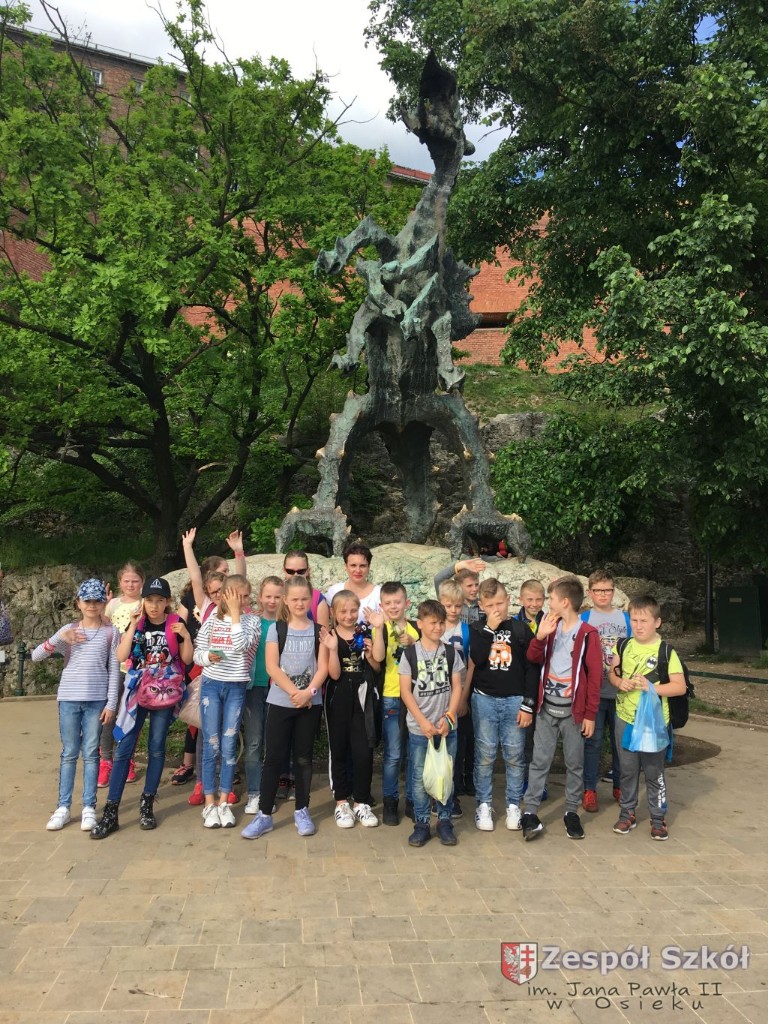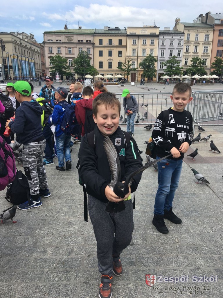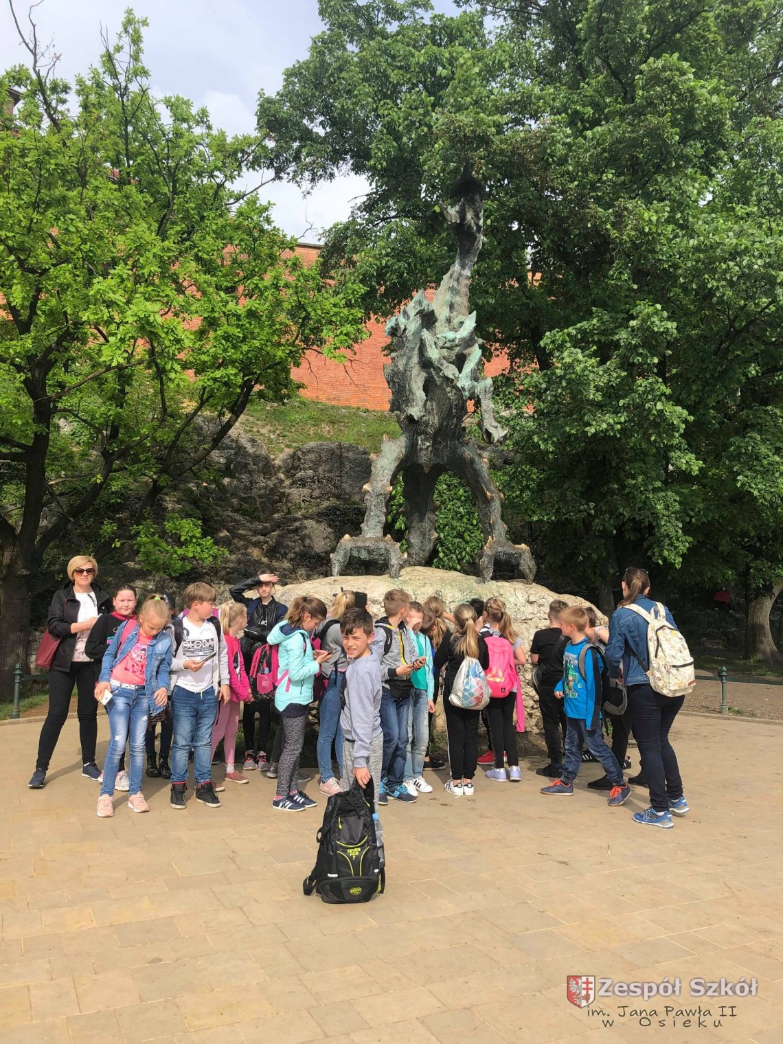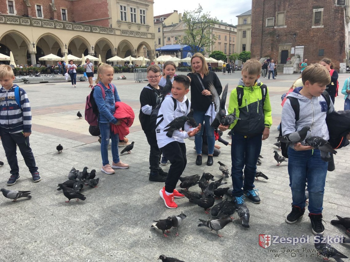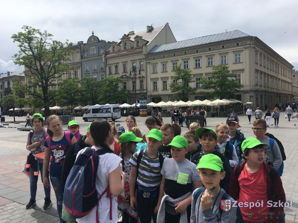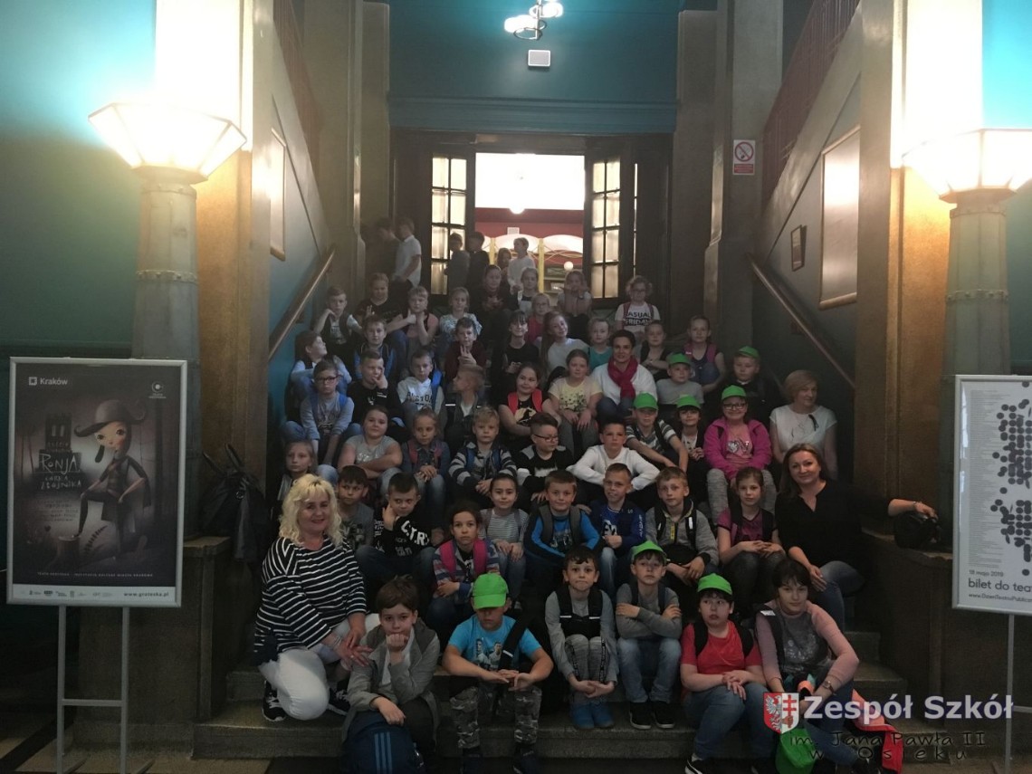 Dnia 20 maja 2019 r. uczniowie klas IV i V szkoły podstawowej udali się na wycieczkę do Krakowa. Pierwszym punktem programu była wizyta w Teatrze Groteska na premierze spektaklu „Ronja, córka zbójnika”, na podstawie powieści Astrid Lindgren. Następnie uczniowie spotkali się z przewodnikami, którzy wędrując z nami po Krakowie, odkrywali przed nami tajemnice i legendy związane z najstarszymi zabytkami Rynku Głównego. Przemierzając wzgórze wawelskie, mali turyści dowiedzieli się m.in. kto założył Kraków, gdzie mieszkali i bawili się królowie i kto zwyciężył smoka całożercę.
