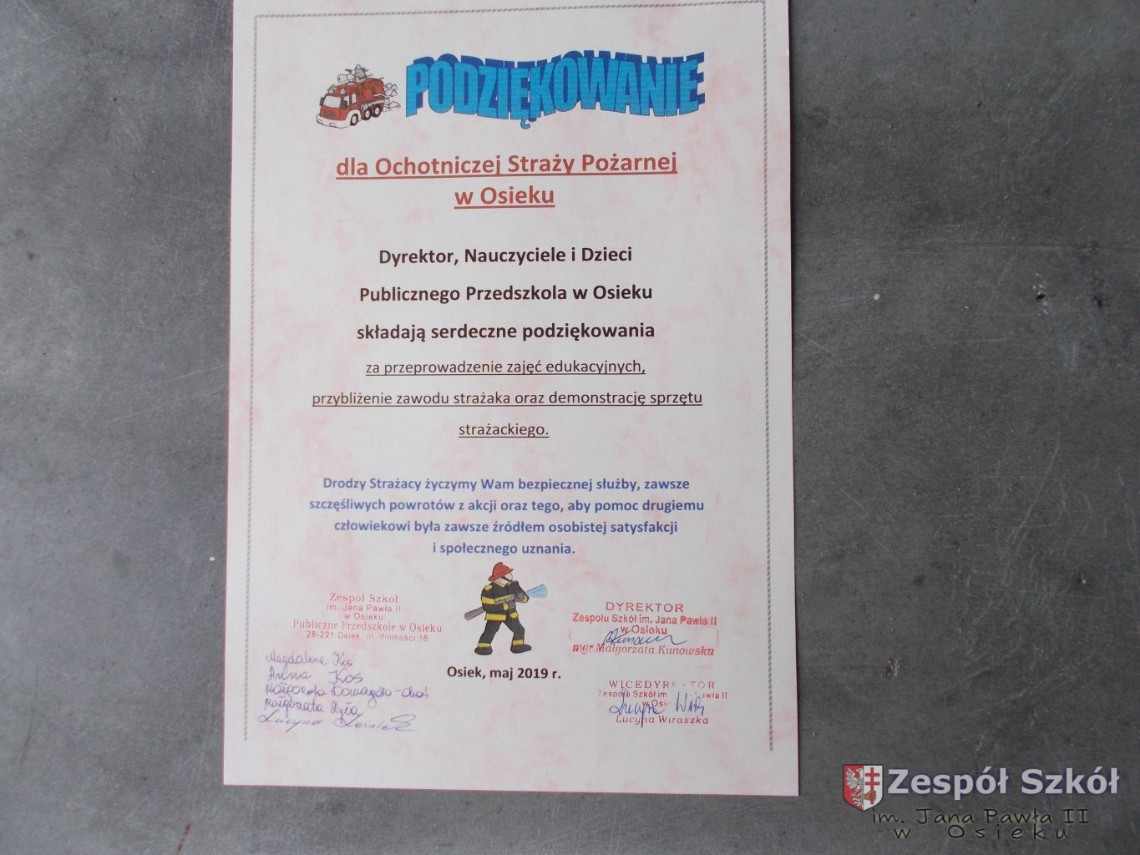 Dziękujemy serdecznie Naczelnikowi OSP w Osieku Pan Grzegorzowi Ryńskiemu i zastępcy naczelnika Panu Tomaszowi Mysłkowi oraz strażakom Panu Norbertowi Strojnowskiemu, Panu Dariuszowi Dziuba, Panu Sebastianowi Gębalskiemu oraz Panu Jakubowi Mysłkowi, którzy umożliwili przedszkolakom poznanie zawodu strażaka z bliska oraz Pani Darii Dziuba za pomoc w organizacji spotkania.