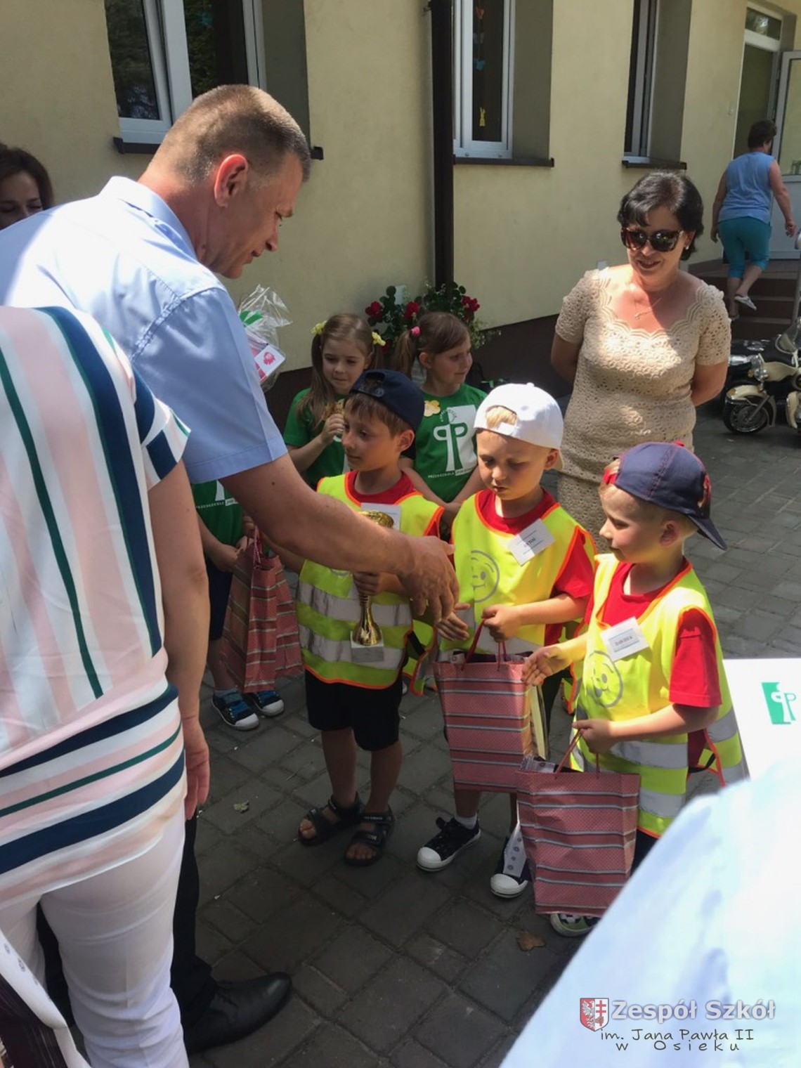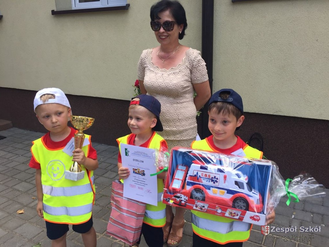 Nasze przedszkole reprezentowali Antoś Ciepiela, Dawidek Wieczorek i Marcelek Okoń. Chłopcy wykazali się bardzo dużą wiedzą i umiejętnościami z zakres przepisów ruchu drogowego, co pozwoliło im na zajęcie II miejsca w turnieju. Serdecznie gratulujemy i życzymy dalszych sukcesów.