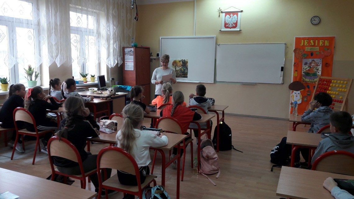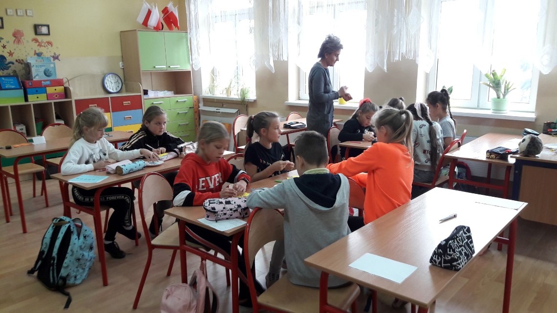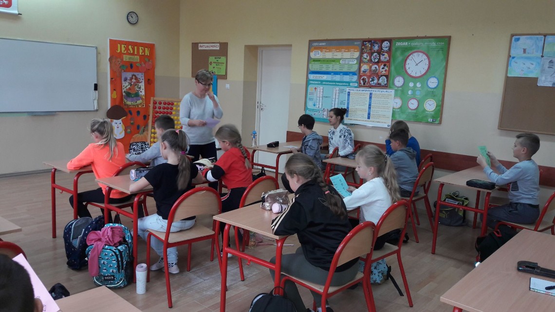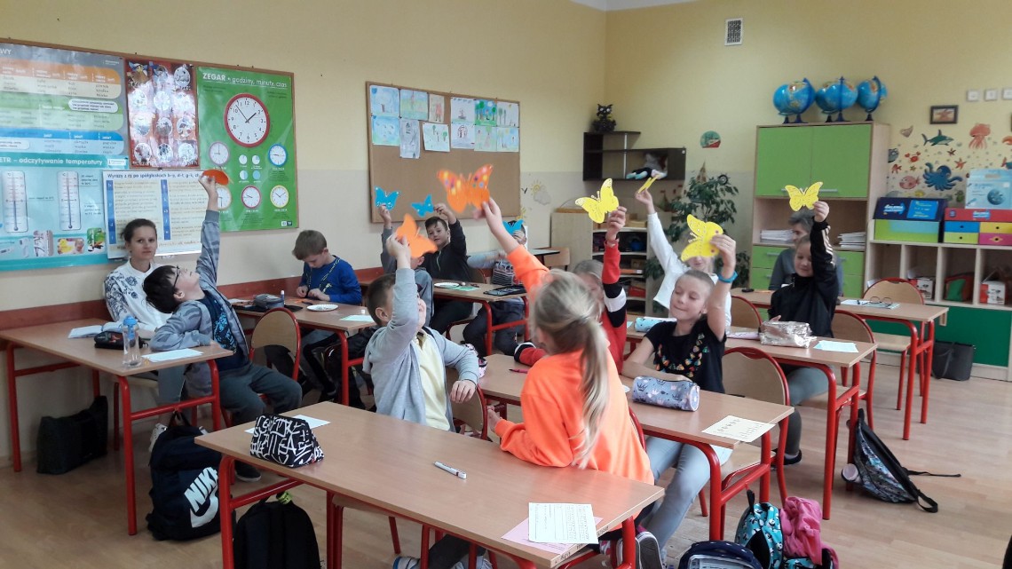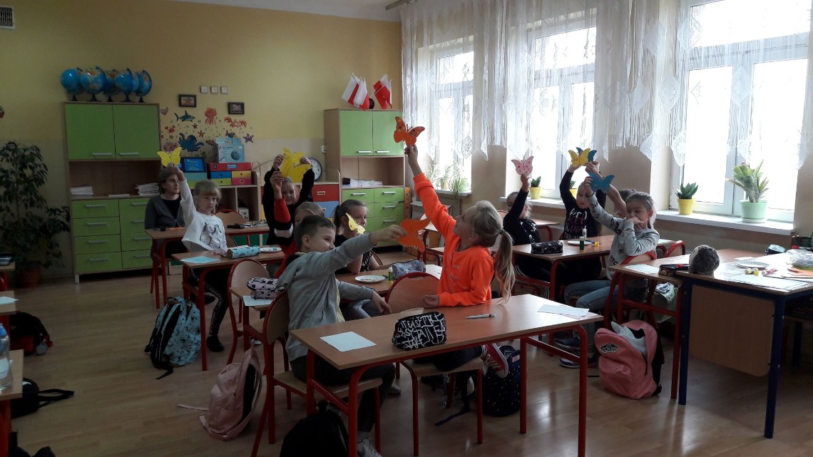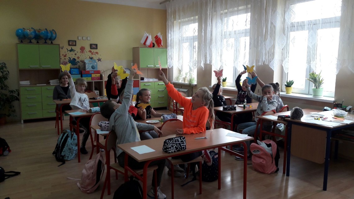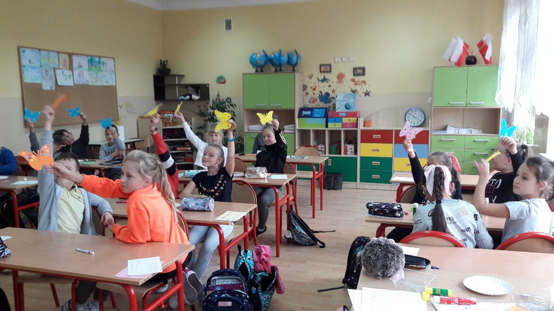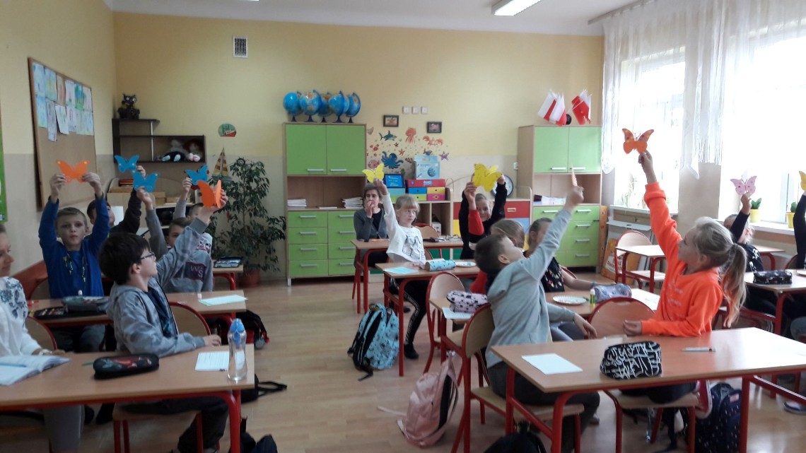 Miesiąc październik jest Miesiącem Bibliotek Szkolnych i w związku z tym w dniu 22.10.2019 r. w klasie III A została przeprowadzona lekcja biblioteczna na temat „Ogród dobrych słów – zajęcia z elementami biblioterapii”. Lekcja była prowadzona przez p. Ewę Basińską z Biblioteki Pedagogicznej w Staszowie. Uczniowie wysłuchali opowiadania o roślinach rosnących w ogrodzie dobrych słów (proszę, przepraszam, dziękuję itp.), na podstawie którego odbyła się dyskusja klasowa jak również dzieci uzupełniały karty pracy. Na podsumowanie lekcji uczniowie otrzymali papierowe motyle, na których wypisali dobre i miłe słowa jakie chcieliby skierować i wysłać do innych ludzi. Następnie wykorzystując swoją kreatywność przyozdobili wszystkie motylki, które stworzyły przepiękną dekoracje w klasie. Była to bardzo interesująca i pouczająca lekcja, na której dzieci utrwalały „czarodziejskie słowa”, jak również zostały zachęcone do częstszego sięgania po książkę. Spotkanie odbyło się we ścisłej współpracy z p. Zdzisławą Król naszą szkolną bibliotekarką, która również gościła na lekcji.