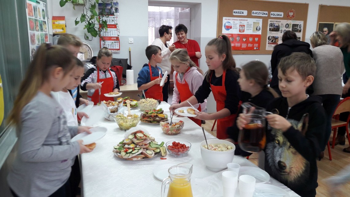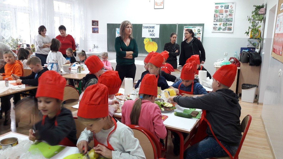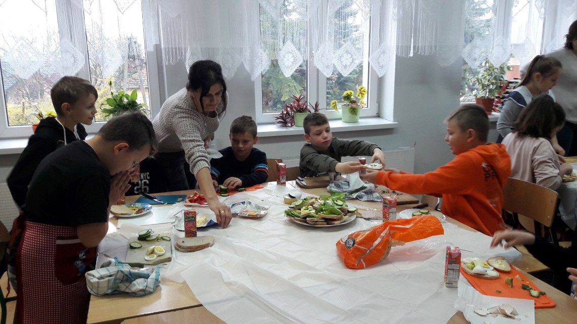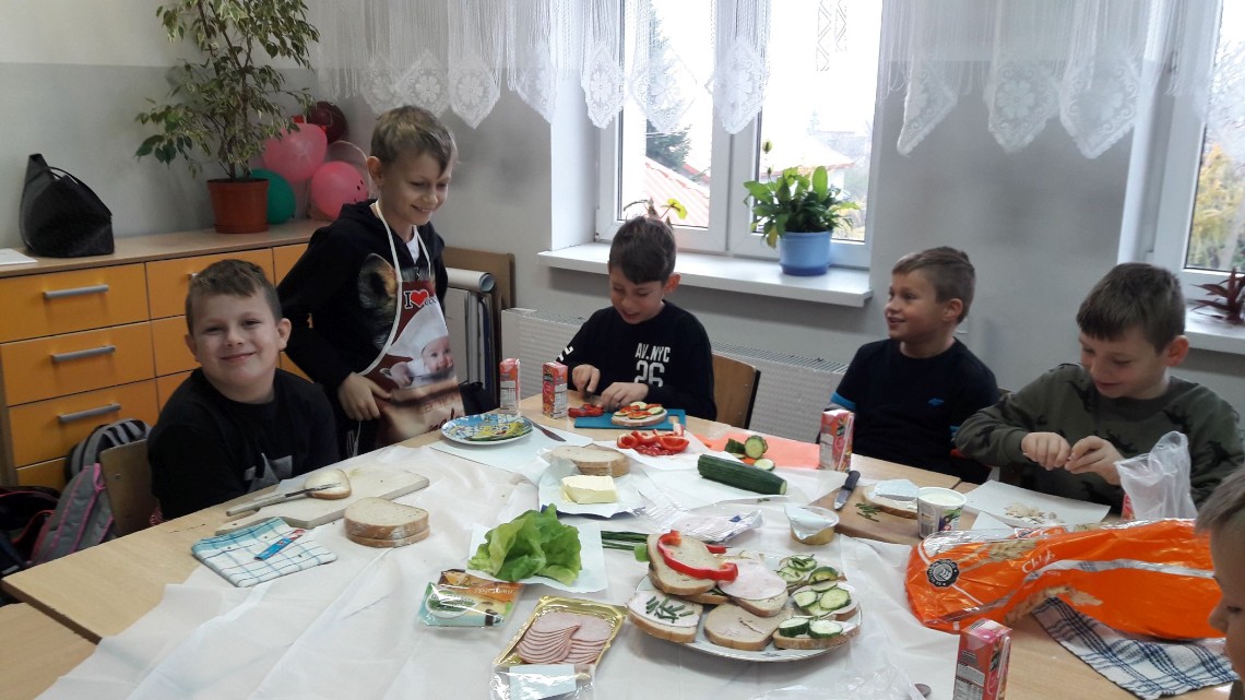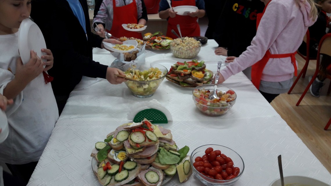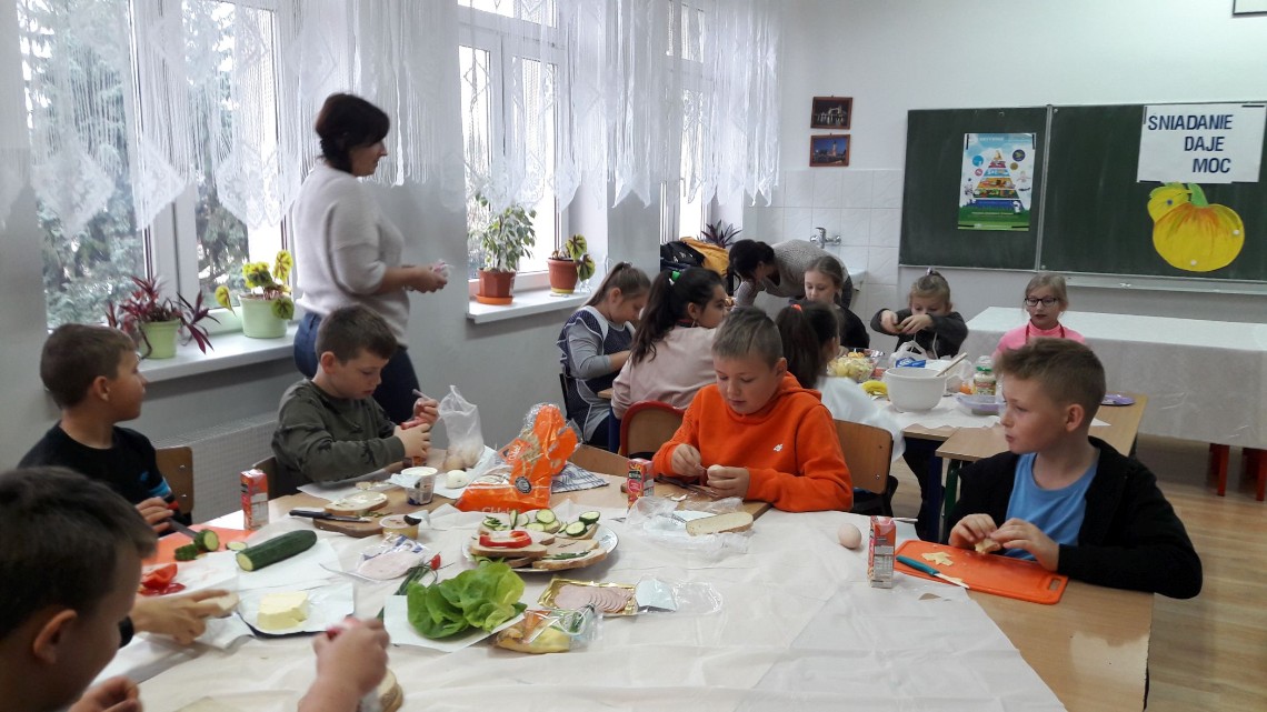 Już kilka lat wspólnie ze szkołami z całej Polski obchodzimy Dzień Śniadanie Daje Moc. Śniadanie to najlepszy start w nowy dzień. Głównym celem tego programu jest: zwiększenie świadomości na temat zdrowego odżywiania i roli śniadania w diecie dziecka.Uczniowie dowiadują się, jak poszczególne składniki znajdujące się w pokarmach wpływają na funkcjonowanie ich organizmów. Zapoznają się również z 12 zasadami zdrowego odżywiania. Dzieci przygotowały urozmaicone potrawy: pomysłowe, kolorowe kanapki, sałatki jarzynowe i owocowe w towarzystwie zdrowych soków.Śniadanie przyrządzone zostało zgodnie z podstawowymi zasadami higieny i spożyte w kulturalny sposób.