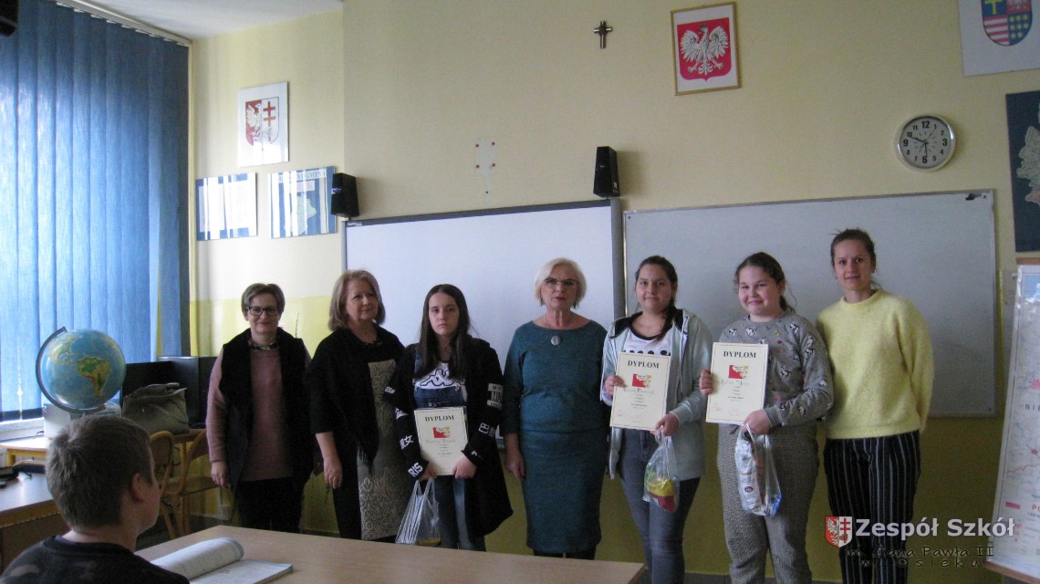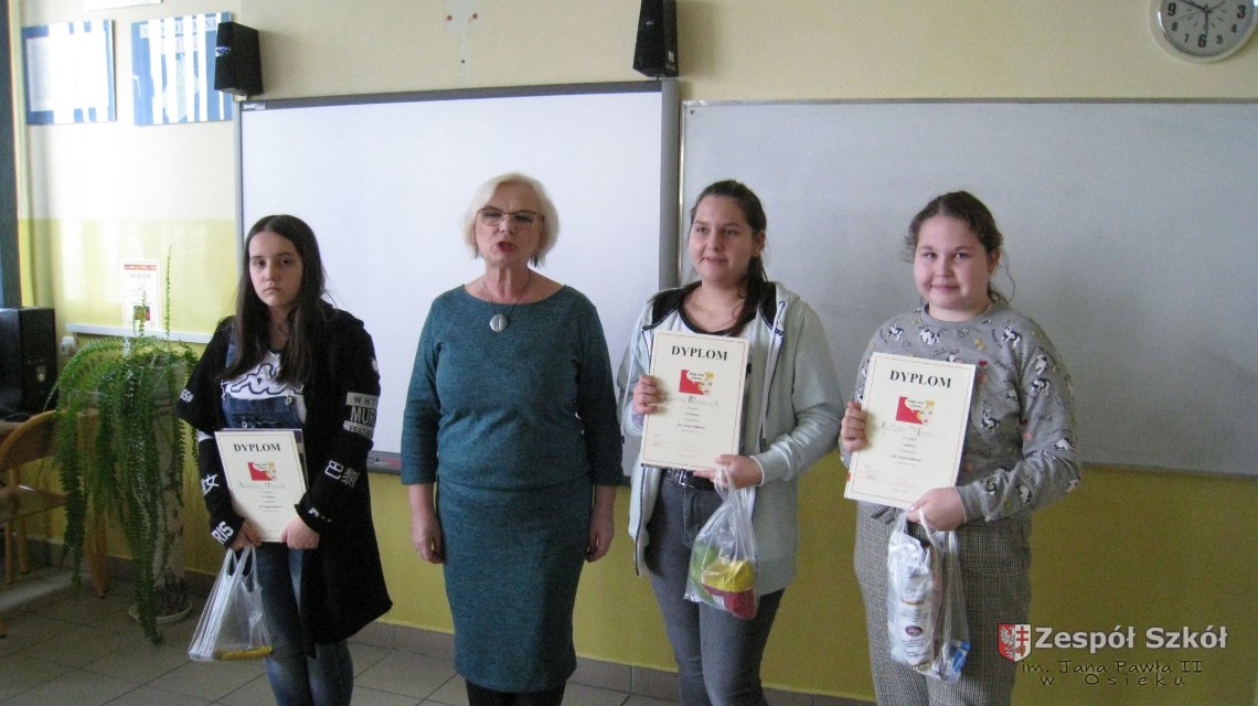 Dyplomy i nagrody rzeczowe zwycięzcom wręczyła dyrektor szkoły - Pani Małgorzata Kunowska.