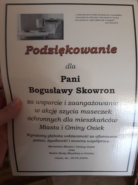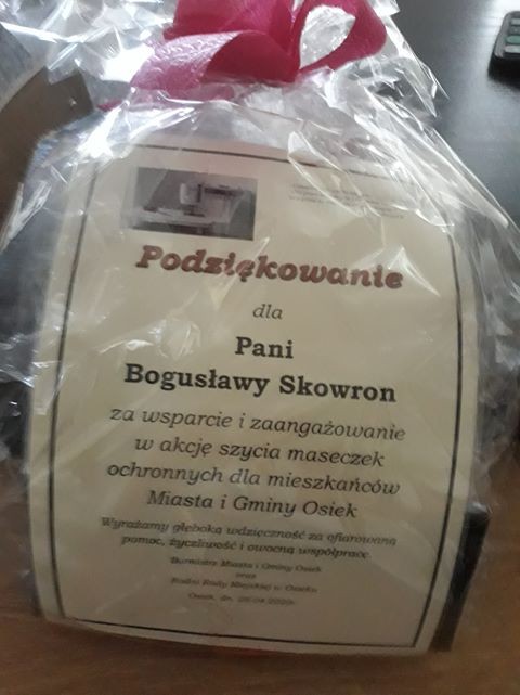 za wsparcie i zaangażowanie w akcję szycia maseczek ochronnych dla mieszkańców Miasta i Gminy Osiek