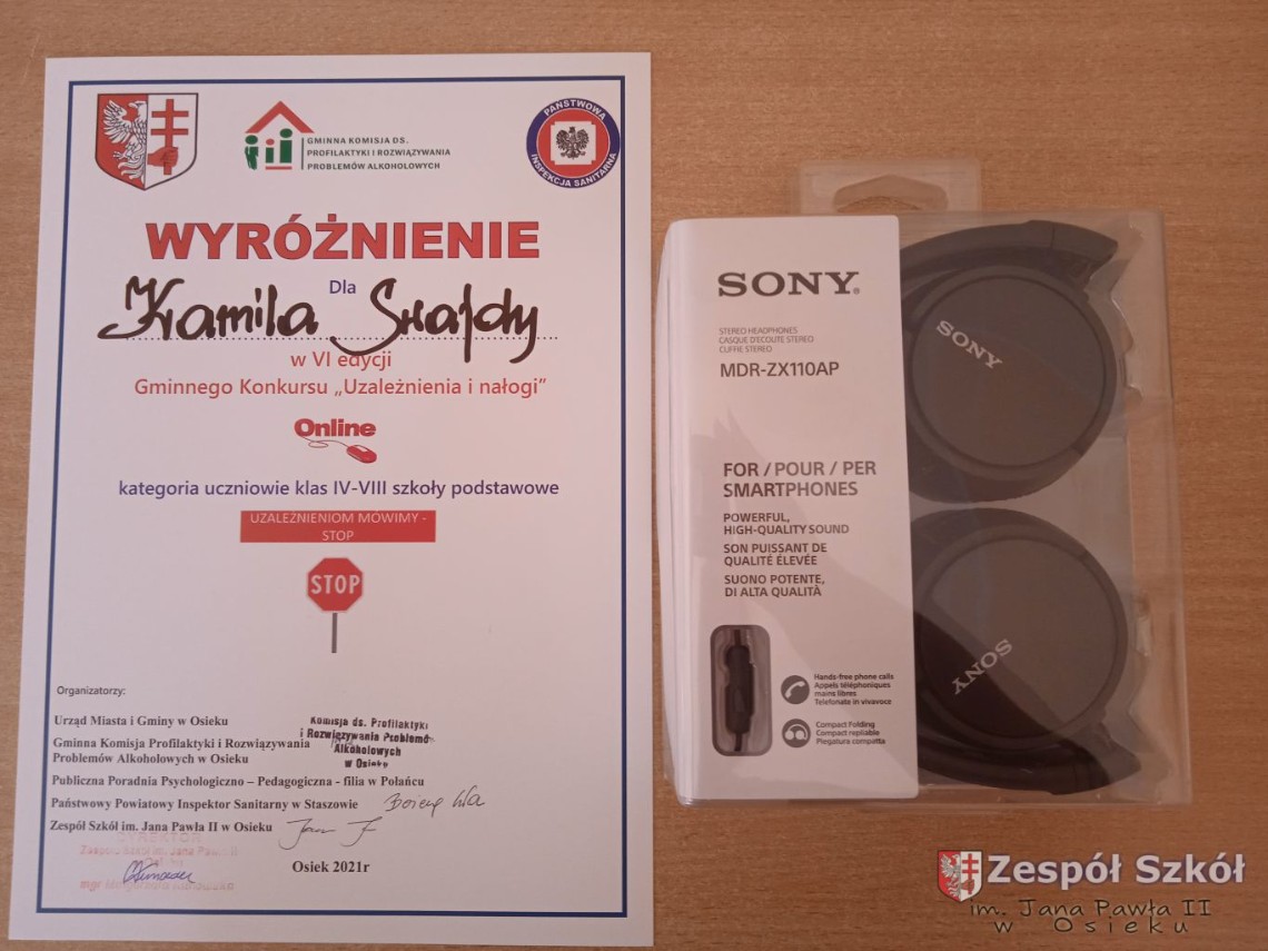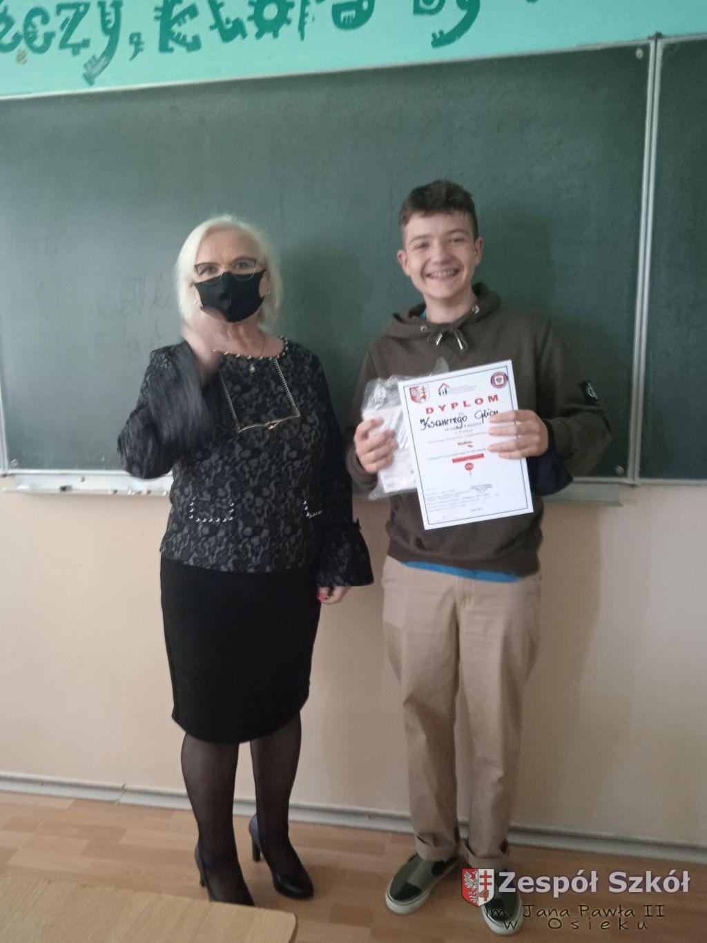 17 maja 2021 r. zostały wręczone dyplomy i nagrody uczestnikom VI edycji Gminnego Konkursu „Uzależnienia i nałogi” w kategorii IV-VIII. Zwycięzcom z naszej szkoły z klas VII wręczono nagrody osobiście (Ksawery Glica z klasy VIIc/ Aleksandra Górska z klasy VIIa/ Kamil Swajda z klasy VIa/, natomiast pozostałym ze szkół ościennych przesłano do wręczenia. Dyplomy i nagrody sprawiły uczniom wiele radości.
