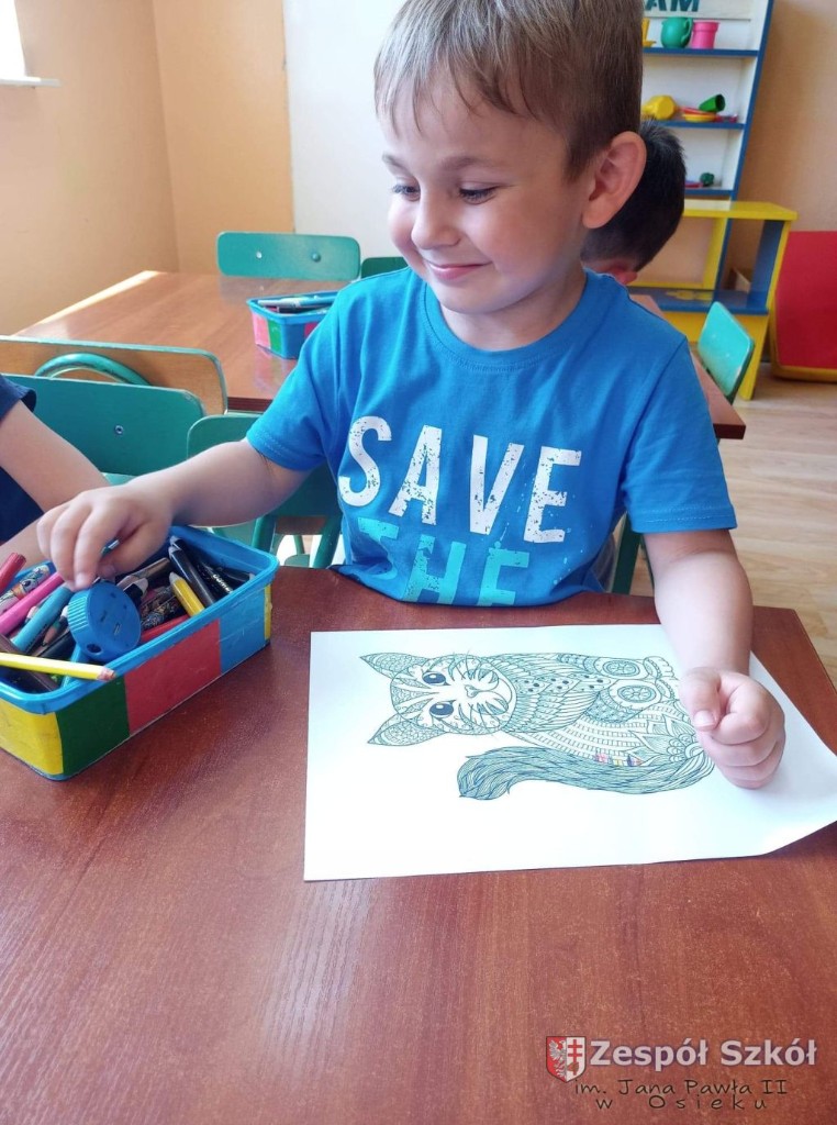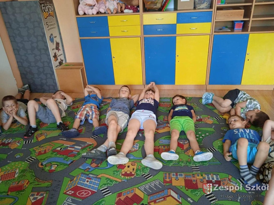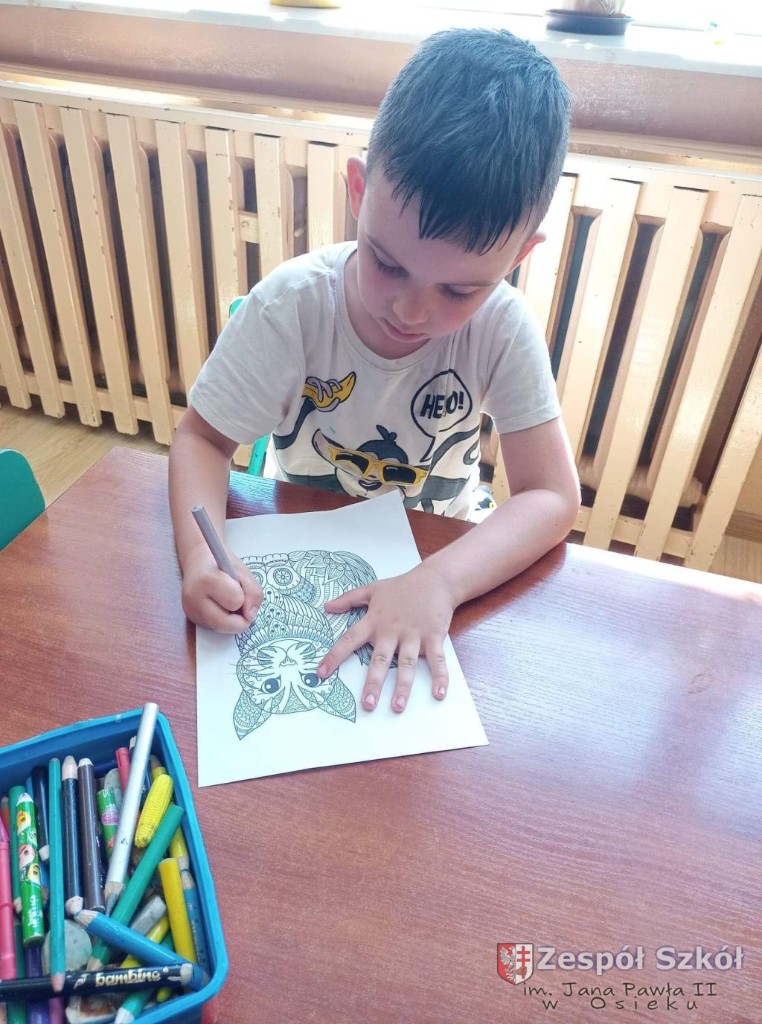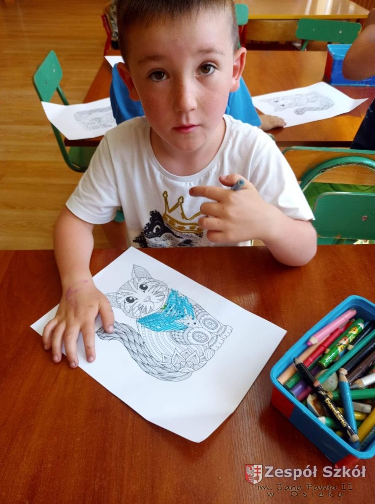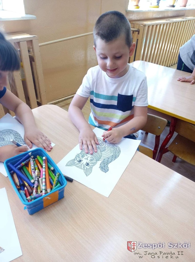W dniu 10.06.2021 roku w Publicznym Przedszkolu w Zespole Szkól im. Jana Pawła II w Osieku odbyły się kolejne profilaktyczne zajęcia logopedyczne. Tym razem były to ćwiczenia i zabawy relaksacyjne. Są one wykorzystywane w terapii logopedycznej w celu zredukowania nadmiernego napięcia i stresu. Najpierw dzieci wysłuchały bajki relaksacyjnej pt: ,,Kotek", podczas której wykonywały szereg ćwiczeń relaksacyjnych. Następnie przy dźwiękach muzyki relaksacyjnej wykonywały ćwiczenia manualne w postaci kolorowanki relaksacyjnej.