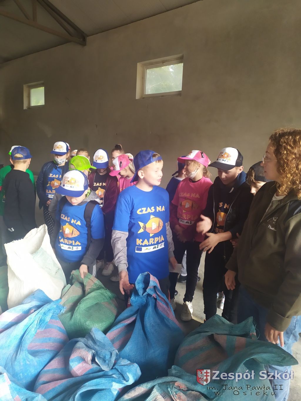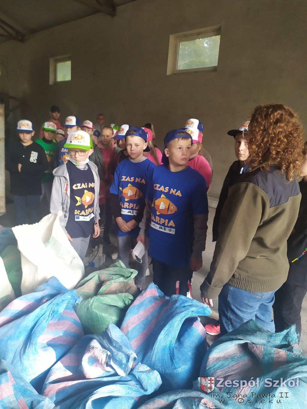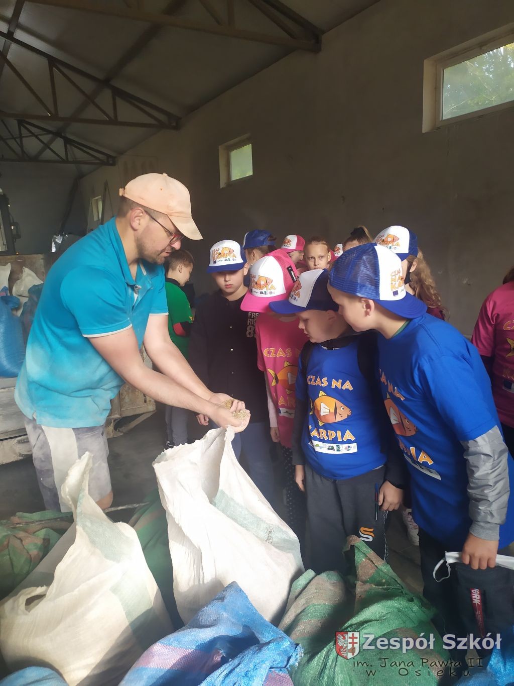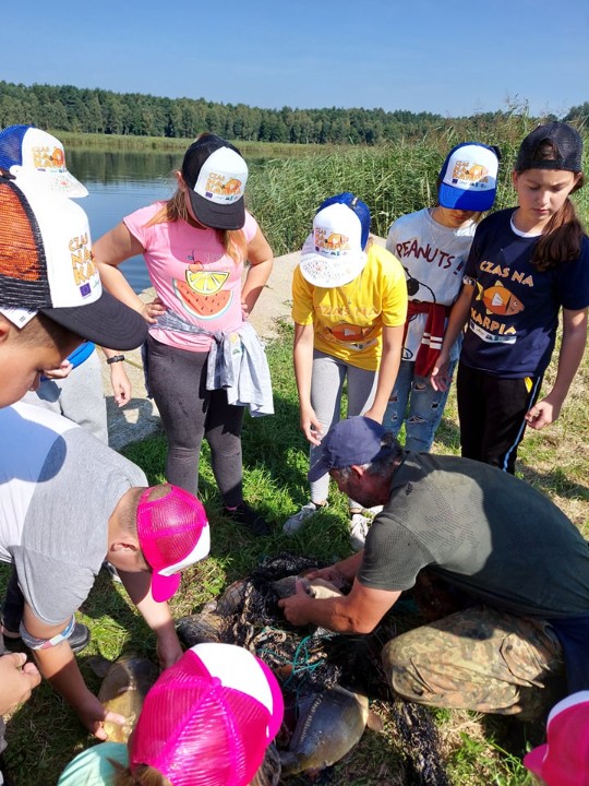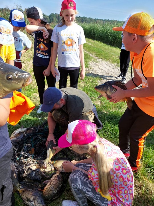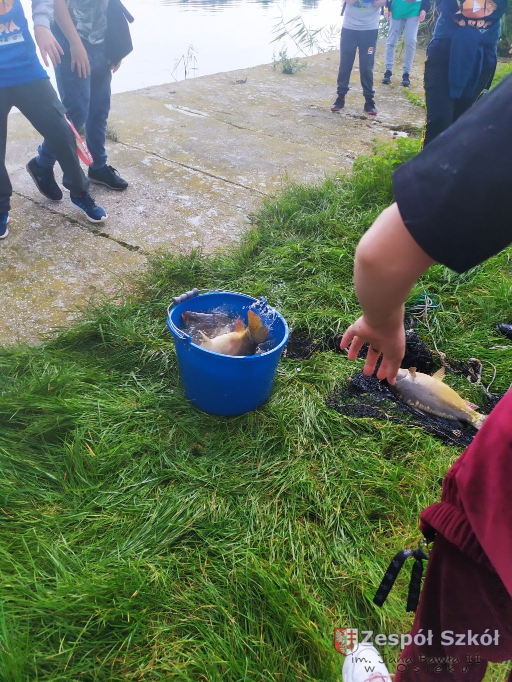 Pani Ania właścicielka gospodarstwa rybackiego w ciekawy sposób opowiadała o rodzinnej, wielopokoleniowej tradycji hodowli karpia. Przekazała również najważniejsze informacje dotyczące życia ryb. Dzieci miały możliwość zobaczyć, w jaki sposób odławia się karpie i jak wyglądają w różnych okresach ich życia. Zajęcia terenowe w kompleksie stawowym dały uczniom możliwość podziwiania otaczającego krajobrazu i były żywą lekcją przyrody.