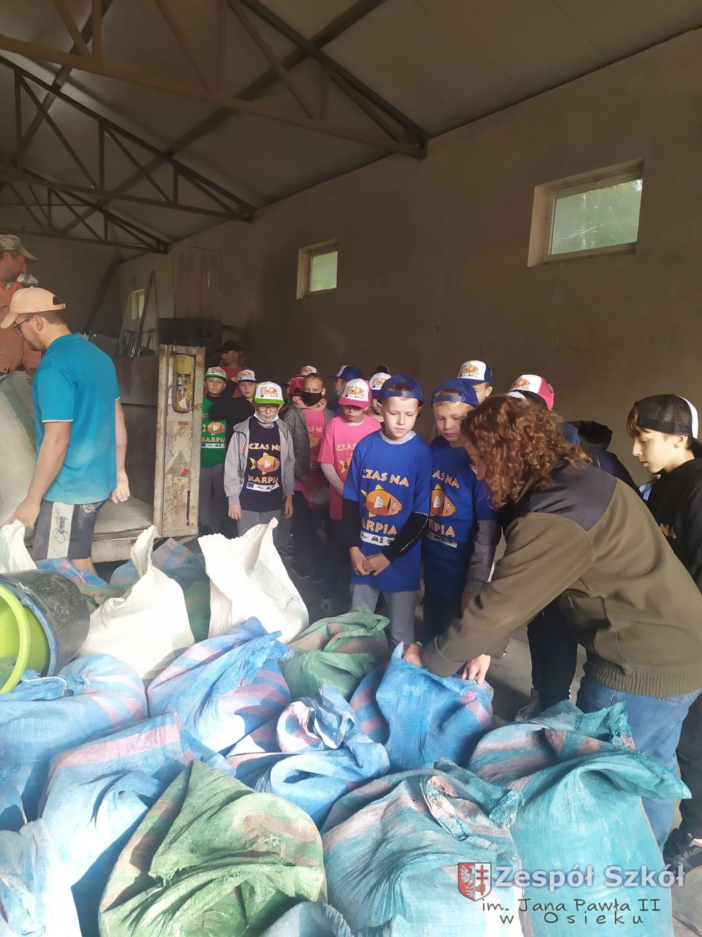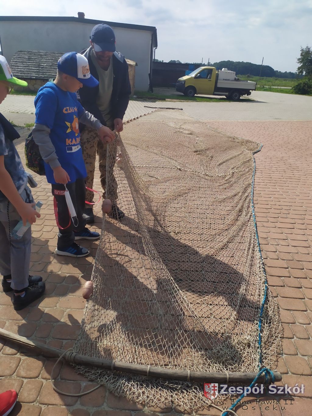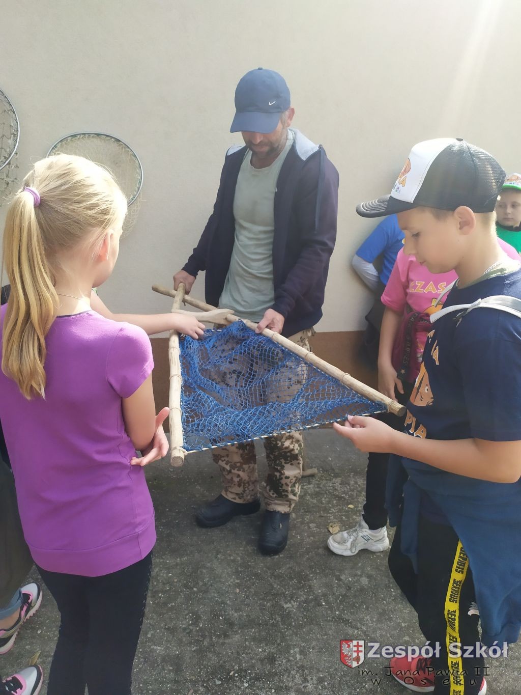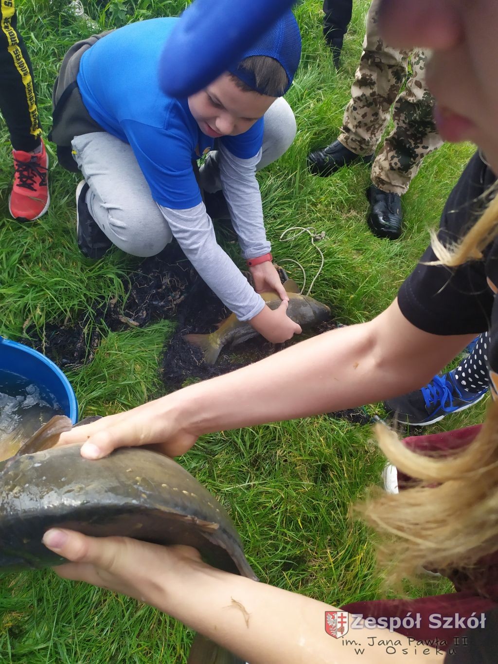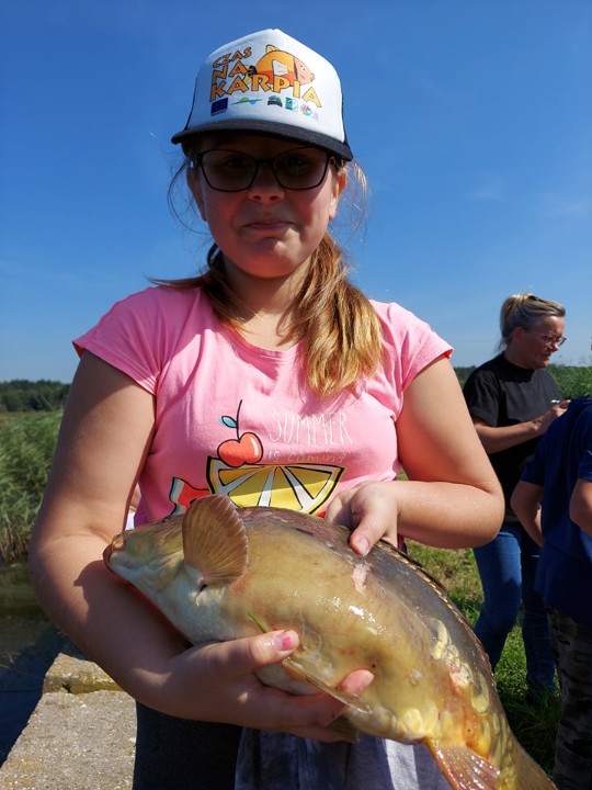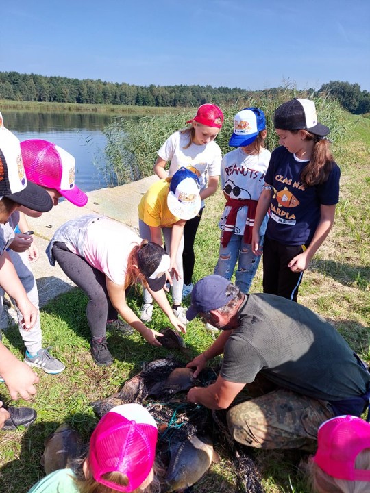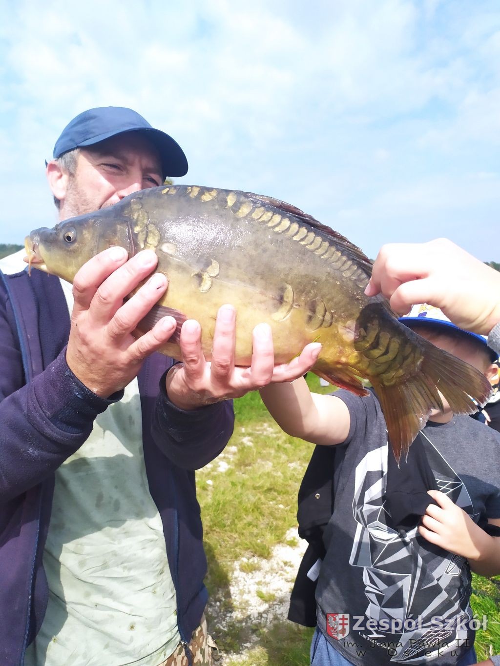 Pani Ania właścicielka gospodarstwa rybackiego w ciekawy sposób opowiadała o rodzinnej, wielopokoleniowej tradycji hodowli karpia. Przekazała również najważniejsze informacje dotyczące życia ryb. Dzieci miały możliwość zobaczyć, w jaki sposób odławia się karpie i jak wyglądają w różnych okresach ich życia. Zajęcia terenowe w kompleksie stawowym dały uczniom możliwość podziwiania otaczającego krajobrazu i były żywą lekcją przyrody.