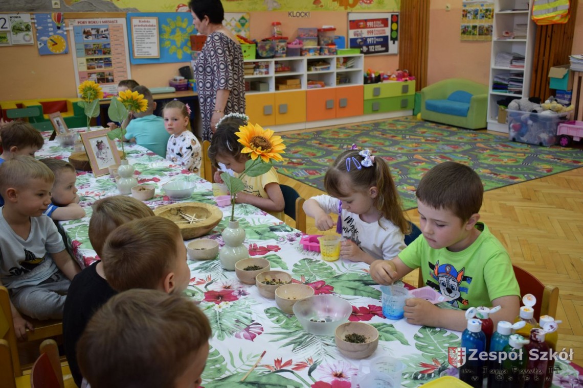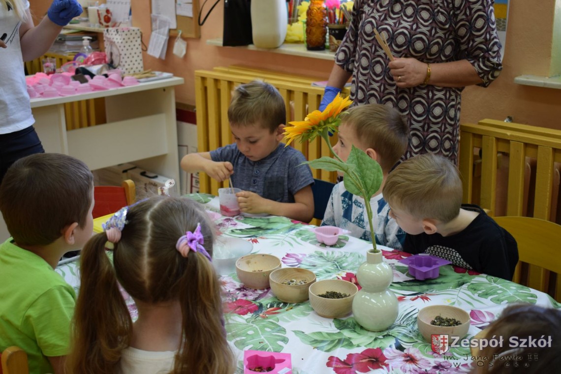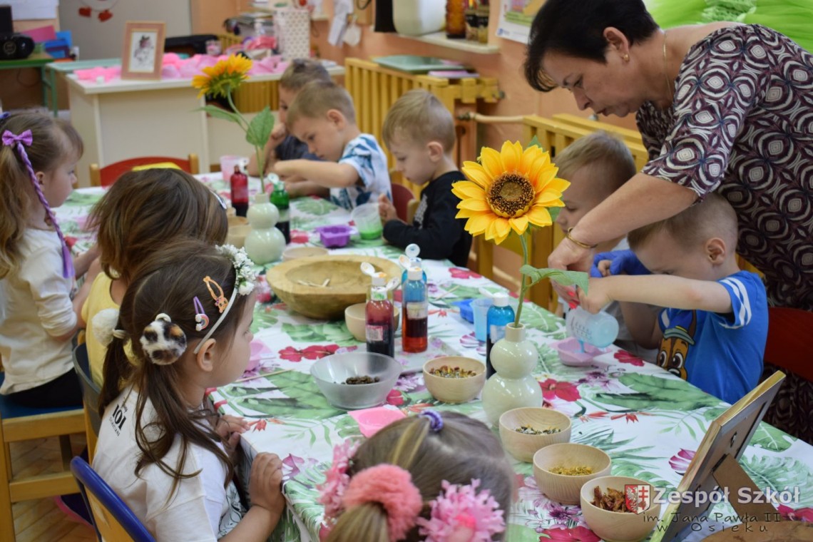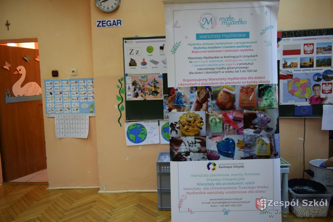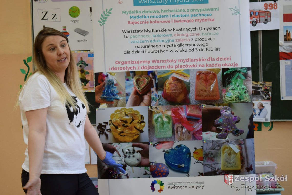 Właścicielka firmy Kwitnące Umysły Pracownia Twórczego Rozwoju i Edukacji przeprowadziła w przedszkolu warsztaty mydlarskie. Mydła, które tworzyły dzieci na warsztatach były doskonałą formą twórczej aktywności. Na zajęciach dzieci same decydowały, co będzie zatopione w ich mydełkach. Rozwijane były w ten sposób u dzieci nie tylko kreatywność i twórcze myślenie, lecz także poczucie odpowiedzialności, umiejętność podejmowania decyzji, poczucie sprawstwa. Dzieci dodawały do mydełek swoje ulubione zapachy.