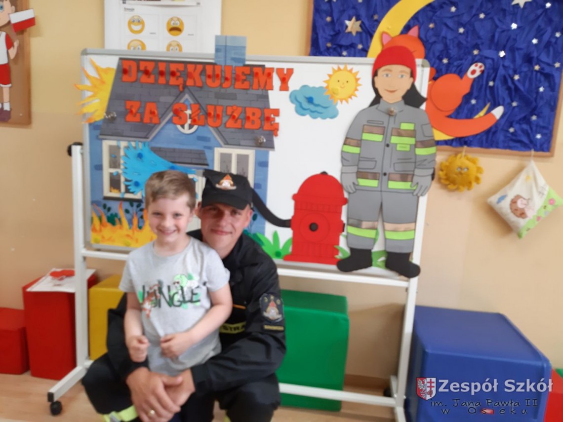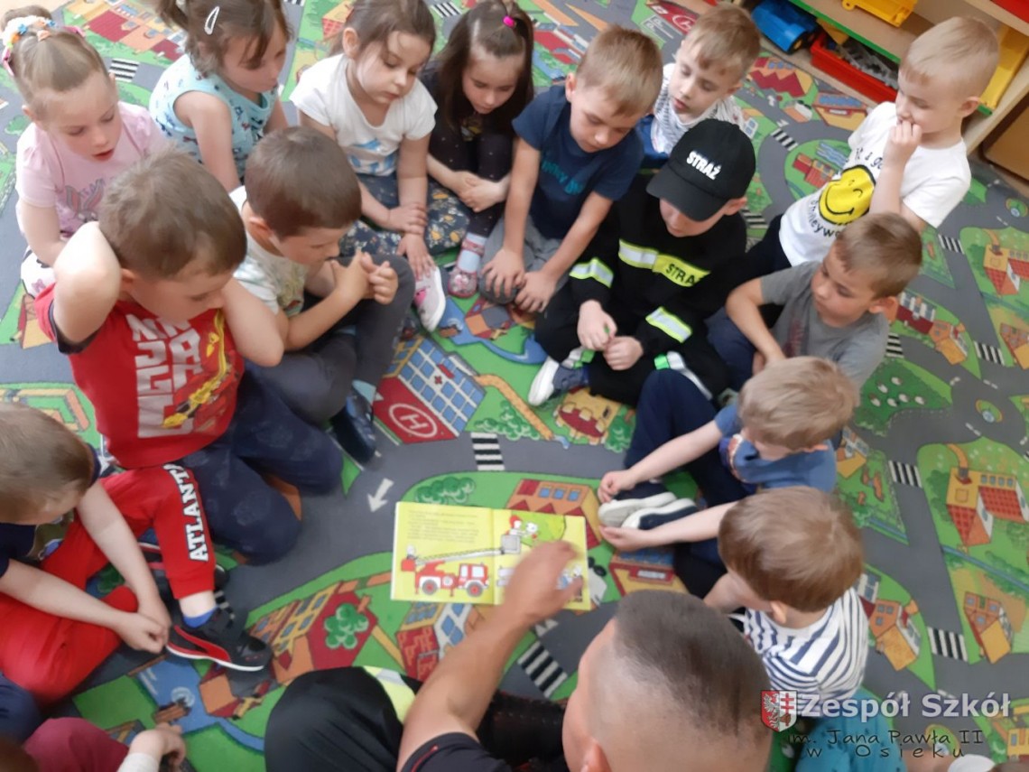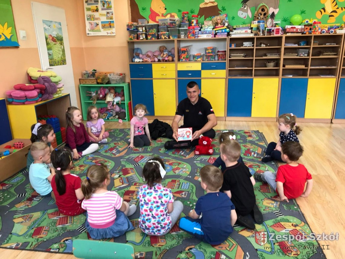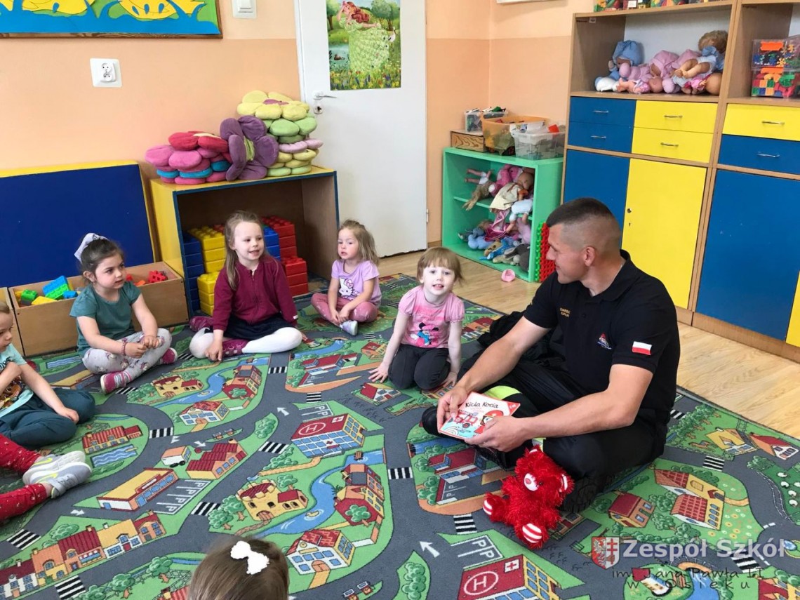 W maju obchodzony jest Dzień Strażaka, w związku z tym do przedszkola zaprosiliśmy tatę Szymona z grupy 4- latków, Pana Dariusza Dziuba, żeby przybliżył nam zawód, który wykonuje. Strażak odwiedził grupę 3- latków, 4- latków, 5- latków i przeczytał dzieciom bajkę pt. ,,Kicia Kocia poznaje strażaka” w ramach projektu edukacyjnego ,, Mały Mis w Świecie Wielkiej Literatury”.