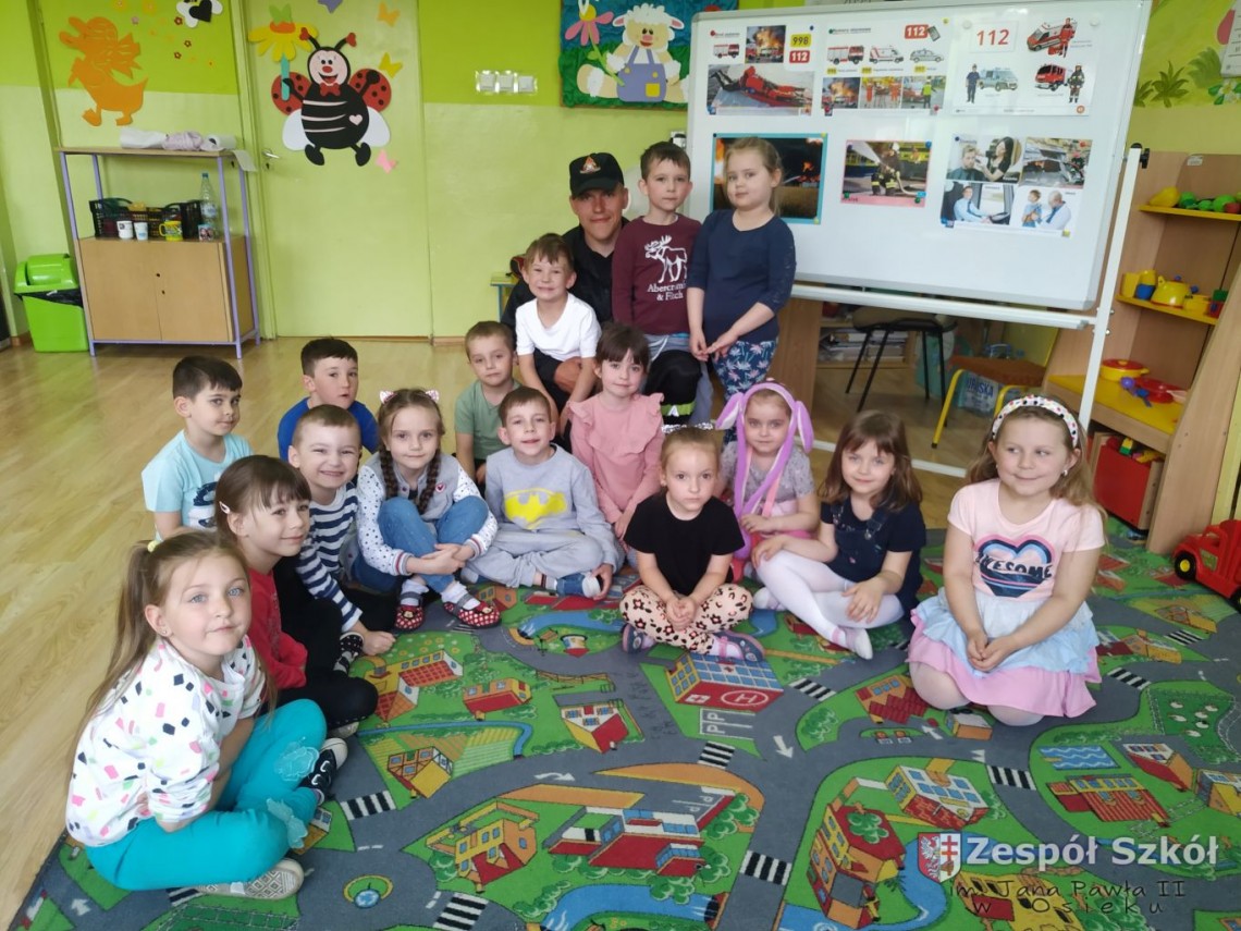 Wizyta strażaka w naszym przedszkolu wzbudziła ogromne zainteresowanie dzieci. W trakcie spotkania strażak zaznajomił dzieci z ciekawostkami związanymi z jego pracą zawodową, przestrzeganiem zakazów, zachowaniem bezpieczeństwa w czasie: pożaru, burzy oraz wypadku, dzieci dowiedziały się w jakich okolicznościach można wzywać straż pożarną, że strażacy nie tylko gaszą pożary, ale również są wzywani do wypadków samochodowych. Dzięki takim spotkaniom dzieci: poznają ciężką i odpowiedzialną pracę strażaka; wiedzą jak dbać o własne i innych bezpieczeństwo; szanują trudną pracę strażaka; kształtują odpowiednie zachowania w trudnych sytuacjach; zaznajamiają się z sytuacjami, w których powinny korzystać z numerów alarmowych. Dziękujemy serdecznie w imieniu przedszkolaków.