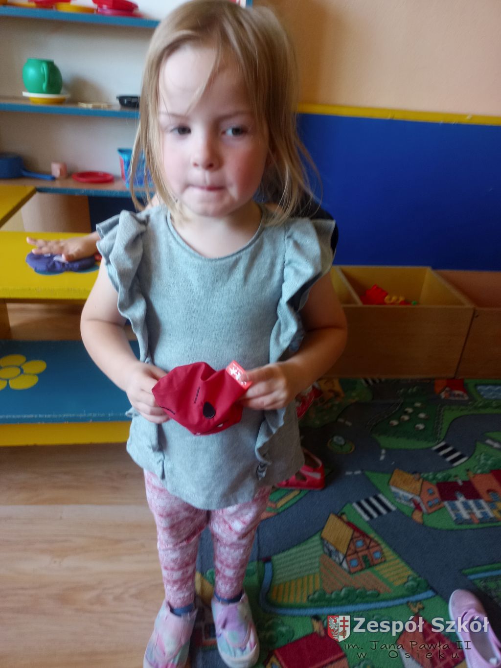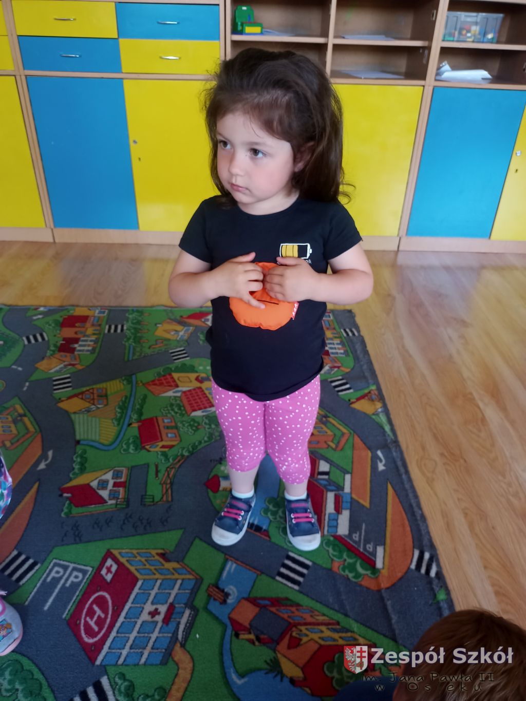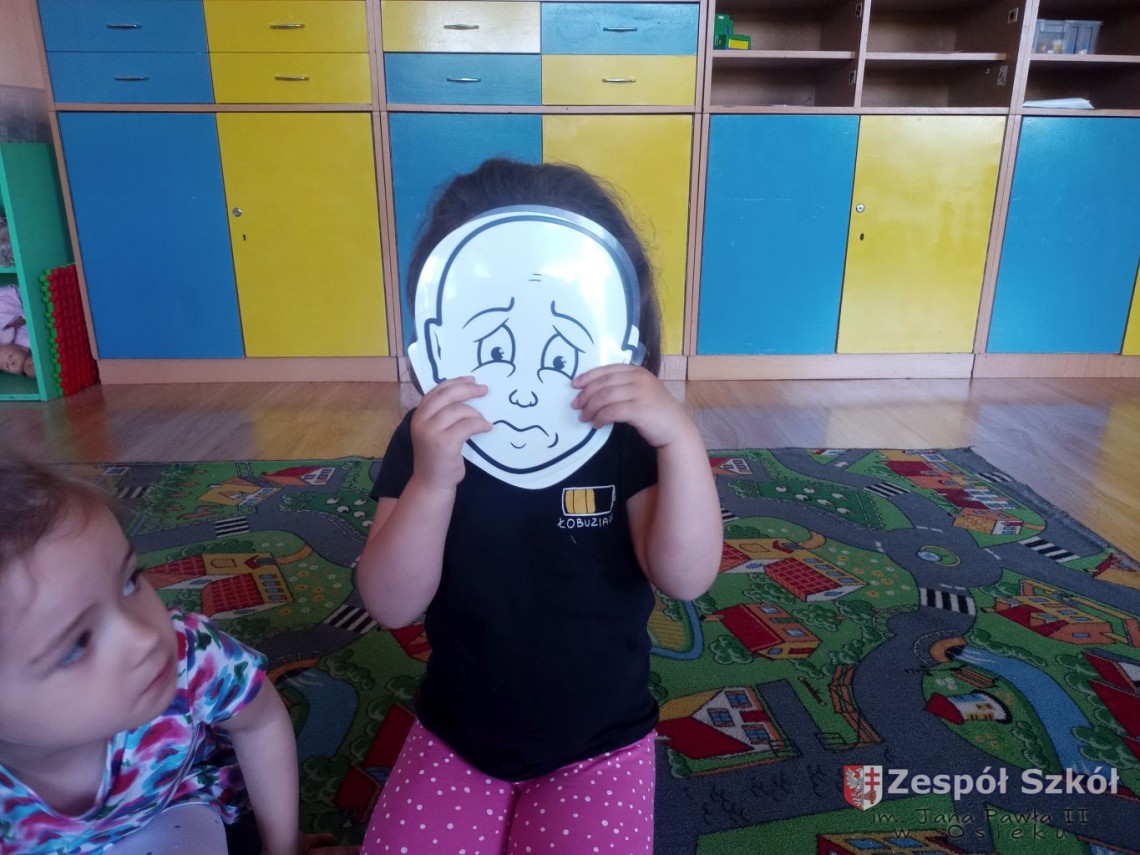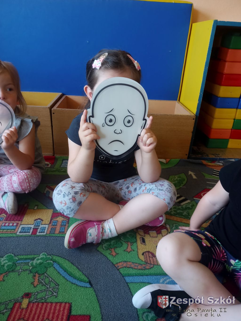 pt: ,,Złośnik",  uczestniczyły w zabawie pantonomicznej z piłeczkami przedstawiającymi różne emocje, w zabawach relaksujących ,,Tylko spokojnie- zabawy regulujące emocje”,