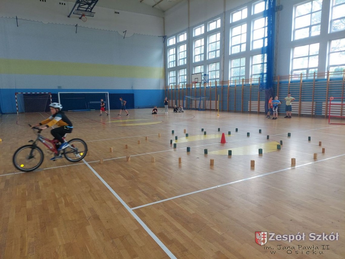 Egzamin praktyczny odbył się na hali sportowej. Polegał na ocenie kierującego rowerem pod względem: