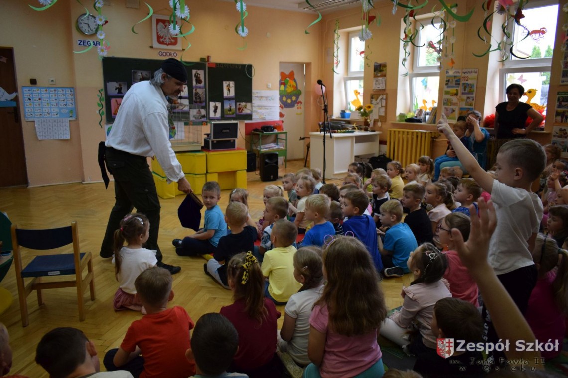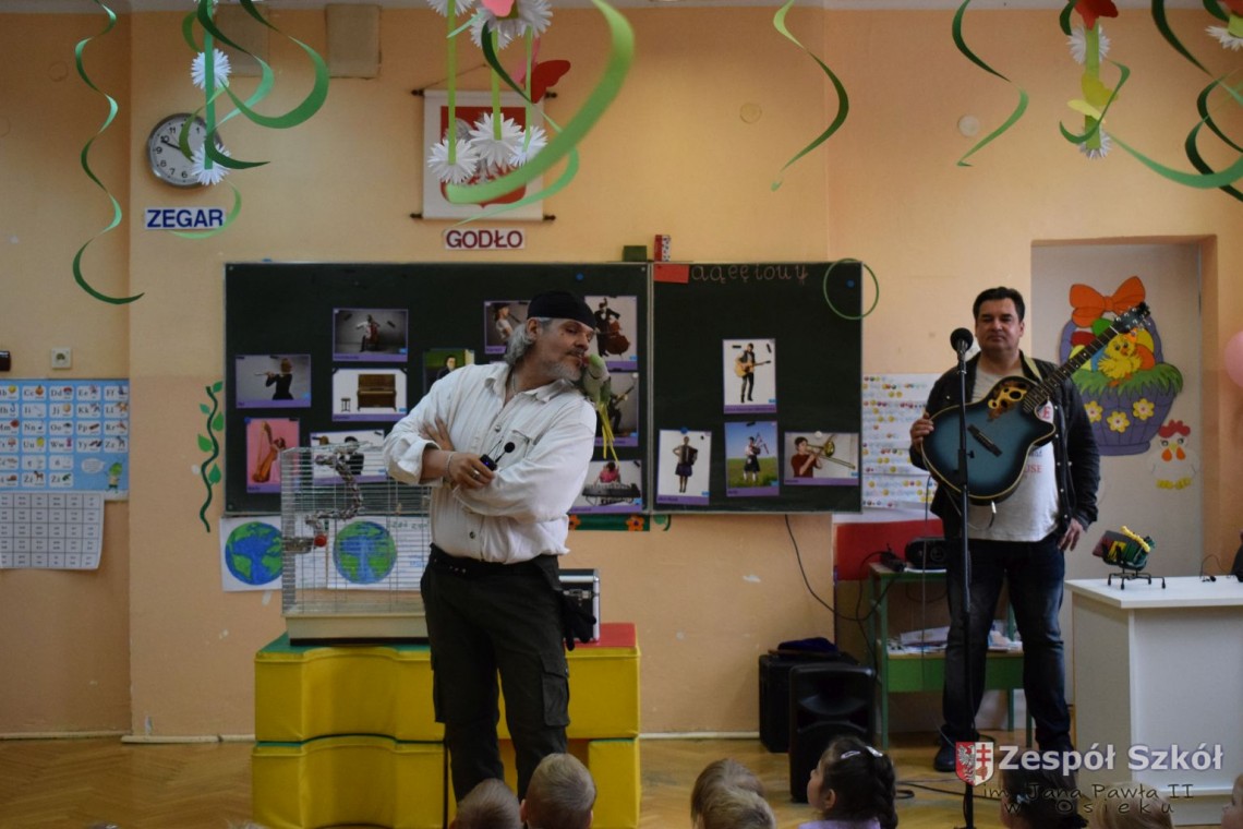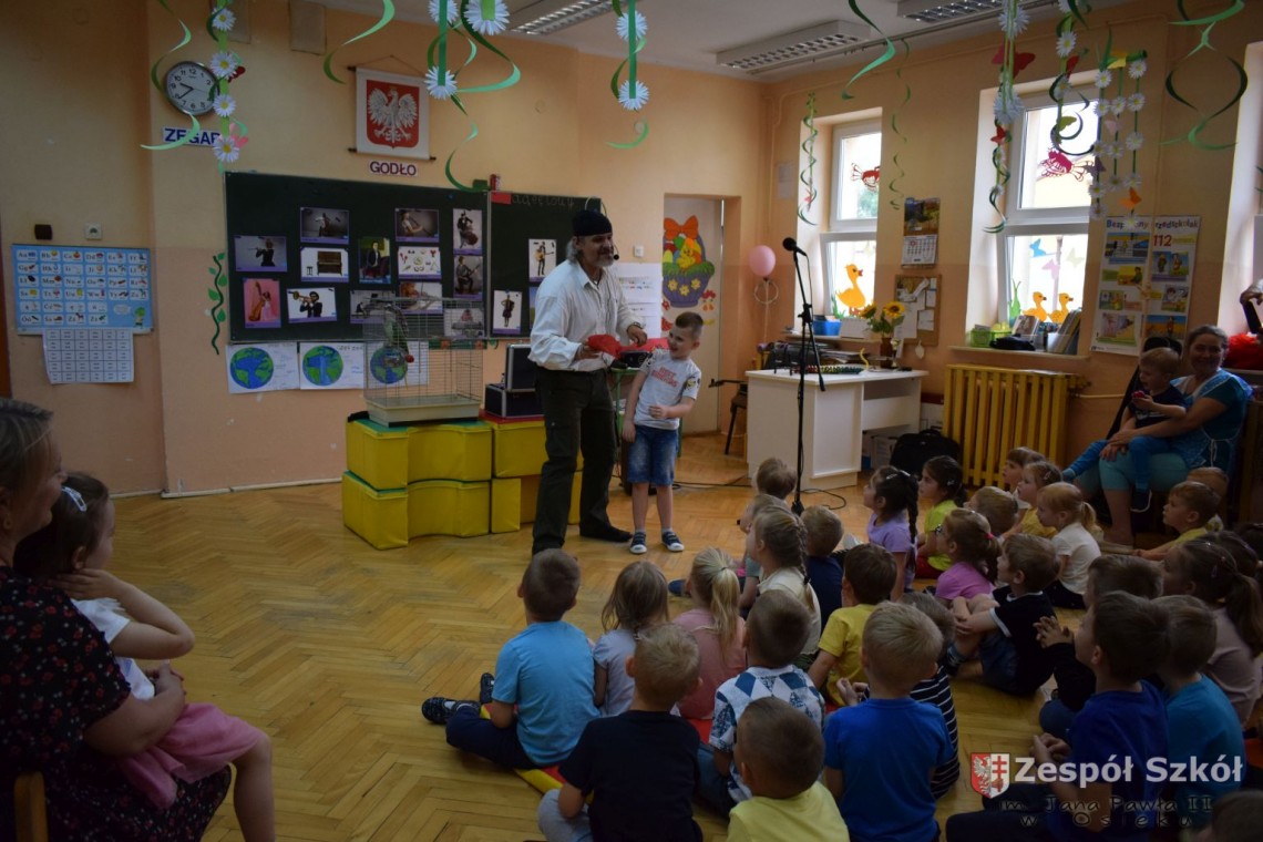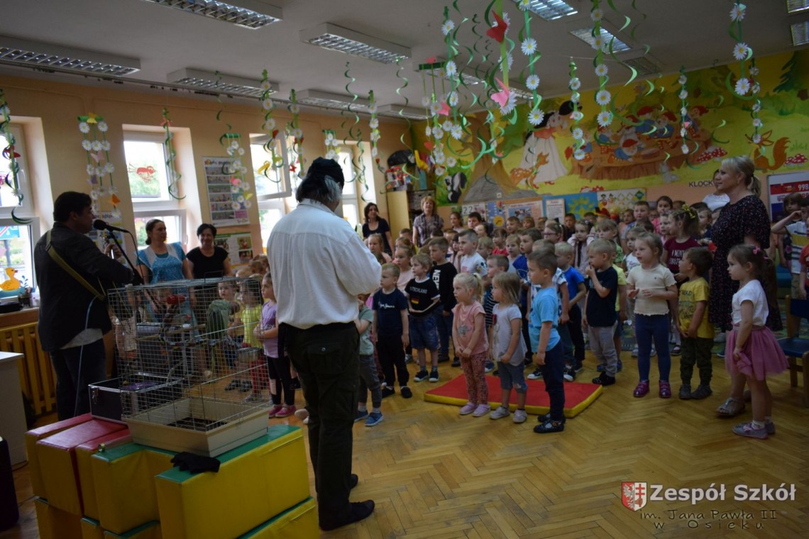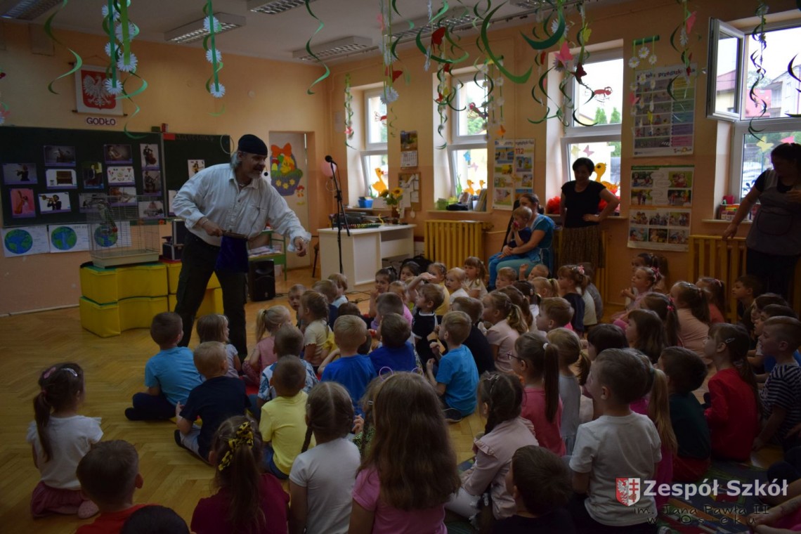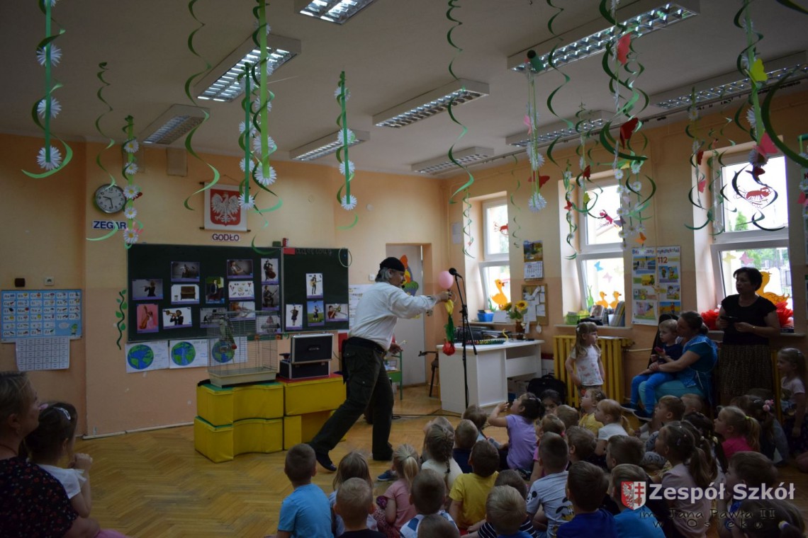 Pod takim tytułem odbyło się spotkanie artystów z przedszkolakami. Podczas spotkania, zaprezentowano pokaz iluzji wypełniony różnymi sztuczkami w wykonaniu Artysty Cyrkowego z trzydziestoletnim doświadczeniem oraz pokaz umiejętności "wytresowanej" papugi. Wszystko to z oprawą muzyczną w wykonaniu Muzyka, Animatora i Pedagoga z wieloletnim doświadczeniem scenicznym, który prezentował i zachęcał do śpiewania dzieci piosenek o tematyce ekologicznej. Dzieci miały możliwość poznać różne instrumenty muzyczne, którymi posługiwali się artyści. Spotkanie przebiegło w radosnej atmosferze.