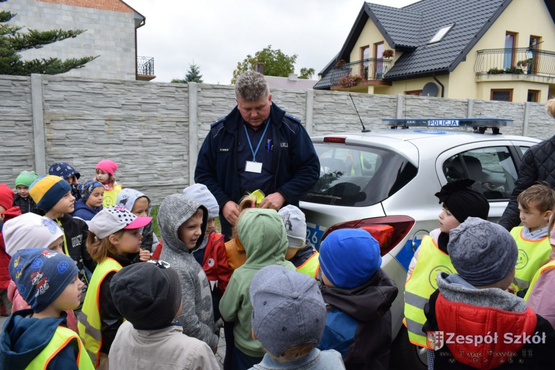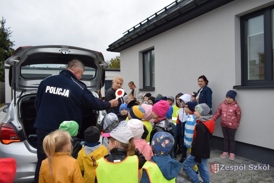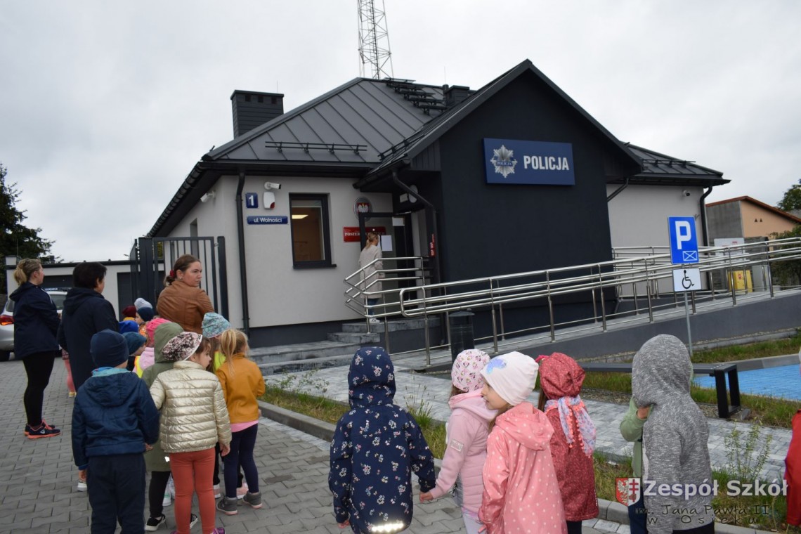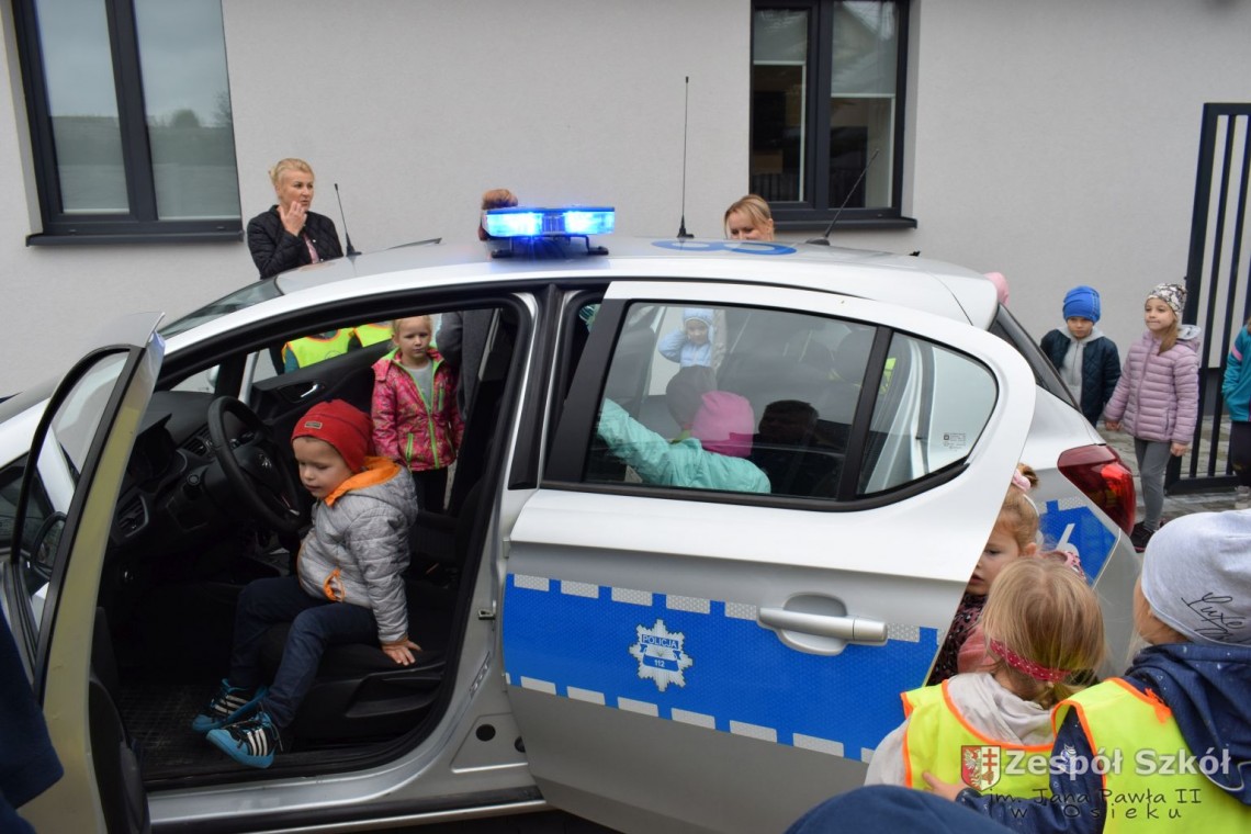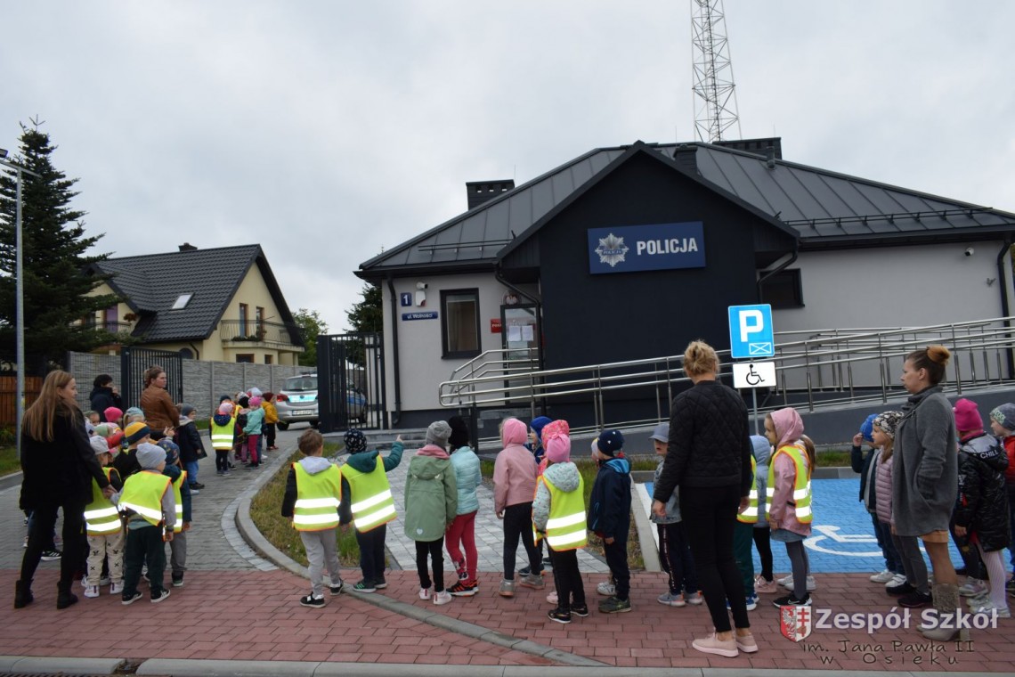 22 września nasze przedszkolaki odwiedziły Posterunek Policji w Osieku. Celem wycieczki było poznanie pracy policjanta, zwiedzenie budynku posterunku oraz utrwalanie zasad bezpiecznych zachowań na drodze. Pan policjant przybliżył dzieciom pracę policjanta, przypomniał numery alarmowe, objaśniał zasady dotyczące bezpiecznego poruszania się po ulicach. Obejrzeliśmy policyjny pojazd, oraz sprzęt, który jest wykorzystywany w pracy. Sprawdzaliśmy ilu przedszkolaków zmieści się w radiowozie, testowaliśmy sygnały radiowozu. Mogliśmy również zwiedzić posterunek wewnątrz. Wycieczka była bardzo atrakcyjna, wywołała wiele wrażeń i z pewnością wybierzemy się tam za rok. DZIĘKUJEMY!