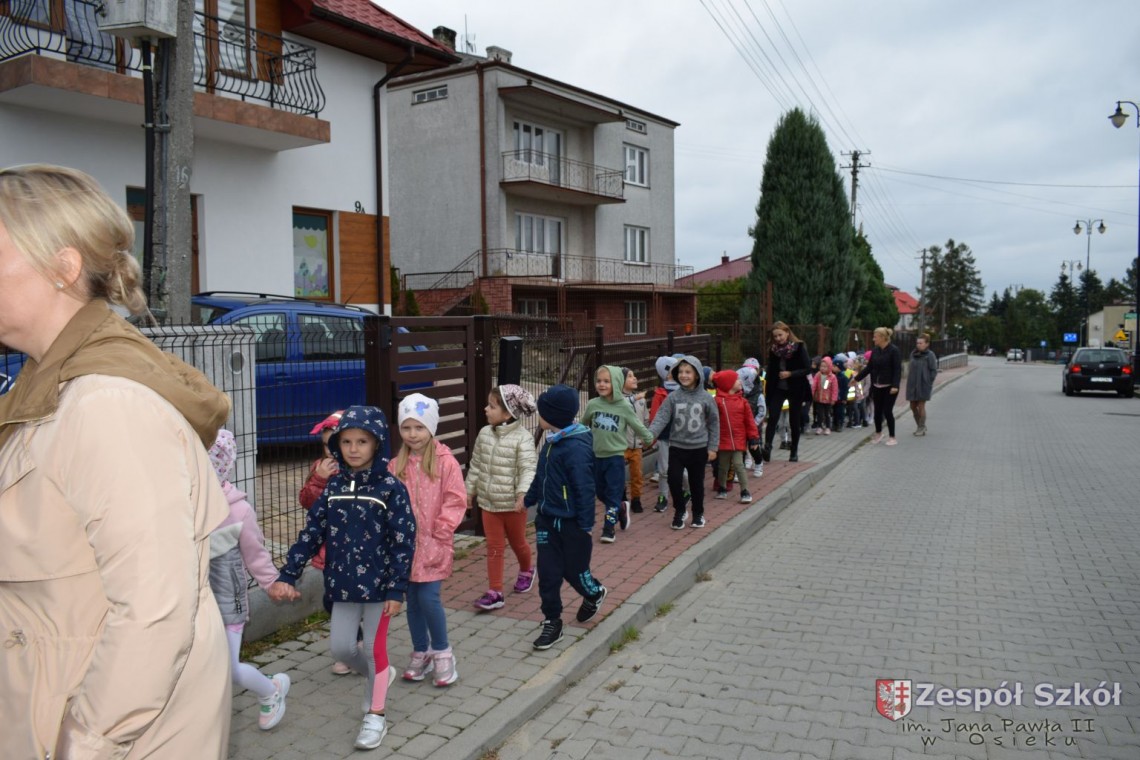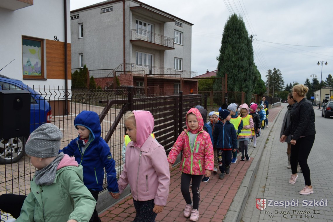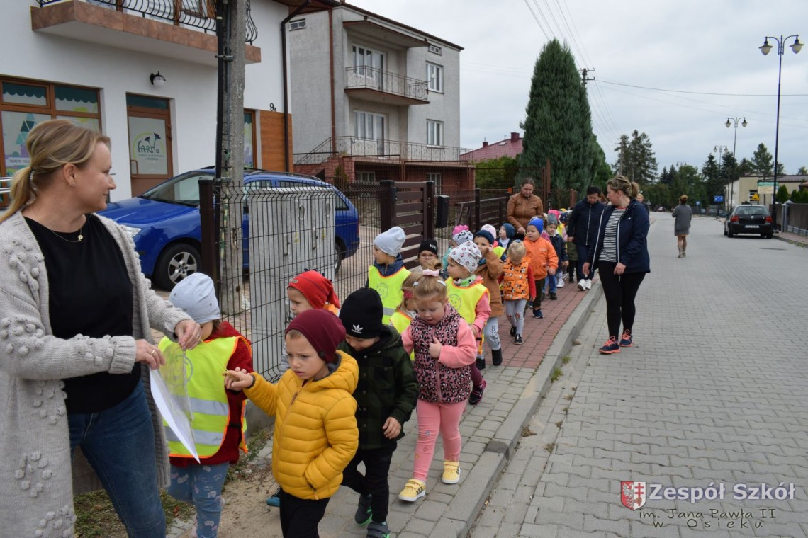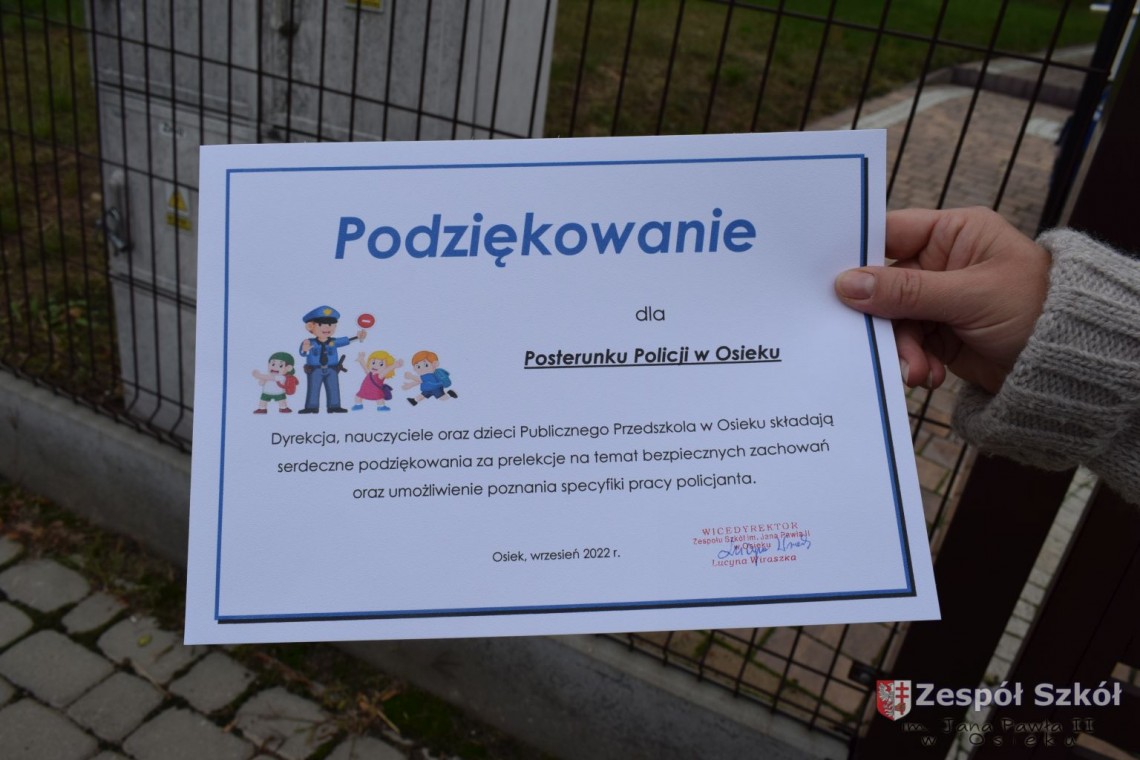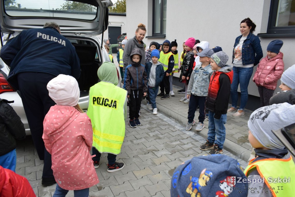 22 września nasze przedszkolaki odwiedziły Posterunek Policji w Osieku. Celem wycieczki było poznanie pracy policjanta, zwiedzenie budynku posterunku oraz utrwalanie zasad bezpiecznych zachowań na drodze. Pan policjant przybliżył dzieciom pracę policjanta, przypomniał numery alarmowe, objaśniał zasady dotyczące bezpiecznego poruszania się po ulicach. Obejrzeliśmy policyjny pojazd, oraz sprzęt, który jest wykorzystywany w pracy. Sprawdzaliśmy ilu przedszkolaków zmieści się w radiowozie, testowaliśmy sygnały radiowozu. Mogliśmy również zwiedzić posterunek wewnątrz. Wycieczka była bardzo atrakcyjna, wywołała wiele wrażeń i z pewnością wybierzemy się tam za rok. DZIĘKUJEMY!
