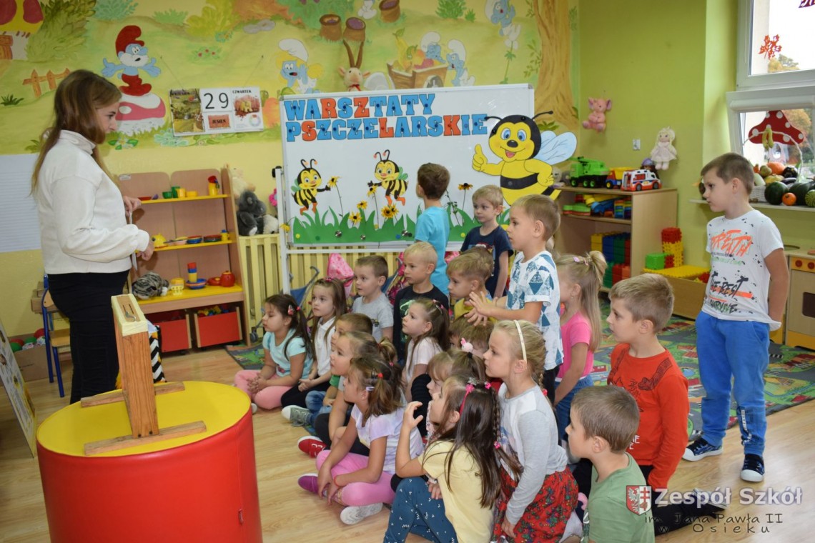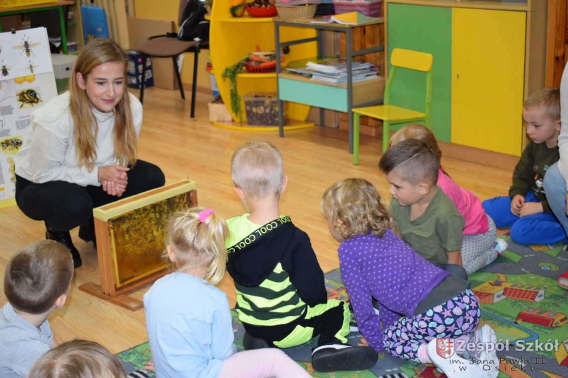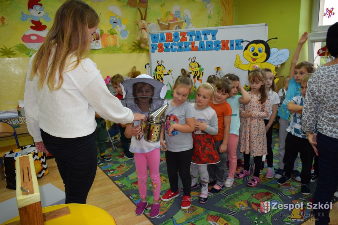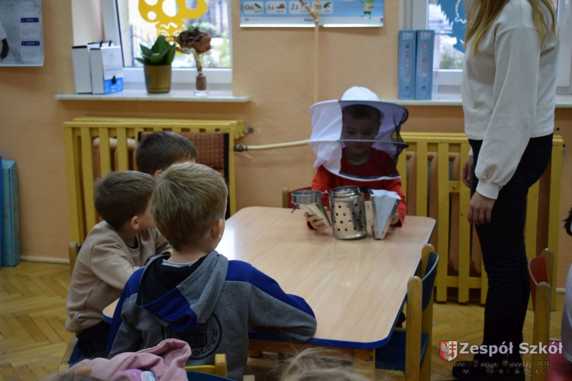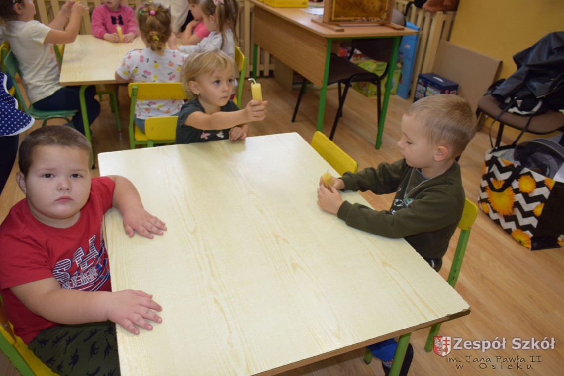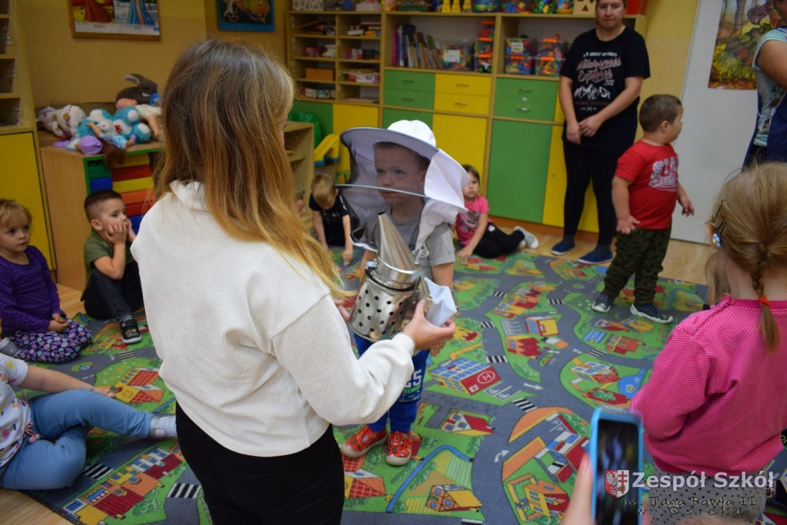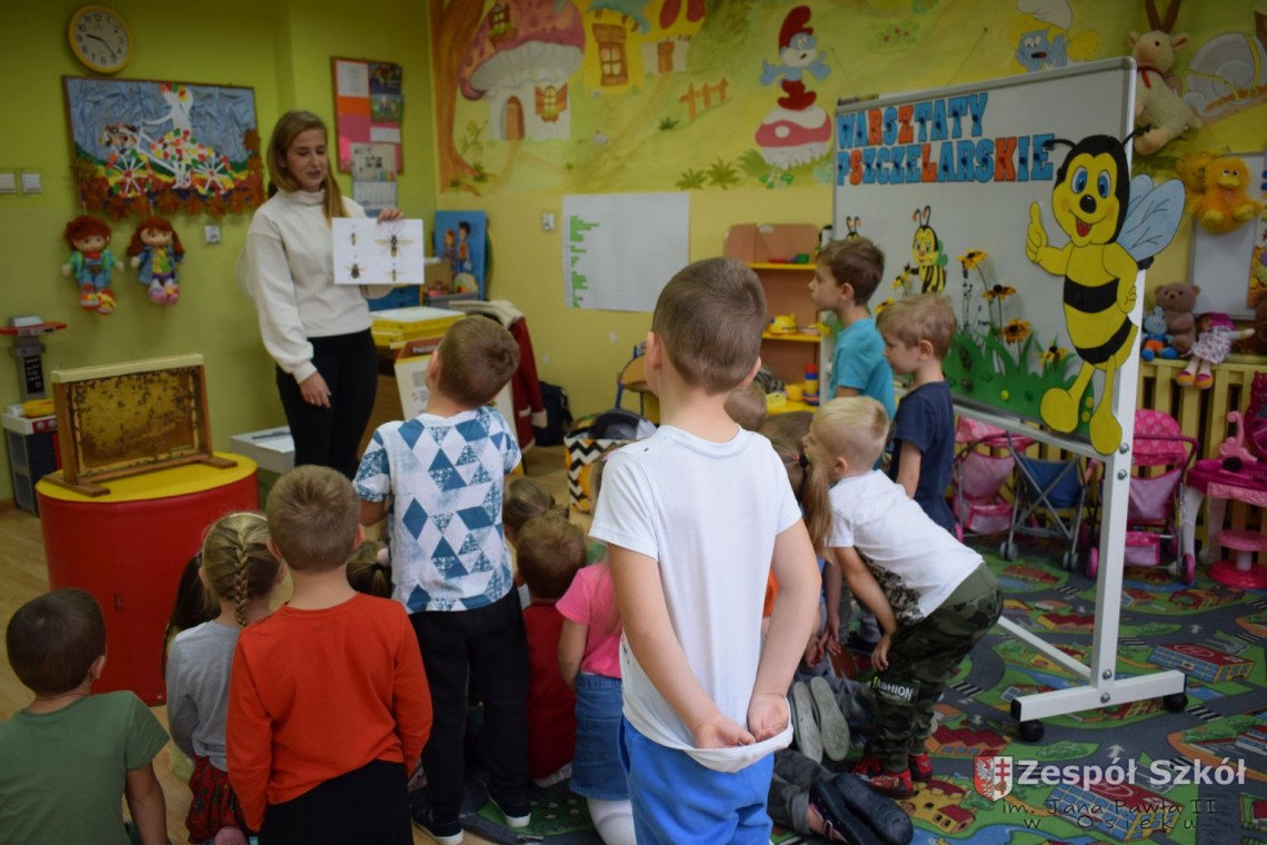 29 września dzieci uczestniczyły w warsztatach pszczelarskich prowadzonym przez Panią Pszczelarz. Zajęcia te miały na celu zapoznanie dzieci z życiem pszczół i ich ogromną rolą jaką pełnią w środowisku naturalnym. Podczas warsztatów przedszkolaki poznały pracę pszczelarza, dowiedziały się jak wybiera się miód z ula i do czego służy taki tajemniczy sprzęt jak podkurzacz. Zaglądały do wnętrza nowoczesnego ula, obserwowały żywe owady zabezpieczone w klateczkach transportowych oraz oglądały obrazy owadów ( pszczołę, osę, trzmiela, szerszenia) w powiększeniu. Dowiedziały się jak wygląda podział ról i organizacja życia w pszczelej rodzinie. Poznały zasady bezpiecznego kontaktu z owadami .Wszystkie dzieci degustowały miód oraz wykonały świece z wosku. Uczyły się wrażliwości i poszanowania dla tych pożytecznych owadów, od których zależy jakość naszego istnienia.