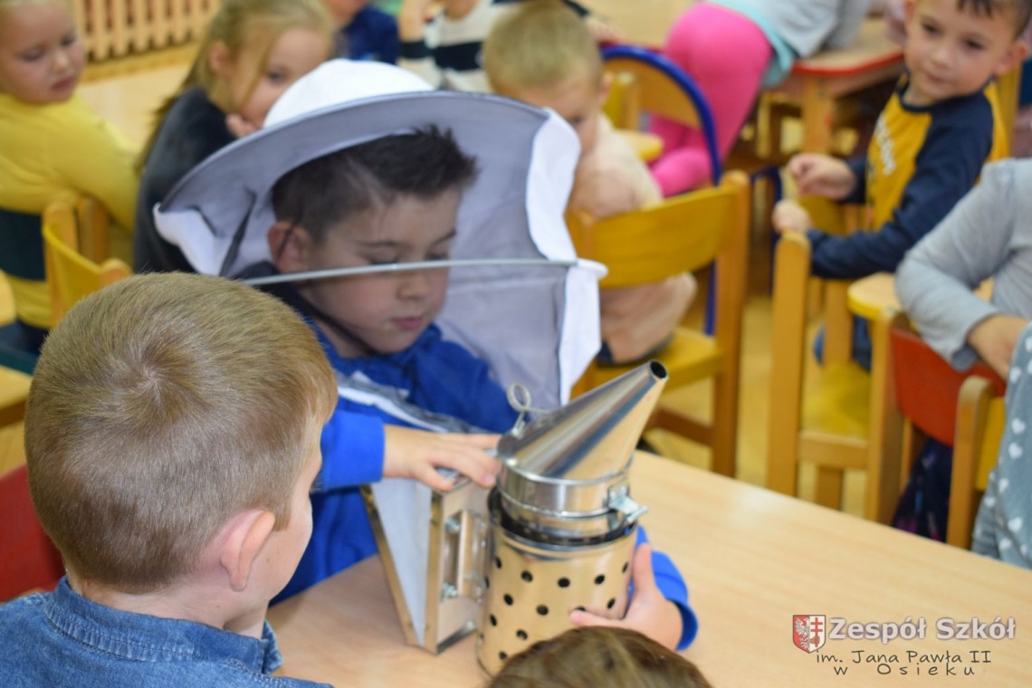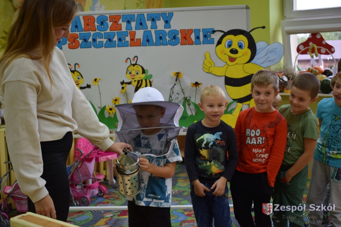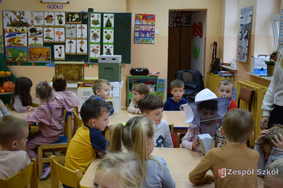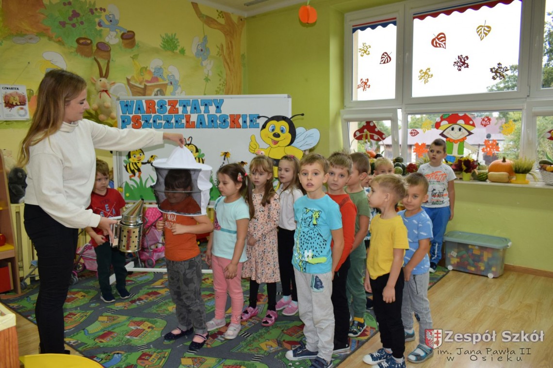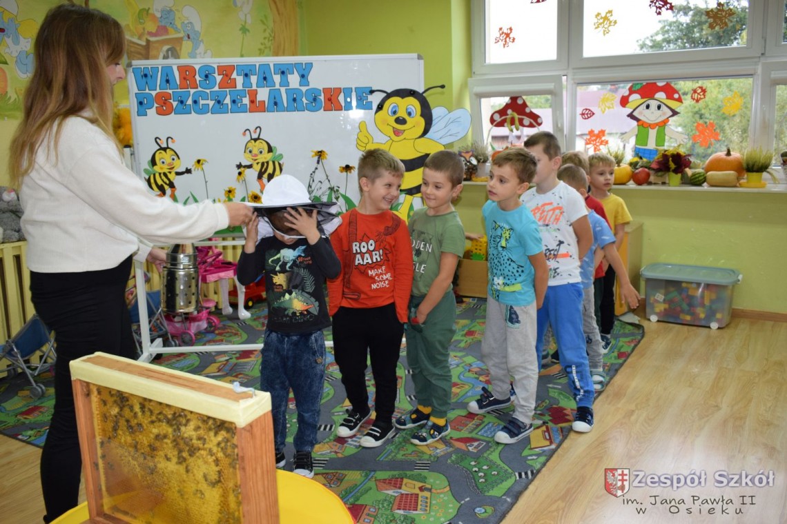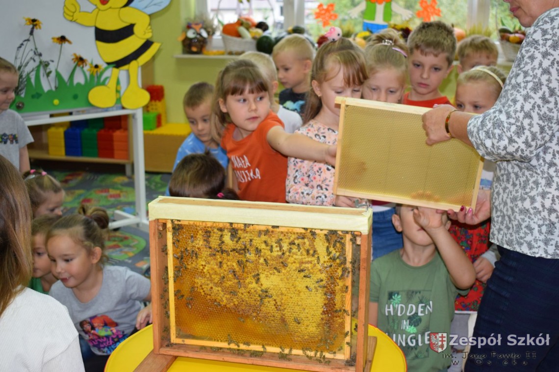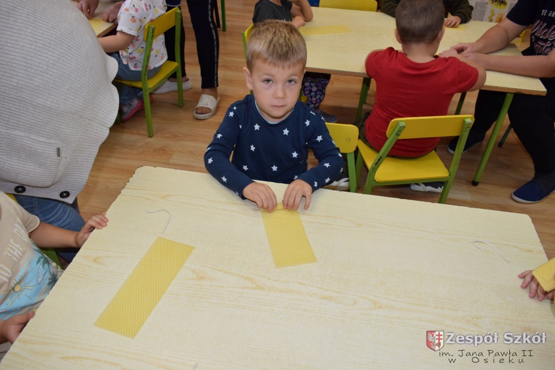 29 września dzieci uczestniczyły w warsztatach pszczelarskich prowadzonym przez Panią Pszczelarz. Zajęcia te miały na celu zapoznanie dzieci z życiem pszczół i ich ogromną rolą jaką pełnią w środowisku naturalnym. Podczas warsztatów przedszkolaki poznały pracę pszczelarza, dowiedziały się jak wybiera się miód z ula i do czego służy taki tajemniczy sprzęt jak podkurzacz. Zaglądały do wnętrza nowoczesnego ula, obserwowały żywe owady zabezpieczone w klateczkach transportowych oraz oglądały obrazy owadów ( pszczołę, osę, trzmiela, szerszenia) w powiększeniu. Dowiedziały się jak wygląda podział ról i organizacja życia w pszczelej rodzinie. Poznały zasady bezpiecznego kontaktu z owadami .Wszystkie dzieci degustowały miód oraz wykonały świece z wosku. Uczyły się wrażliwości i poszanowania dla tych pożytecznych owadów, od których zależy jakość naszego istnienia.