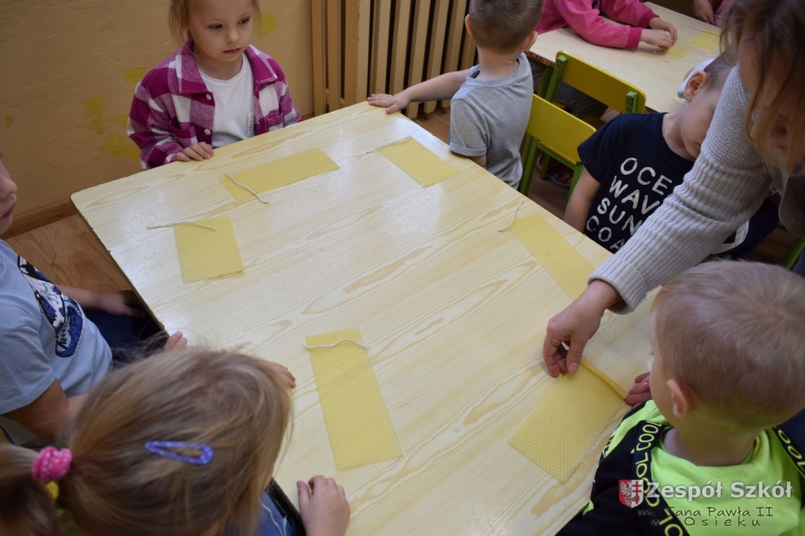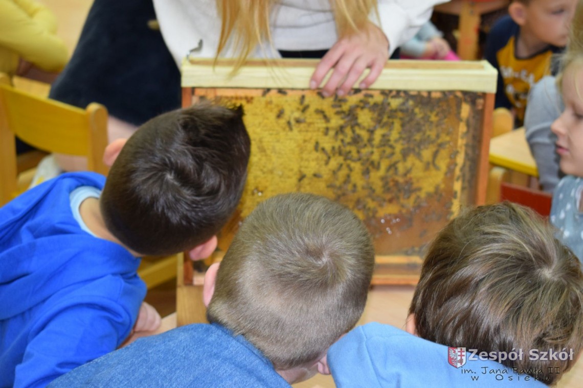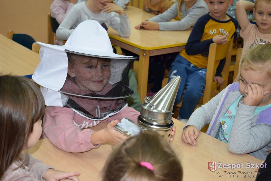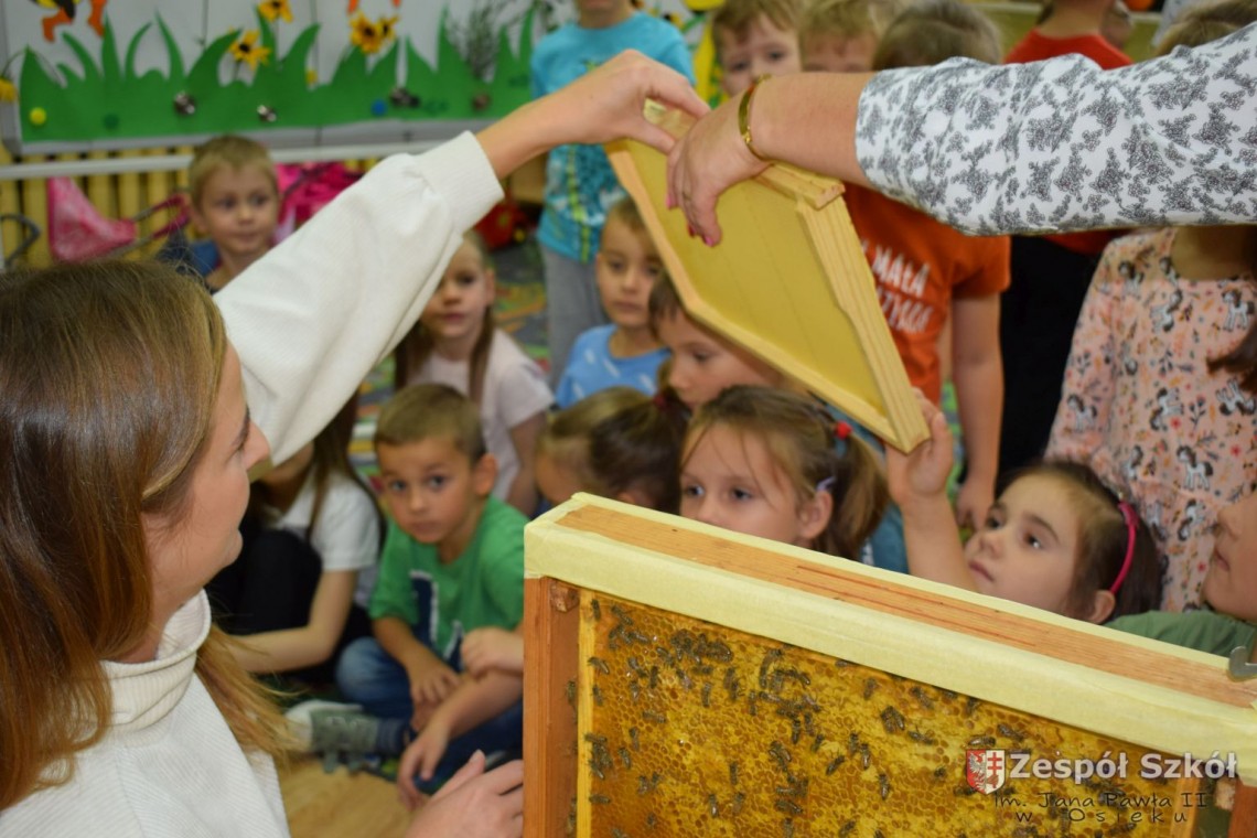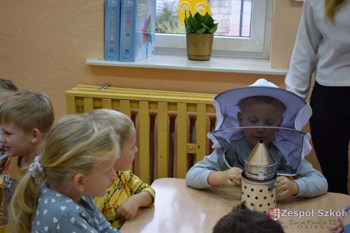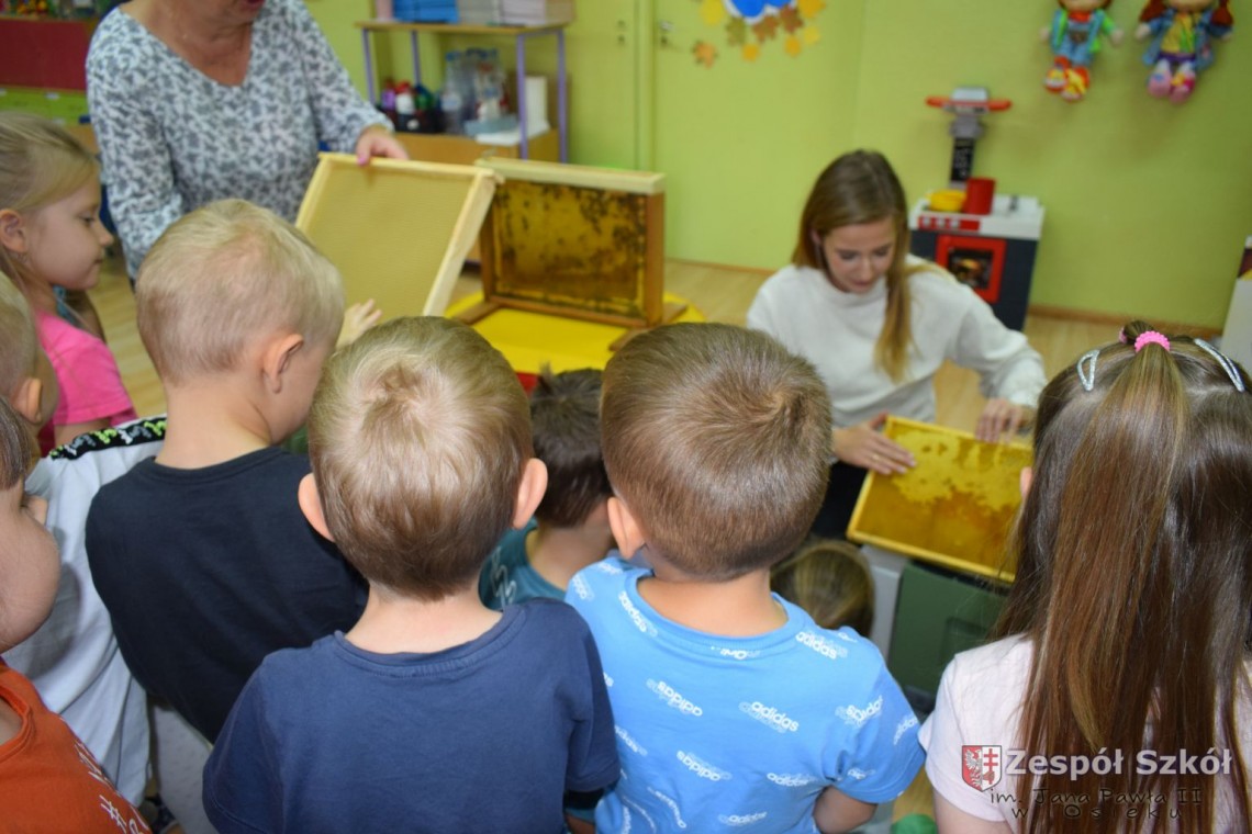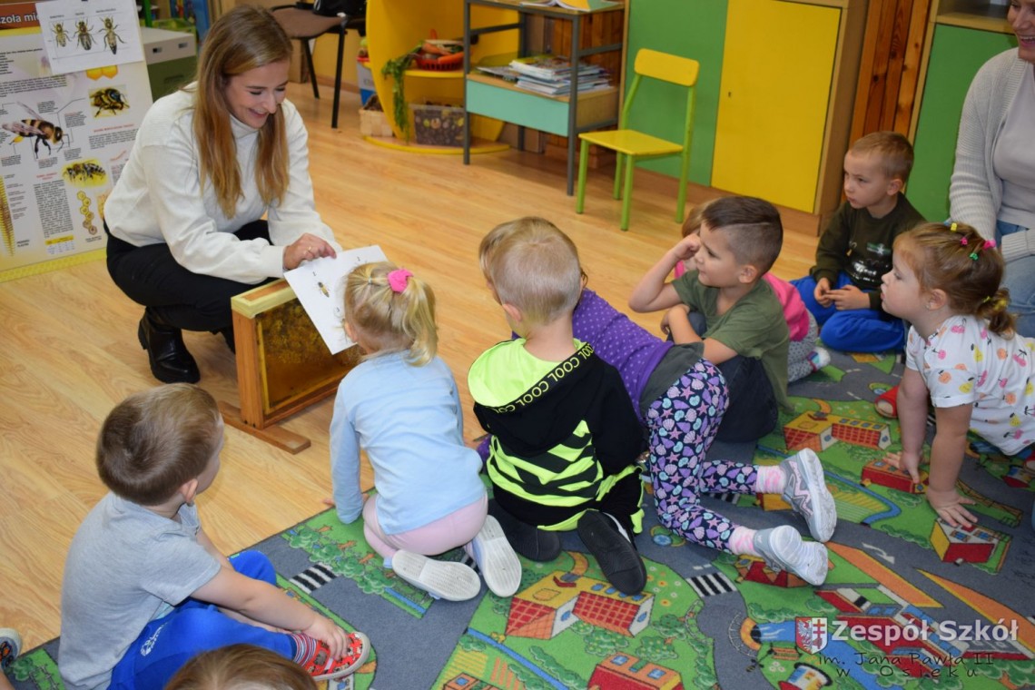 29 września dzieci uczestniczyły w warsztatach pszczelarskich prowadzonym przez Panią Pszczelarz. Zajęcia te miały na celu zapoznanie dzieci z życiem pszczół i ich ogromną rolą jaką pełnią w środowisku naturalnym. Podczas warsztatów przedszkolaki poznały pracę pszczelarza, dowiedziały się jak wybiera się miód z ula i do czego służy taki tajemniczy sprzęt jak podkurzacz. Zaglądały do wnętrza nowoczesnego ula, obserwowały żywe owady zabezpieczone w klateczkach transportowych oraz oglądały obrazy owadów ( pszczołę, osę, trzmiela, szerszenia) w powiększeniu. Dowiedziały się jak wygląda podział ról i organizacja życia w pszczelej rodzinie. Poznały zasady bezpiecznego kontaktu z owadami .Wszystkie dzieci degustowały miód oraz wykonały świece z wosku. Uczyły się wrażliwości i poszanowania dla tych pożytecznych owadów, od których zależy jakość naszego istnienia.