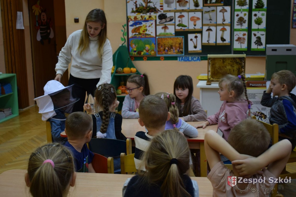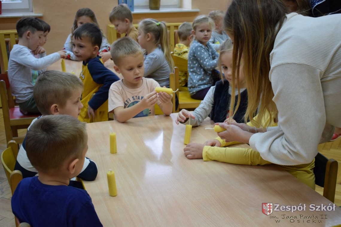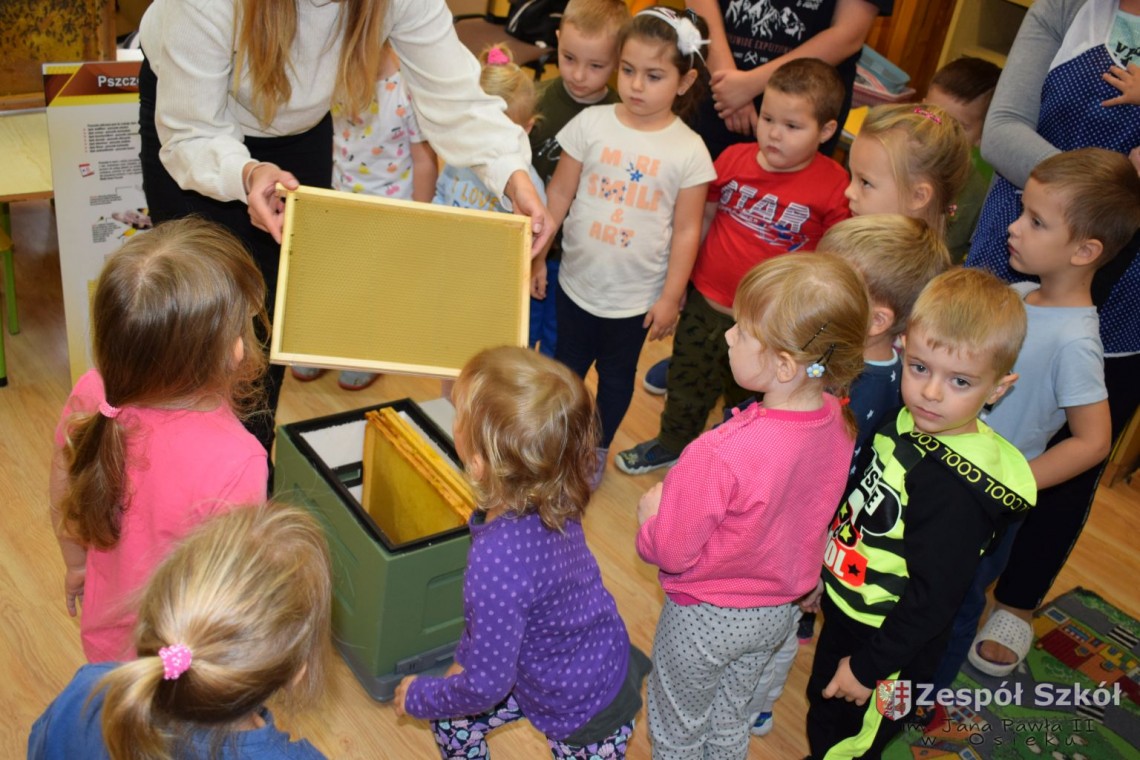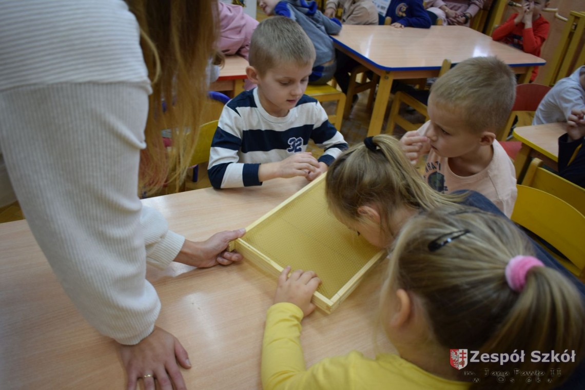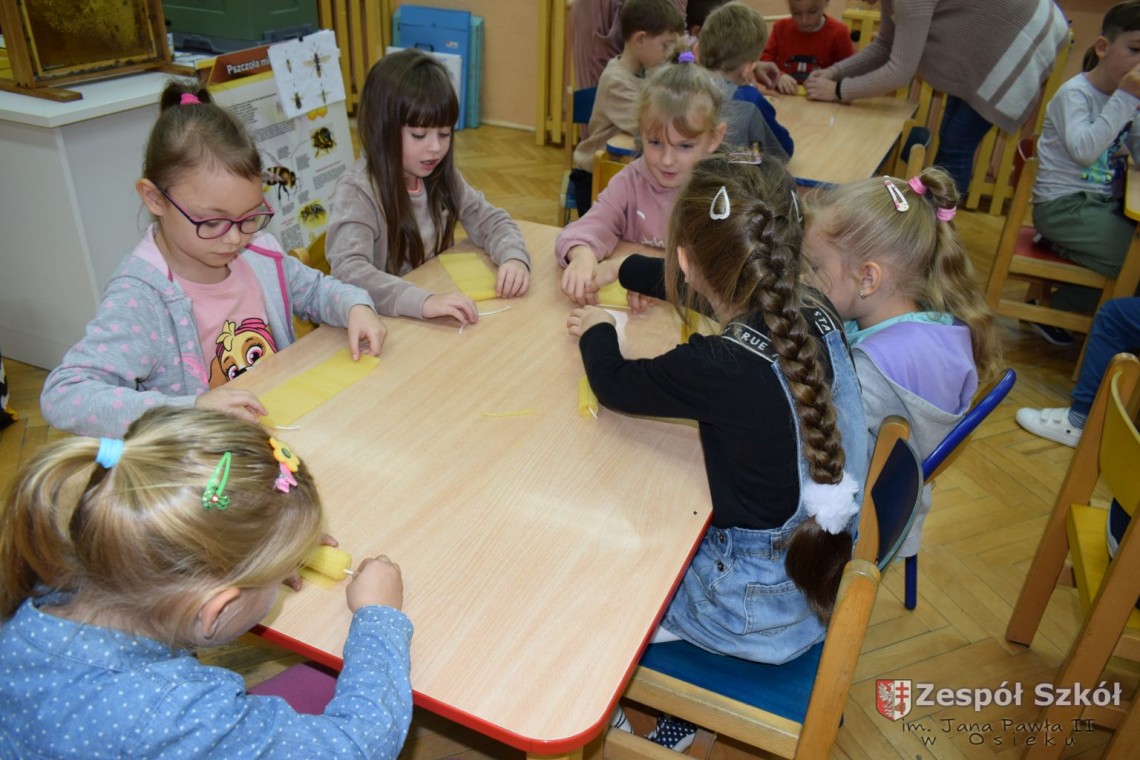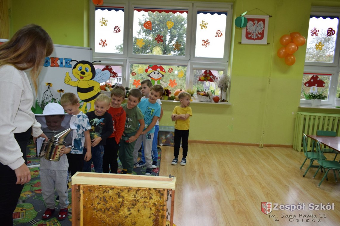 29 września dzieci uczestniczyły w warsztatach pszczelarskich prowadzonym przez Panią Pszczelarz. Zajęcia te miały na celu zapoznanie dzieci z życiem pszczół i ich ogromną rolą jaką pełnią w środowisku naturalnym. Podczas warsztatów przedszkolaki poznały pracę pszczelarza, dowiedziały się jak wybiera się miód z ula i do czego służy taki tajemniczy sprzęt jak podkurzacz. Zaglądały do wnętrza nowoczesnego ula, obserwowały żywe owady zabezpieczone w klateczkach transportowych oraz oglądały obrazy owadów ( pszczołę, osę, trzmiela, szerszenia) w powiększeniu. Dowiedziały się jak wygląda podział ról i organizacja życia w pszczelej rodzinie. Poznały zasady bezpiecznego kontaktu z owadami .Wszystkie dzieci degustowały miód oraz wykonały świece z wosku. Uczyły się wrażliwości i poszanowania dla tych pożytecznych owadów, od których zależy jakość naszego istnienia.