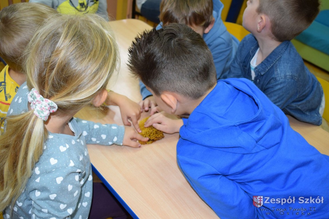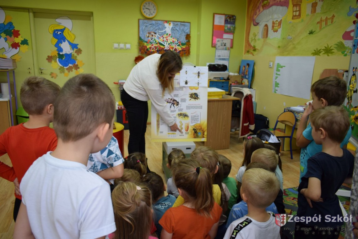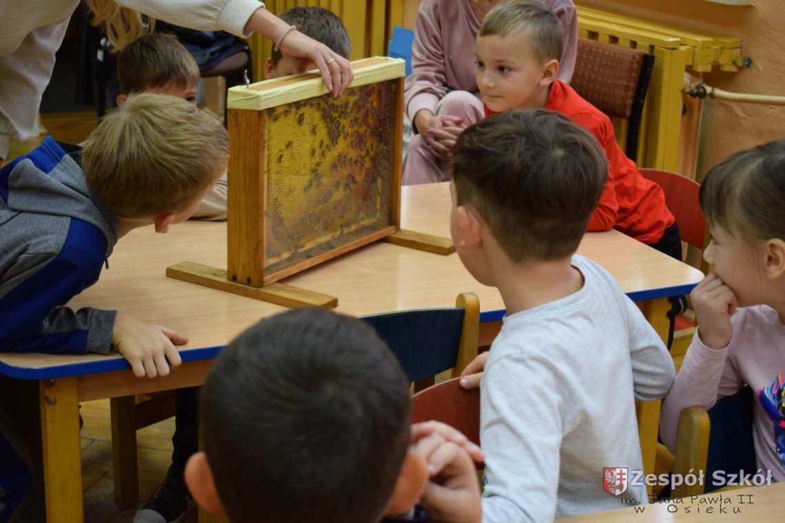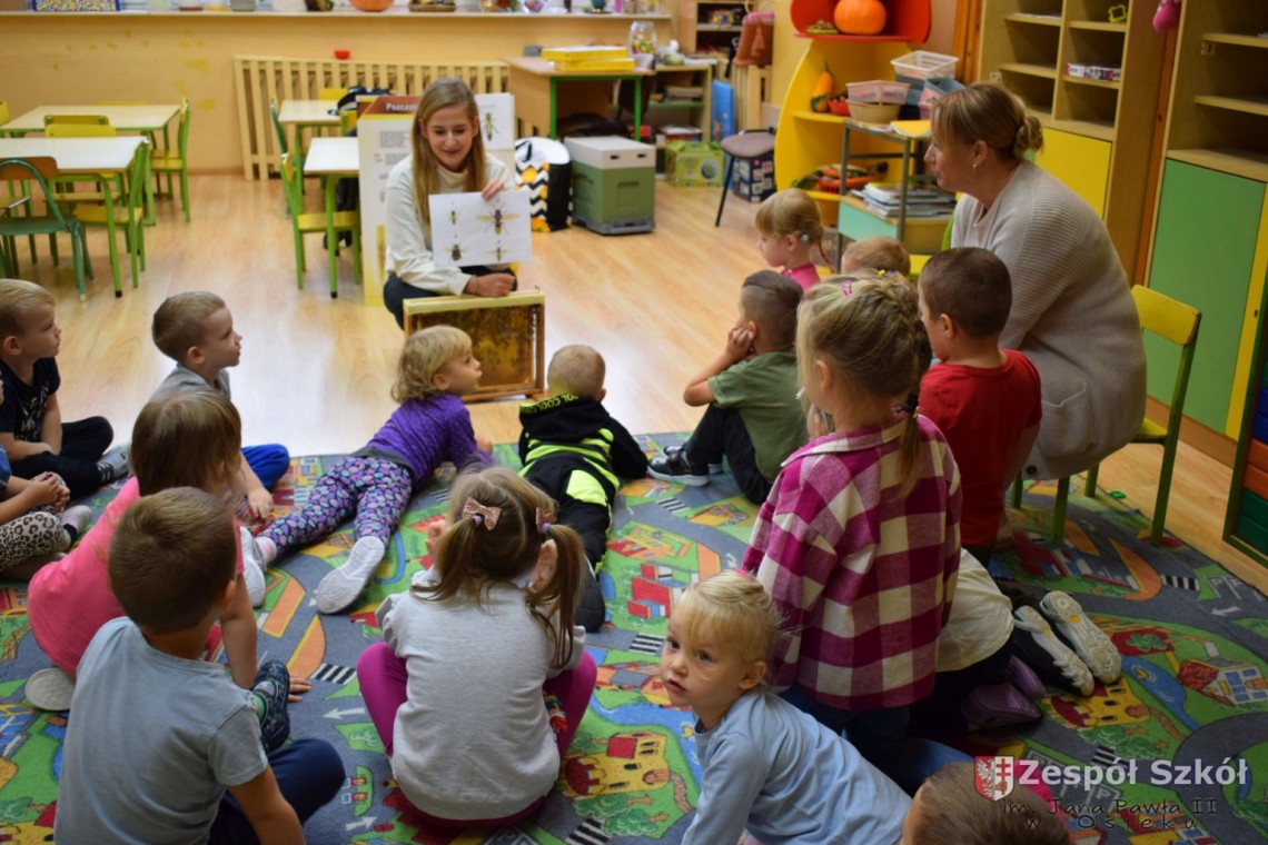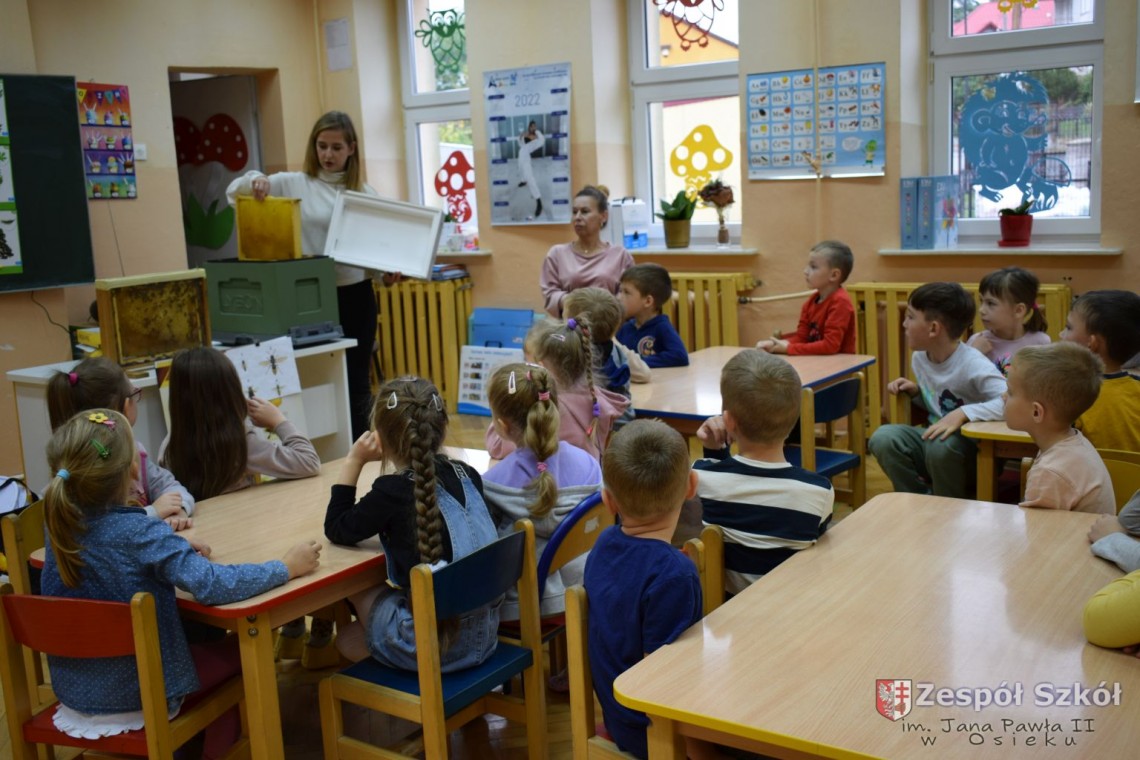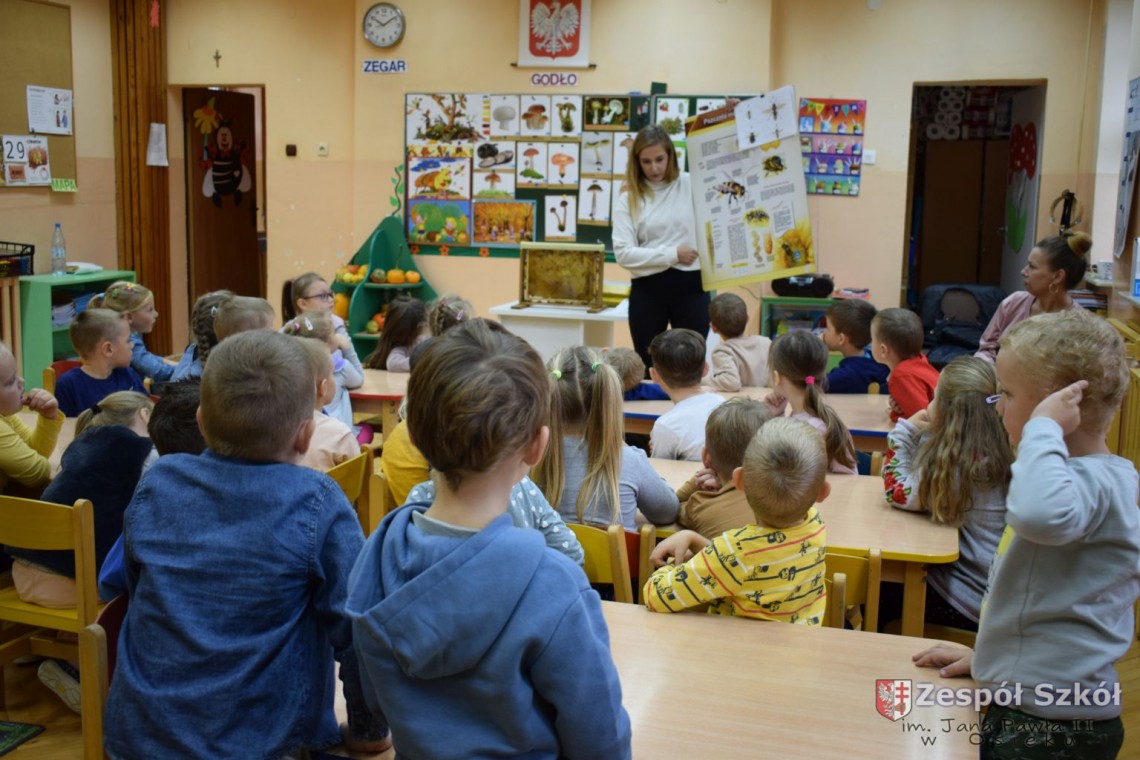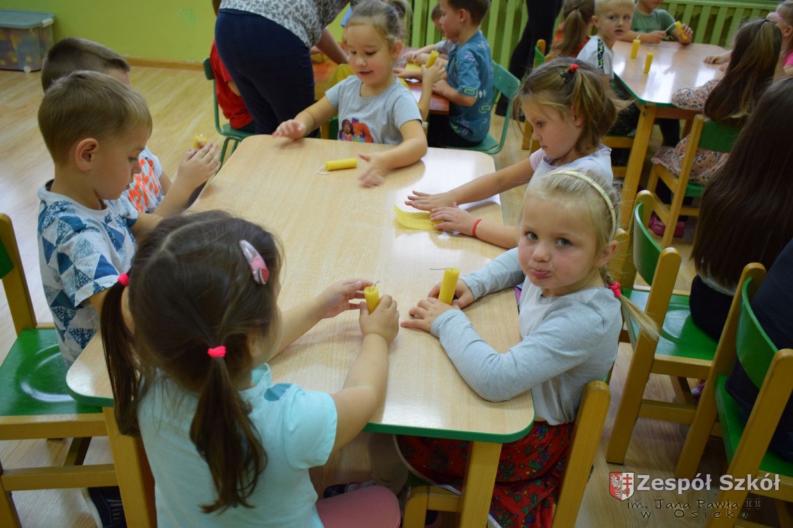 29 września dzieci uczestniczyły w warsztatach pszczelarskich prowadzonym przez Panią Pszczelarz. Zajęcia te miały na celu zapoznanie dzieci z życiem pszczół i ich ogromną rolą jaką pełnią w środowisku naturalnym. Podczas warsztatów przedszkolaki poznały pracę pszczelarza, dowiedziały się jak wybiera się miód z ula i do czego służy taki tajemniczy sprzęt jak podkurzacz. Zaglądały do wnętrza nowoczesnego ula, obserwowały żywe owady zabezpieczone w klateczkach transportowych oraz oglądały obrazy owadów ( pszczołę, osę, trzmiela, szerszenia) w powiększeniu. Dowiedziały się jak wygląda podział ról i organizacja życia w pszczelej rodzinie. Poznały zasady bezpiecznego kontaktu z owadami .Wszystkie dzieci degustowały miód oraz wykonały świece z wosku. Uczyły się wrażliwości i poszanowania dla tych pożytecznych owadów, od których zależy jakość naszego istnienia.
