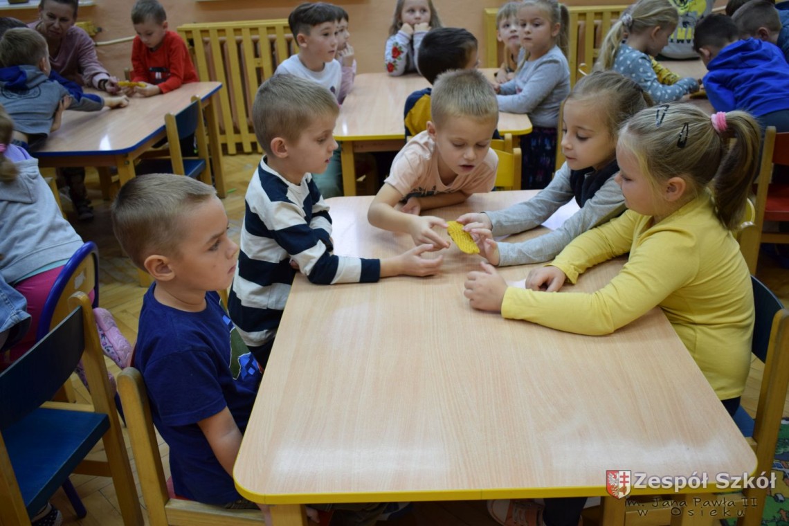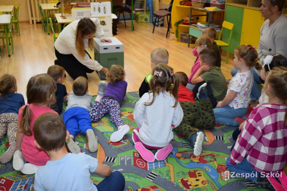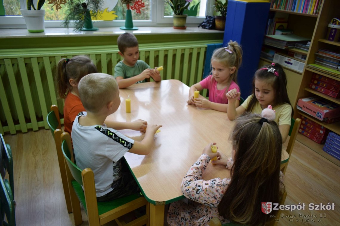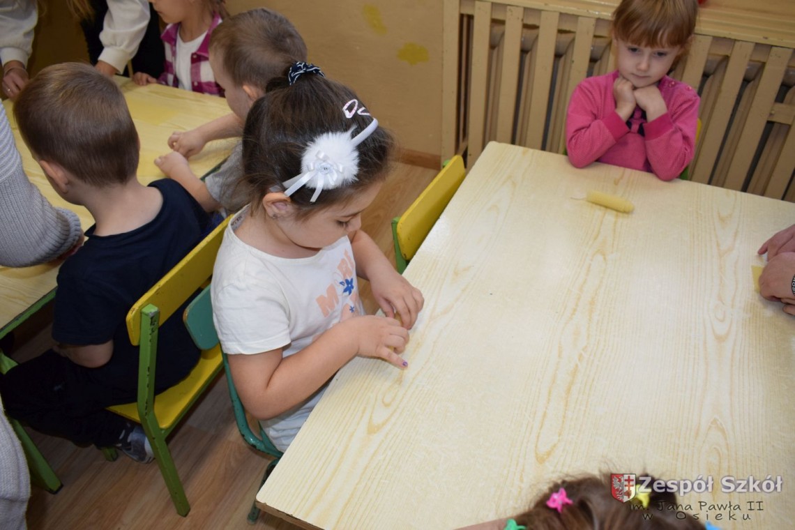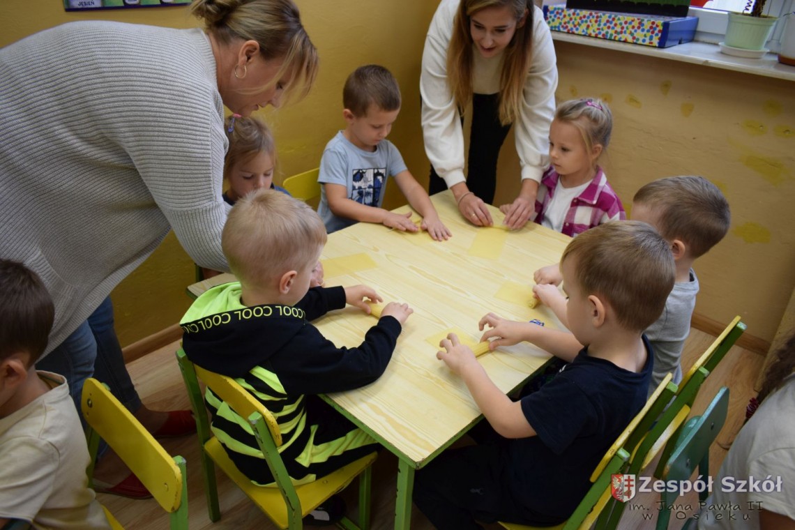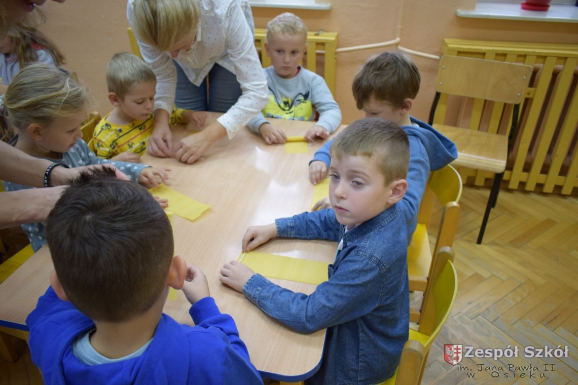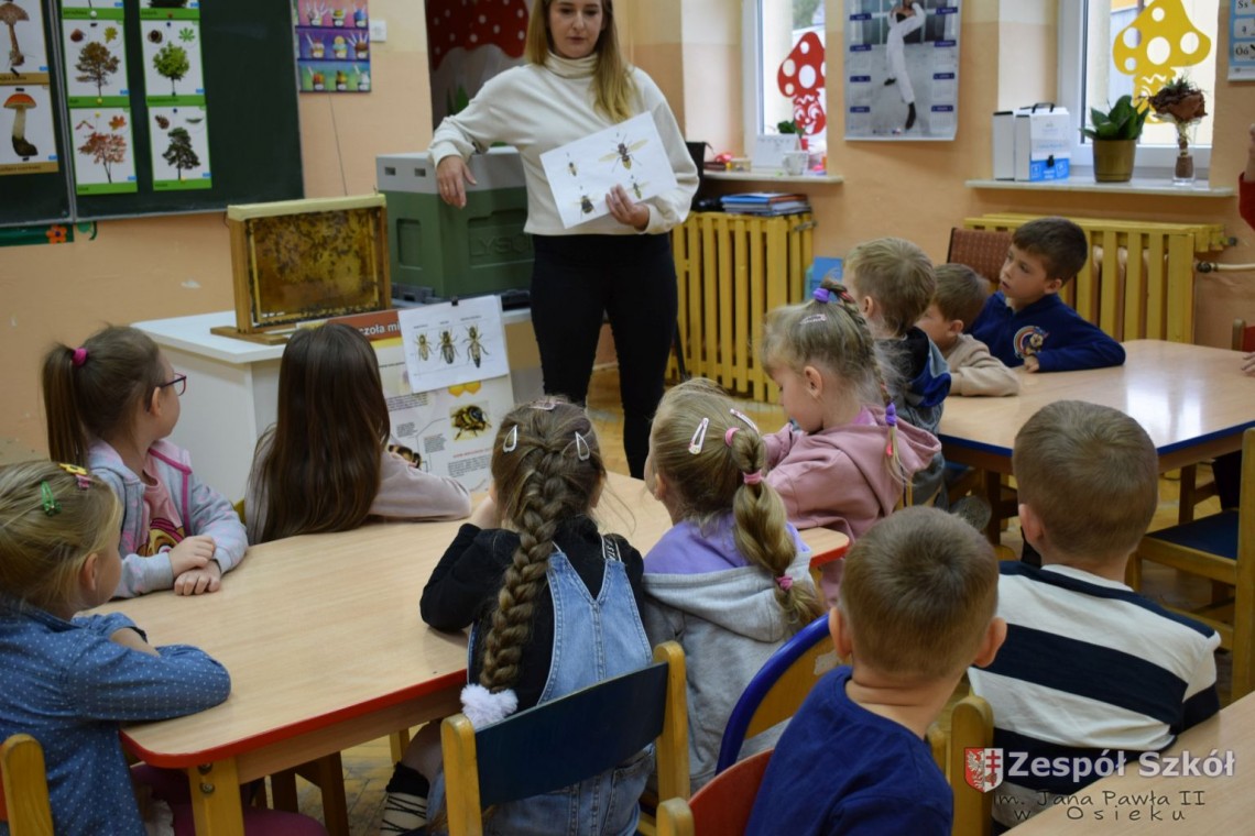 29 września dzieci uczestniczyły w warsztatach pszczelarskich prowadzonym przez Panią Pszczelarz. Zajęcia te miały na celu zapoznanie dzieci z życiem pszczół i ich ogromną rolą jaką pełnią w środowisku naturalnym. Podczas warsztatów przedszkolaki poznały pracę pszczelarza, dowiedziały się jak wybiera się miód z ula i do czego służy taki tajemniczy sprzęt jak podkurzacz. Zaglądały do wnętrza nowoczesnego ula, obserwowały żywe owady zabezpieczone w klateczkach transportowych oraz oglądały obrazy owadów ( pszczołę, osę, trzmiela, szerszenia) w powiększeniu. Dowiedziały się jak wygląda podział ról i organizacja życia w pszczelej rodzinie. Poznały zasady bezpiecznego kontaktu z owadami .Wszystkie dzieci degustowały miód oraz wykonały świece z wosku. Uczyły się wrażliwości i poszanowania dla tych pożytecznych owadów, od których zależy jakość naszego istnienia.
