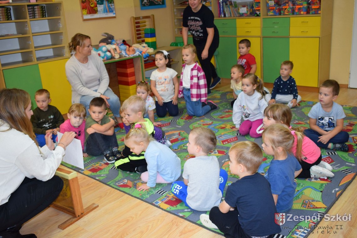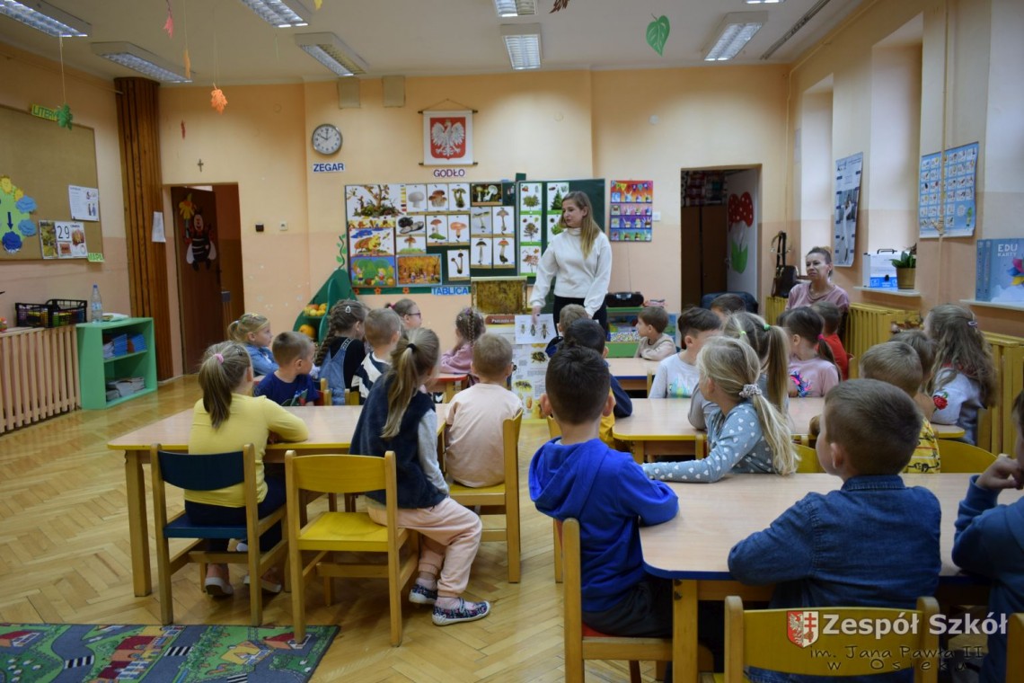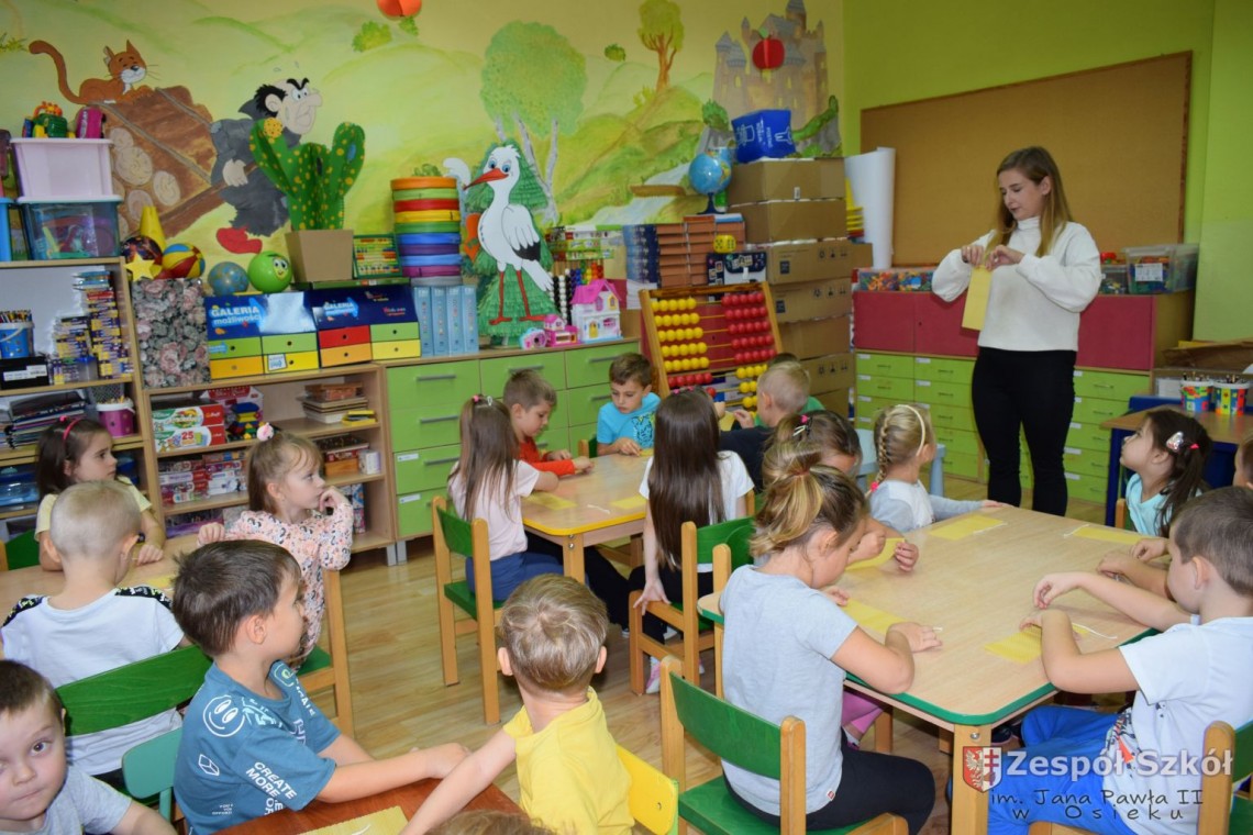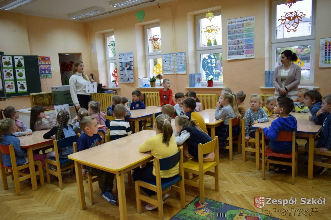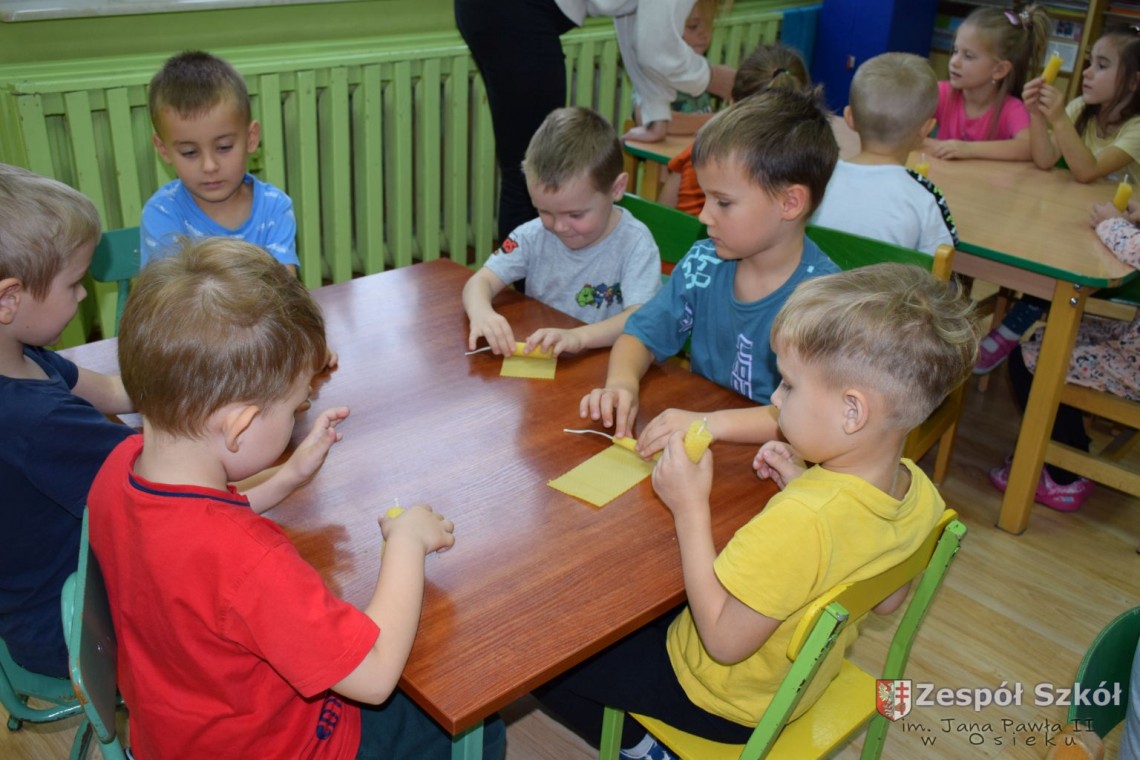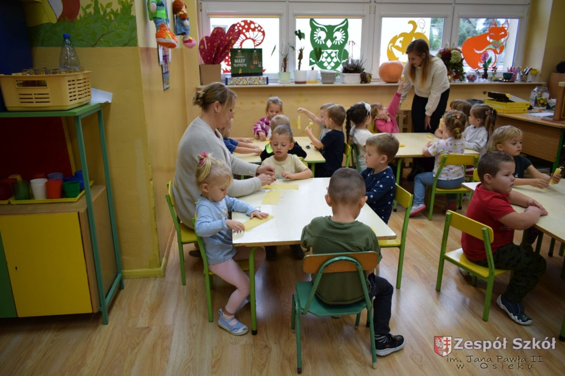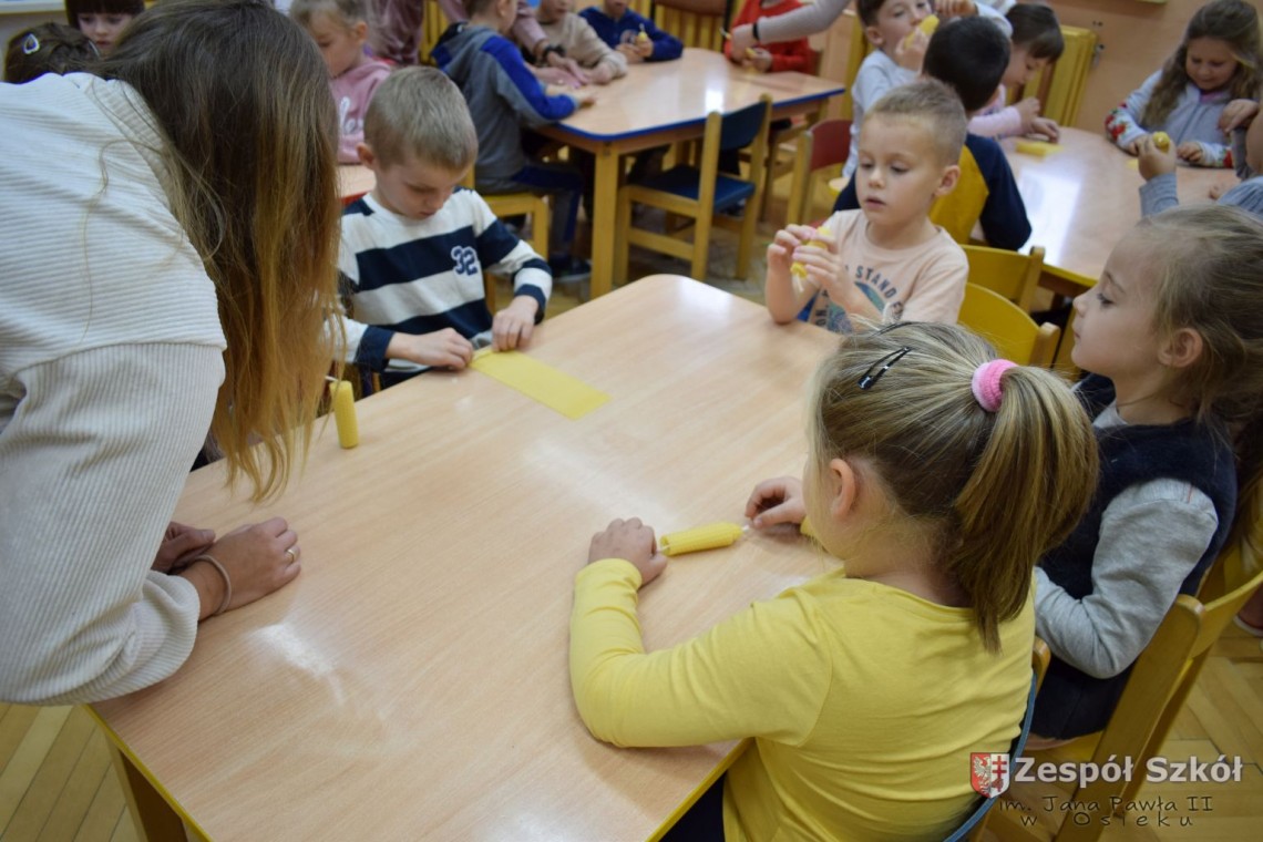 29 września dzieci uczestniczyły w warsztatach pszczelarskich prowadzonym przez Panią Pszczelarz. Zajęcia te miały na celu zapoznanie dzieci z życiem pszczół i ich ogromną rolą jaką pełnią w środowisku naturalnym. Podczas warsztatów przedszkolaki poznały pracę pszczelarza, dowiedziały się jak wybiera się miód z ula i do czego służy taki tajemniczy sprzęt jak podkurzacz. Zaglądały do wnętrza nowoczesnego ula, obserwowały żywe owady zabezpieczone w klateczkach transportowych oraz oglądały obrazy owadów ( pszczołę, osę, trzmiela, szerszenia) w powiększeniu. Dowiedziały się jak wygląda podział ról i organizacja życia w pszczelej rodzinie. Poznały zasady bezpiecznego kontaktu z owadami .Wszystkie dzieci degustowały miód oraz wykonały świece z wosku. Uczyły się wrażliwości i poszanowania dla tych pożytecznych owadów, od których zależy jakość naszego istnienia.