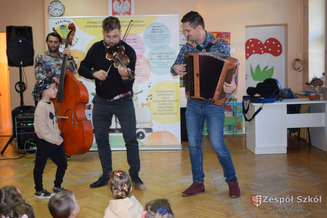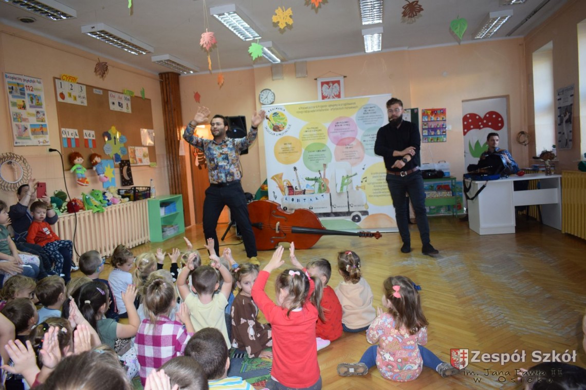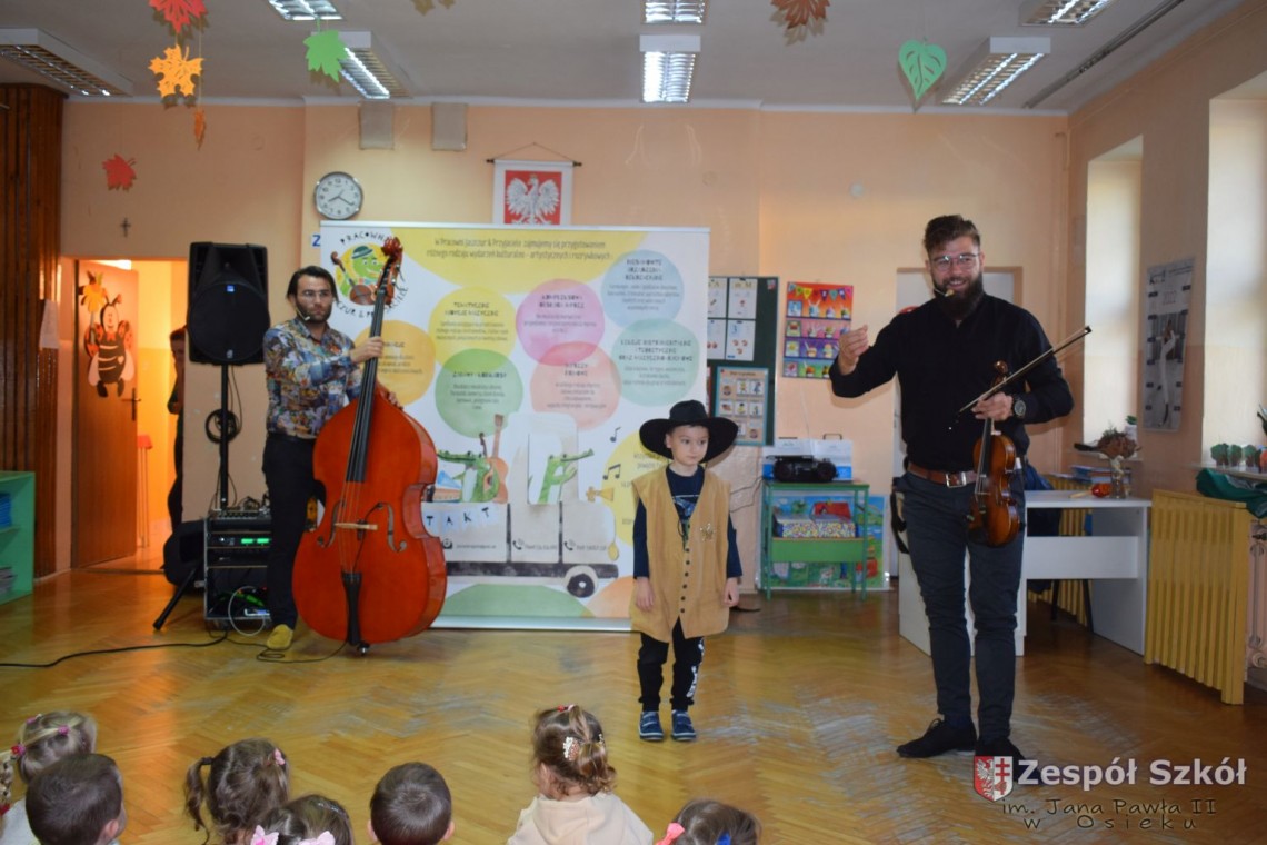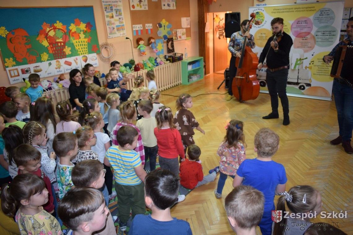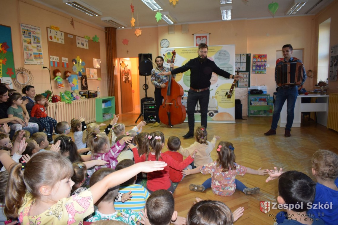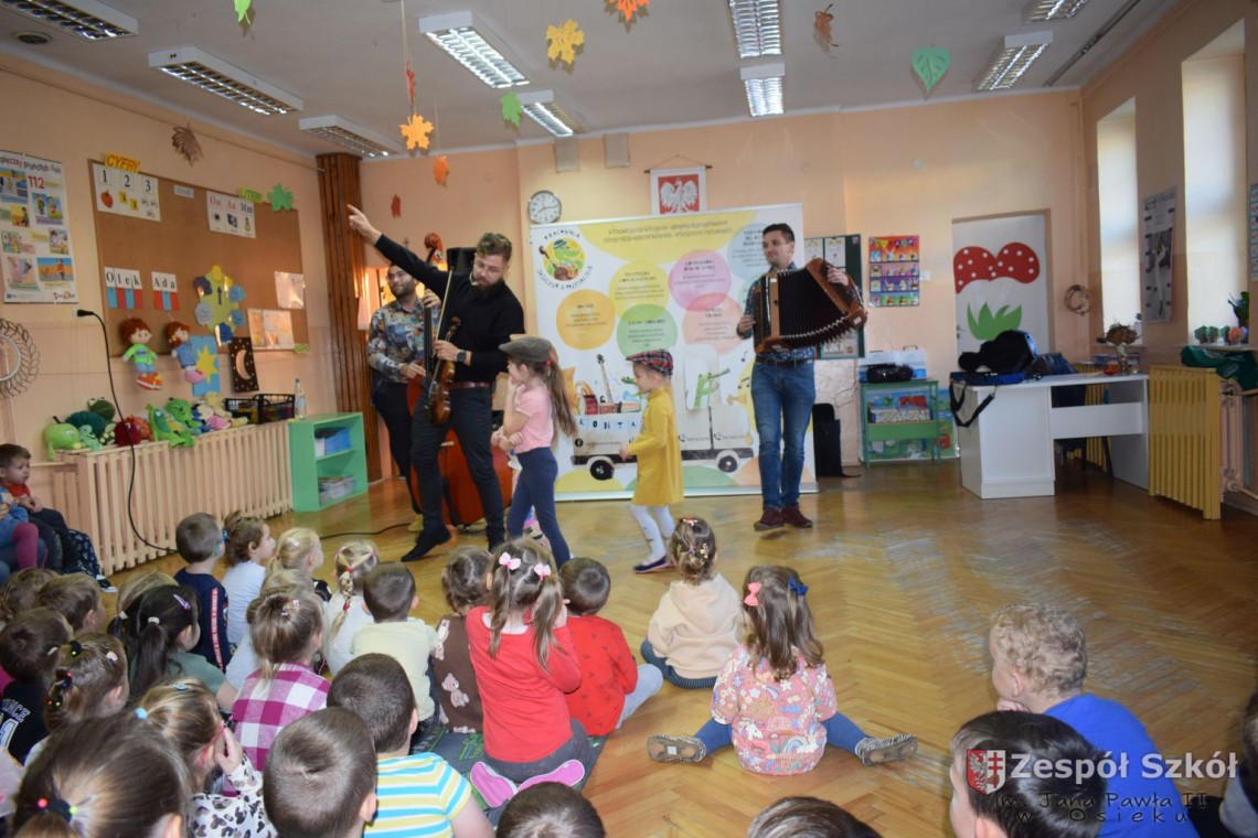 Dzieci z naszego przedszkola 19 października miały możliwość wzięcia udziału w audycji muzycznej „Podróż dookoła świata muzycznym samolotem” prowadzonej prze muzyków z „Pracowni Jaszczur i Przyjaciele”. W rytmie pięknych piosenek dzieci poznały nowe instrumenty muzyczne oraz ich charakterystyczne dźwięki, tańczyły i świetnie się bawiły. Audycja wszystkim uczestnikom sprawiła wiele radości.