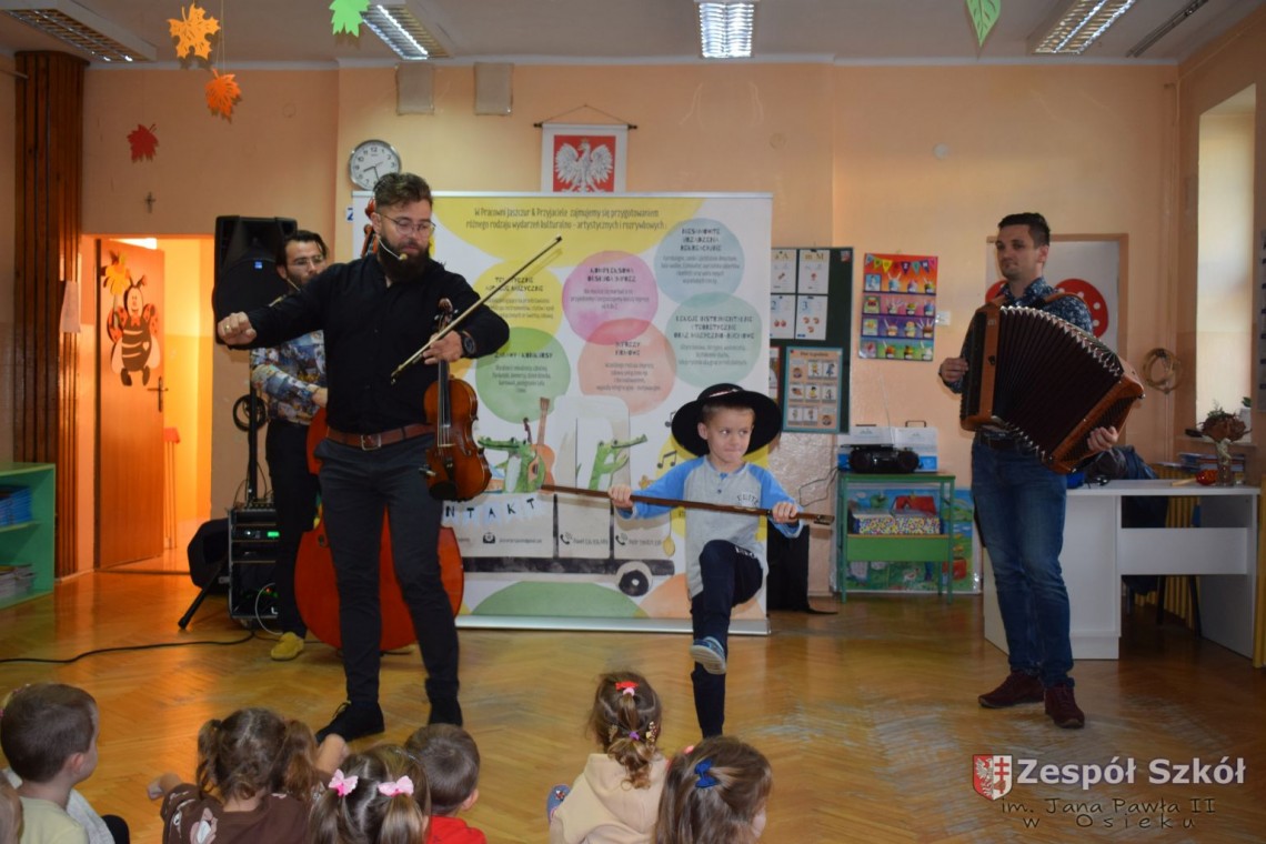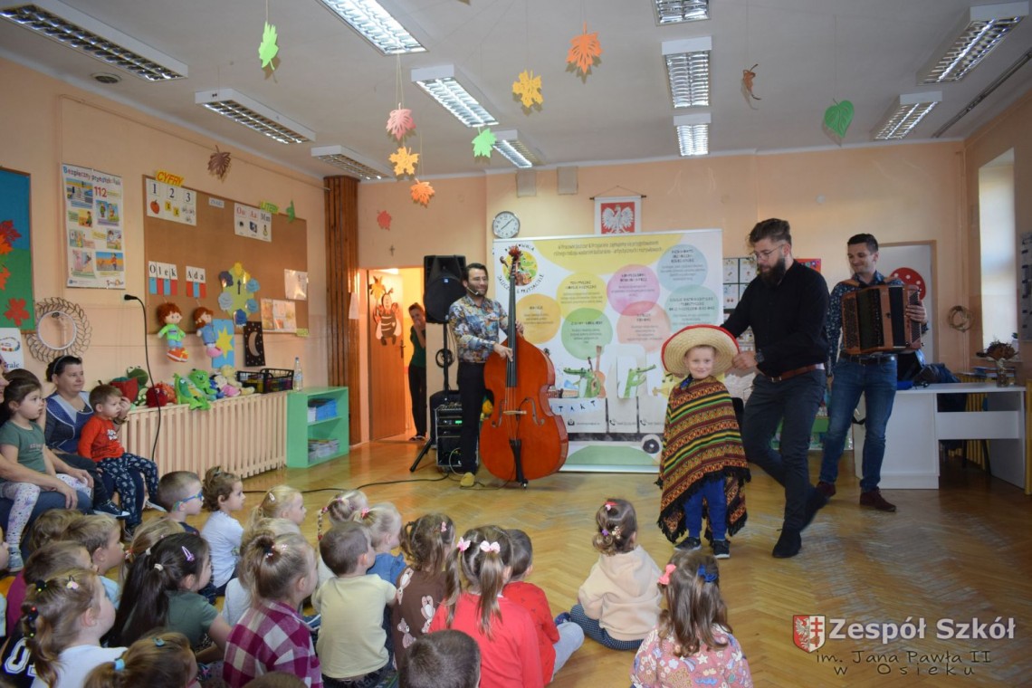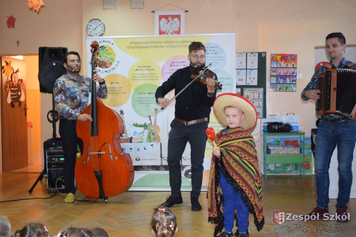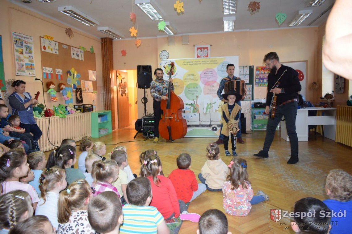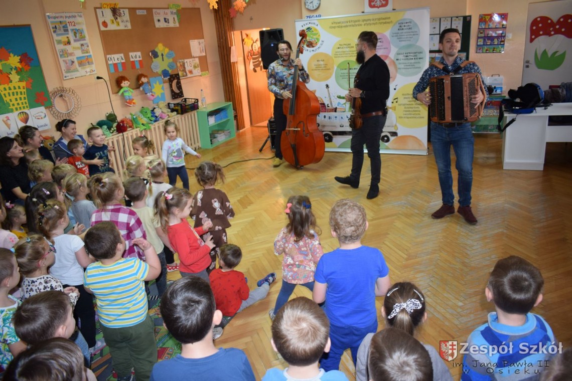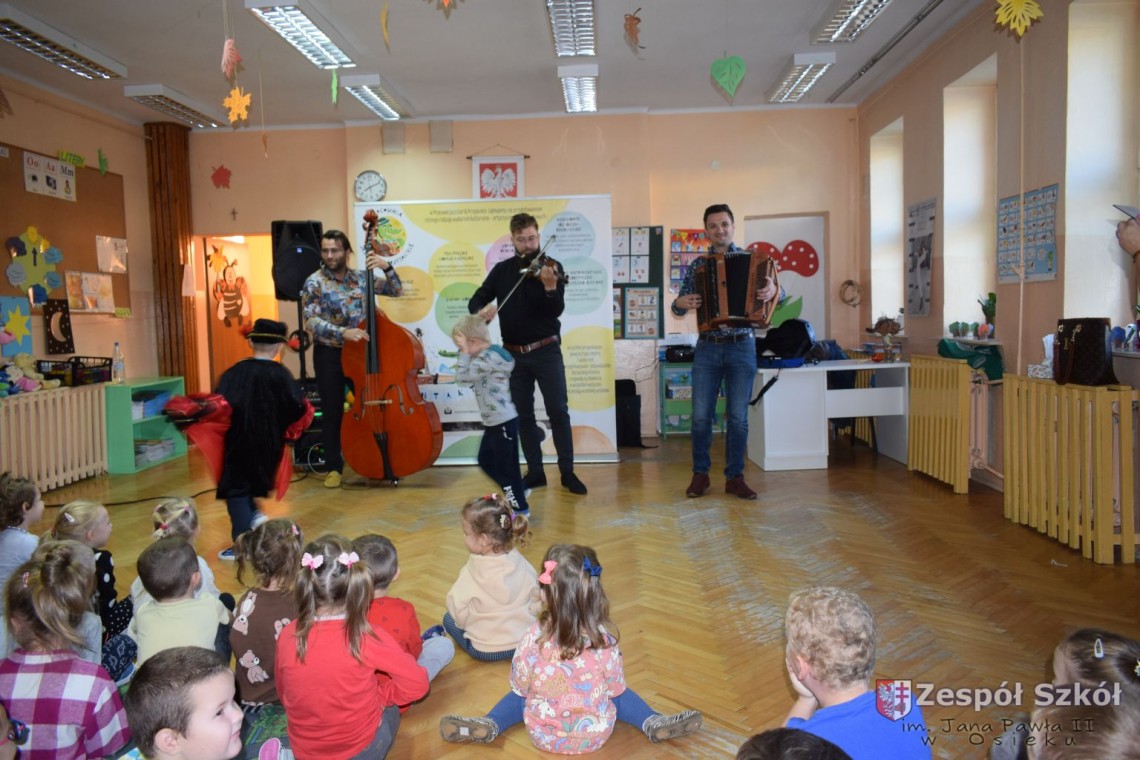Dzieci z naszego przedszkola 19 października miały możliwość wzięcia udziału w audycji muzycznej „Podróż dookoła świata muzycznym samolotem” prowadzonej prze muzyków z „Pracowni Jaszczur i Przyjaciele”. W rytmie pięknych piosenek dzieci poznały nowe instrumenty muzyczne oraz ich charakterystyczne dźwięki, tańczyły i świetnie się bawiły. Audycja wszystkim uczestnikom sprawiła wiele radości.