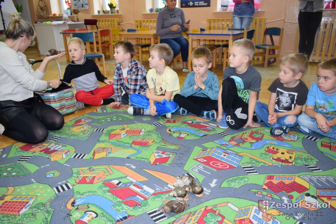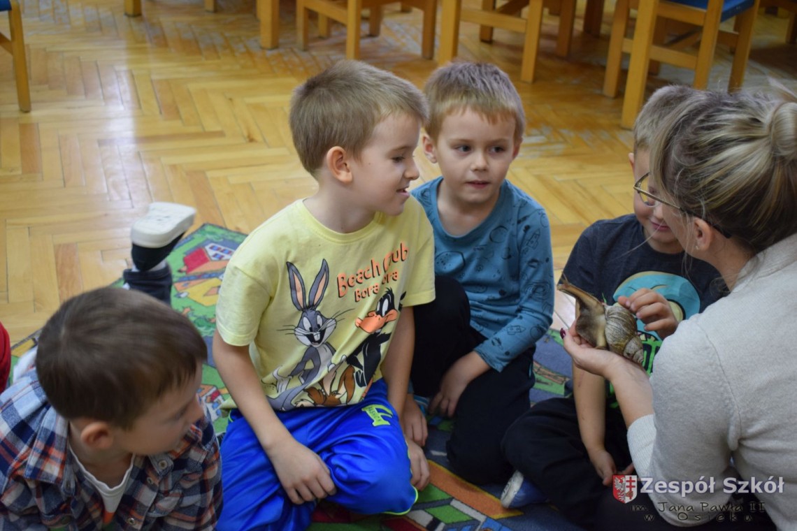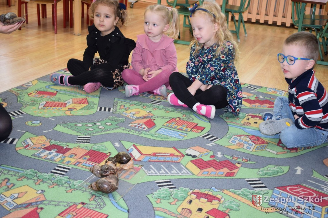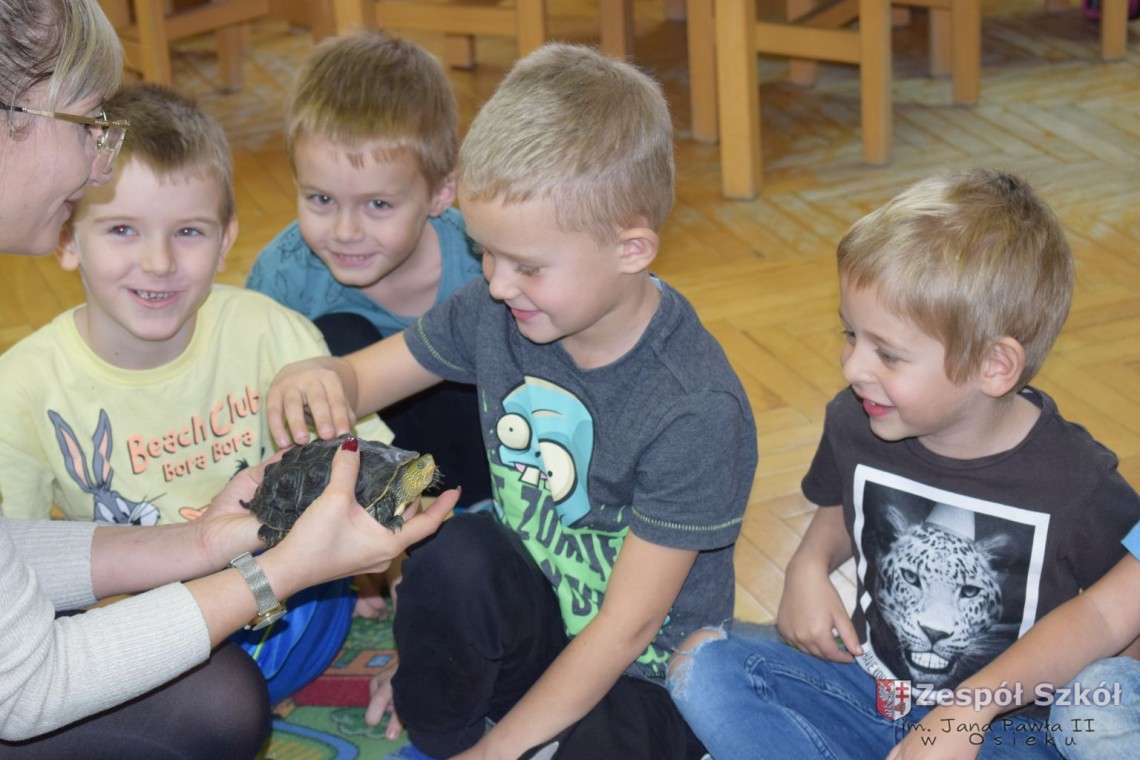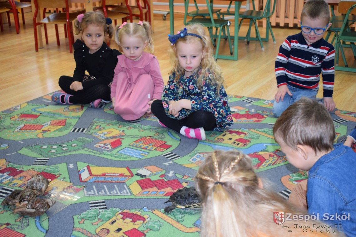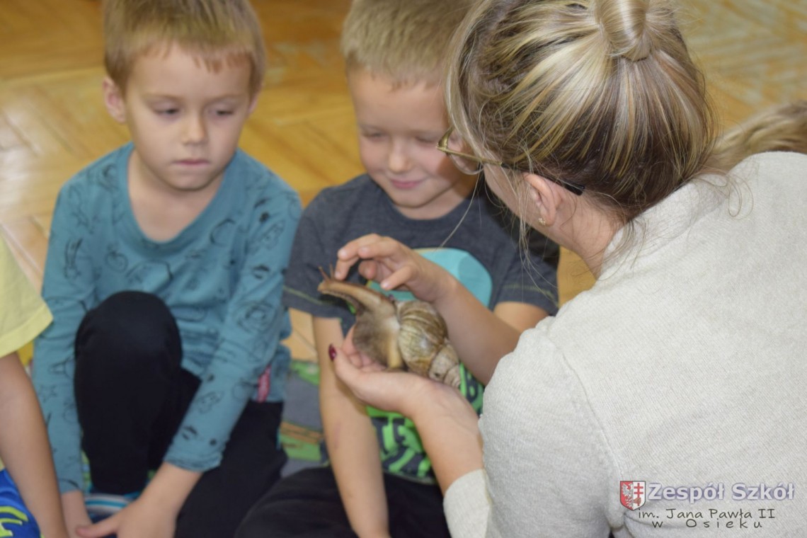 Taki temat był warsztatów egzotycznych dla przedszkolaków, które odbyły się w dniu 15 listopada. Dzieci miały możliwość zobaczyć  ślimaki afrykańskie Achatina, to największe ślimaki lądowe, są wielkości świnki morskiej oraz żółwia wodno – lądowego Stefana. Afrykańskie ślimaki Achatina oraz żółwie wodno-lądowe  to wyjątkowo ciekawe zwierzęta. Dzieci dowiedziały się jak należy dbać o nie, co jedzą, czemu mają blizny na muszlach, jakie maja znaczenie w przyrodzie no i to, że nie potrzebują domku tak jak inne zwierzęta, bo rodzą się z domkiem na swoim ciele.
