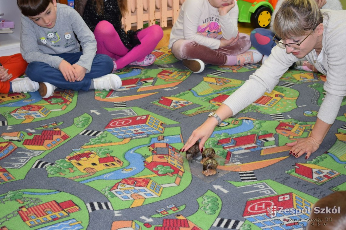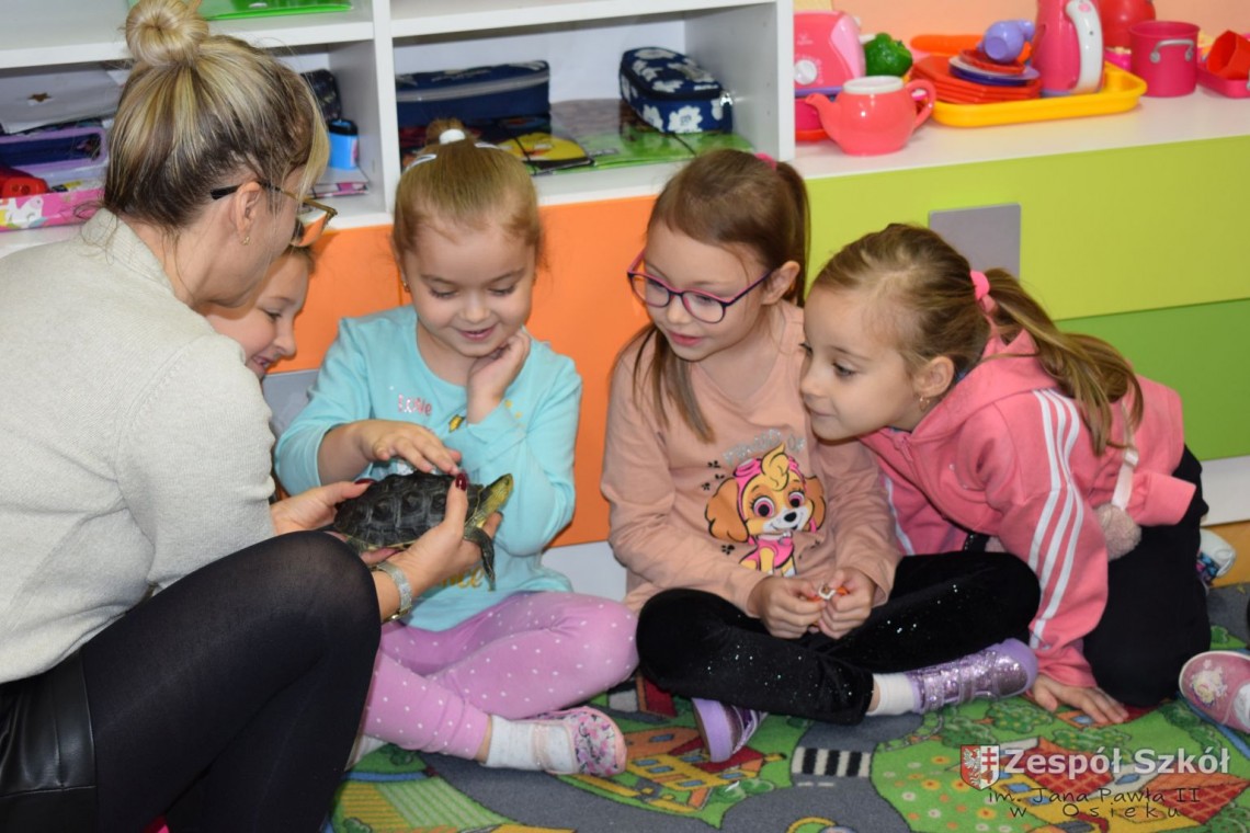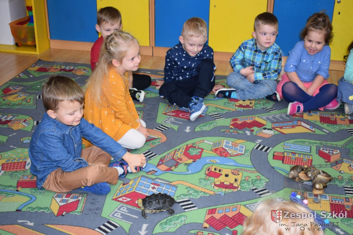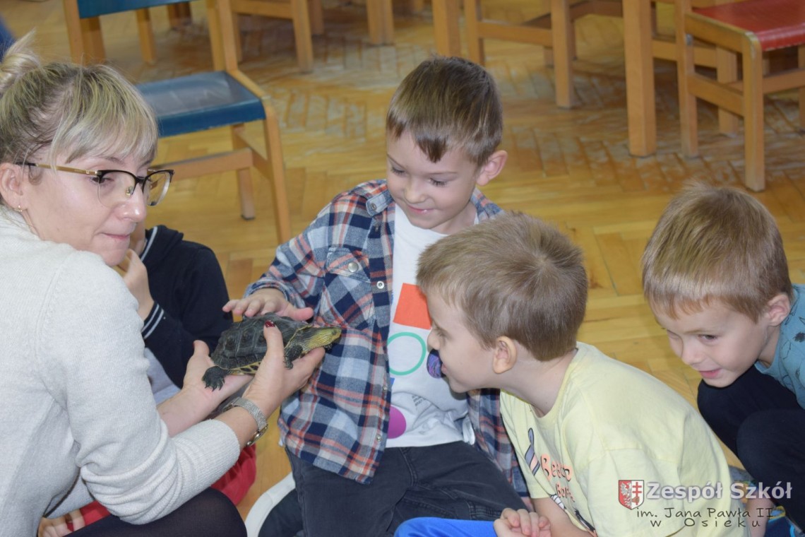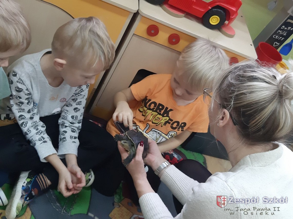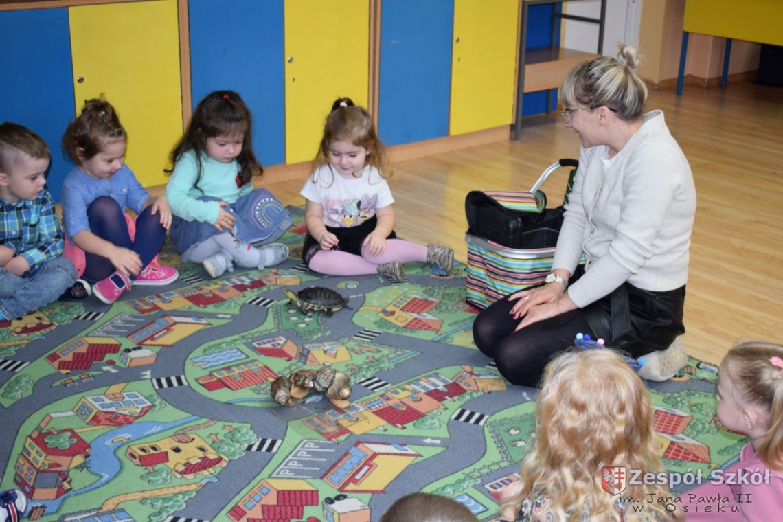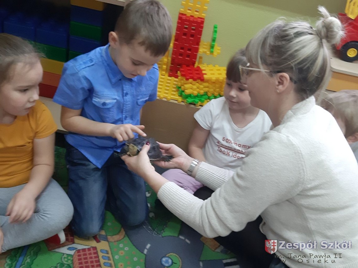 Taki temat był warsztatów egzotycznych dla przedszkolaków, które odbyły się w dniu 15 listopada. Dzieci miały możliwość zobaczyć  ślimaki afrykańskie Achatina, to największe ślimaki lądowe, są wielkości świnki morskiej oraz żółwia wodno – lądowego Stefana. Afrykańskie ślimaki Achatina oraz żółwie wodno-lądowe  to wyjątkowo ciekawe zwierzęta. Dzieci dowiedziały się jak należy dbać o nie, co jedzą, czemu mają blizny na muszlach, jakie maja znaczenie w przyrodzie no i to, że nie potrzebują domku tak jak inne zwierzęta, bo rodzą się z domkiem na swoim ciele.