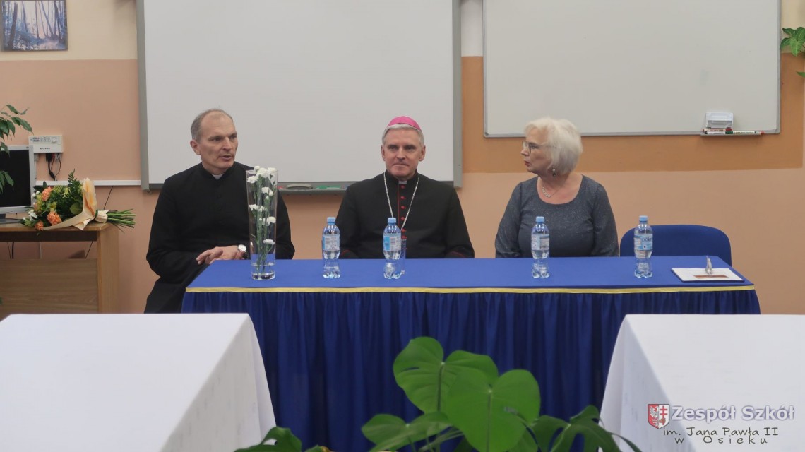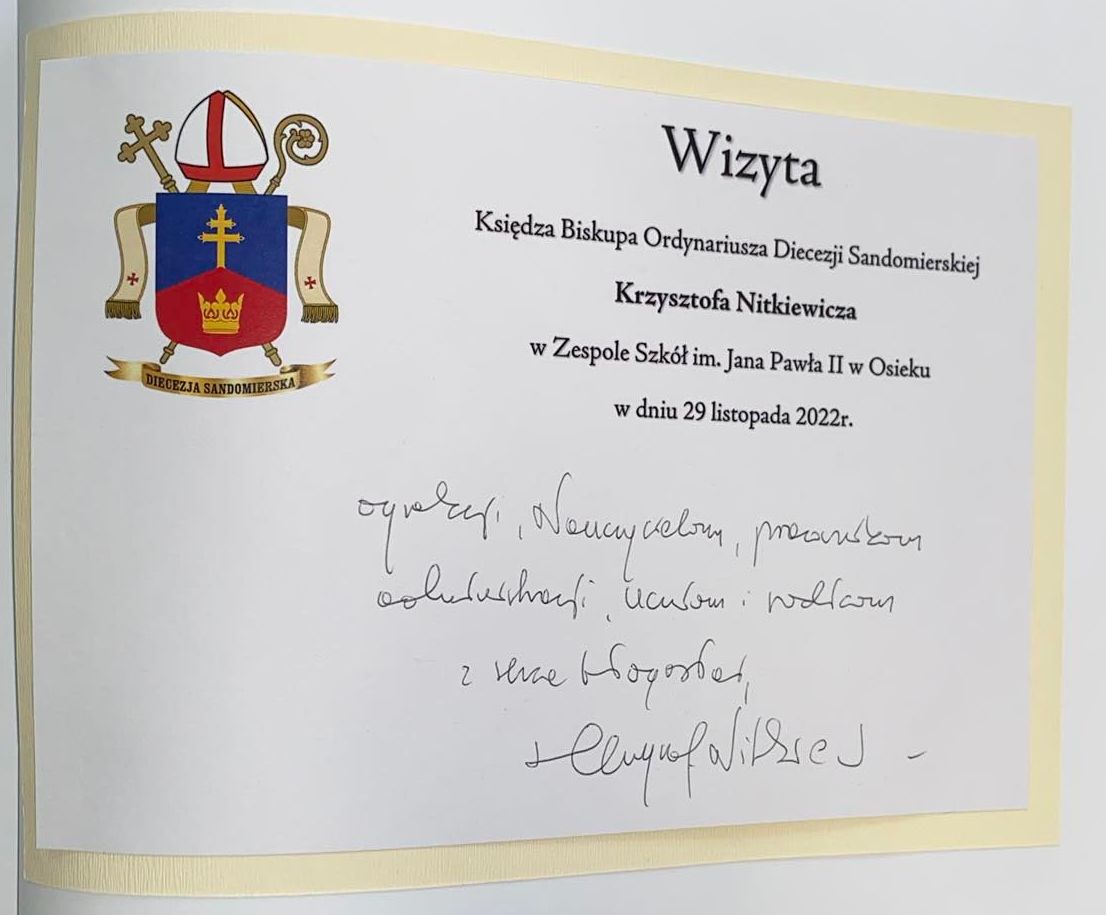 Dnia 29.11.2022r. miała miejsce w naszej szkole niecodzienna wizyta. W ramach wizytacji kanonicznej naszą szkołę odwiedził ks. biskup Krzysztof Nitkiewicz w towarzystwie ks. Proboszcza Parafii Osiek – ks. Pawła Bieleckiego w imieniu całej społeczności szkolnej zacnych gości powitała p. Dyrektor Małgorzata Kunowska oraz przedstawiciele uczniów nasze szkoły.