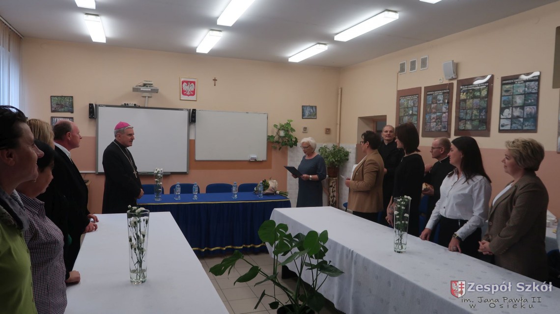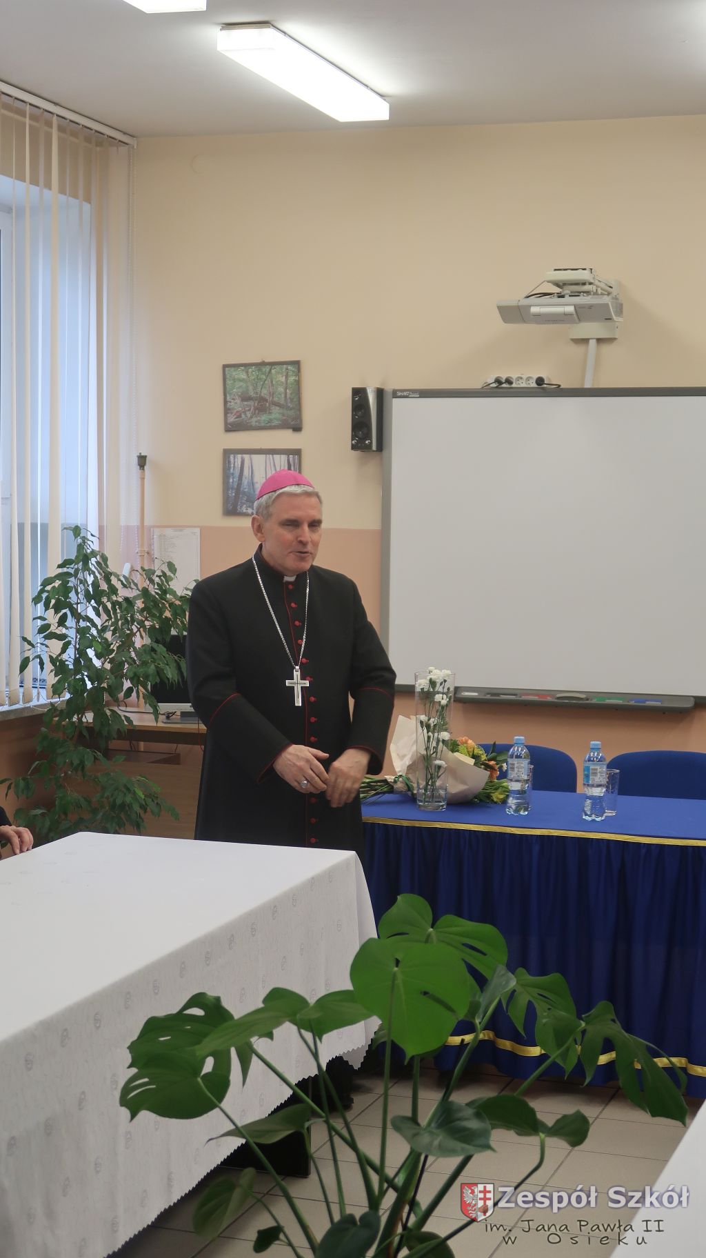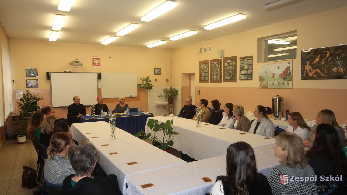 Podczas tej wizyty ks. bp. spotkał się również z częścią Grona Pedagogicznego. Skierował wówczas do zebranych nauczycieli słowa wsparcia, wskazując na trud przekazywania wiedzy w dzisiejszym świecie, który zdecydowanie obniża autorytet nauczyciela.
