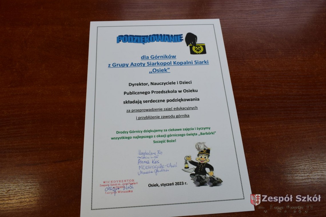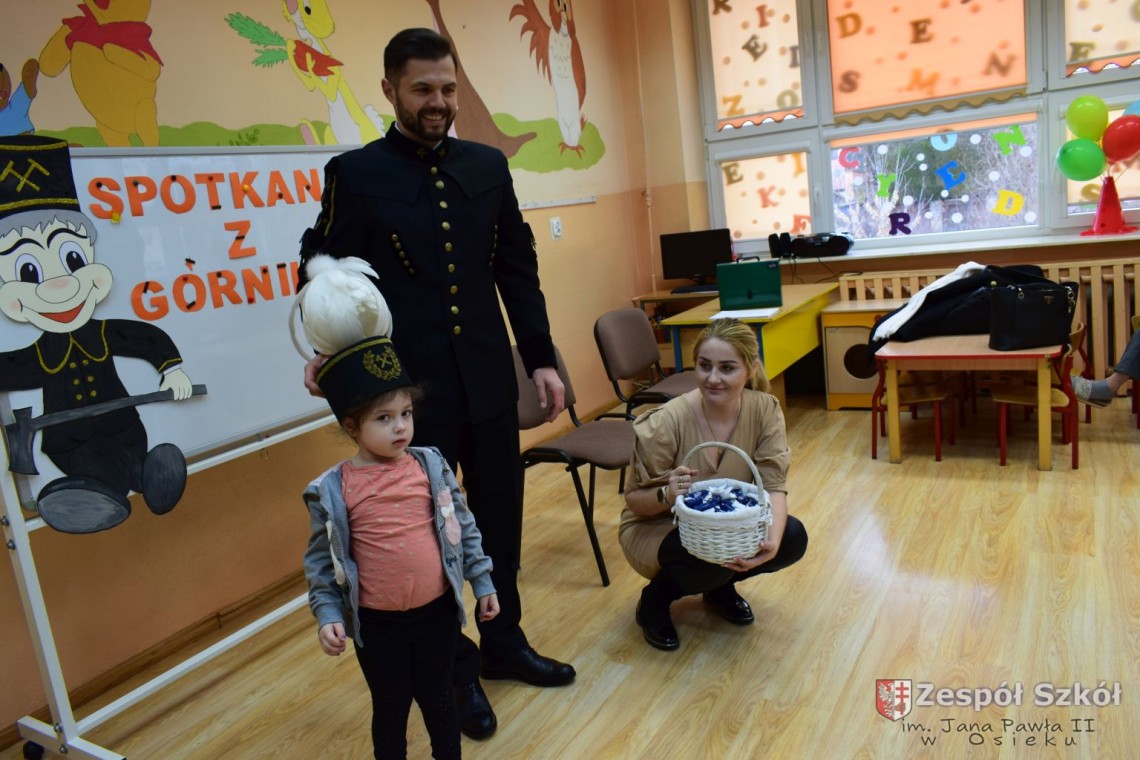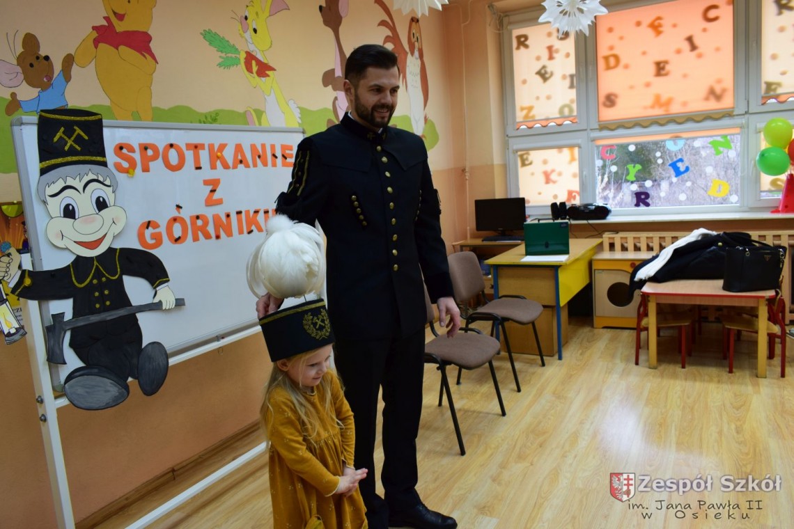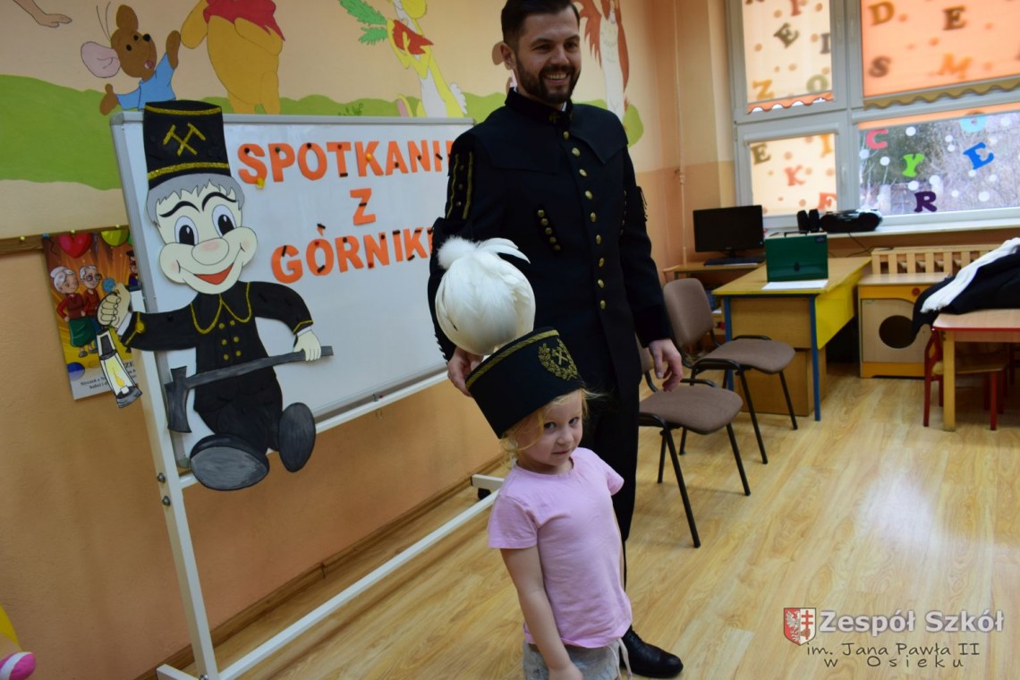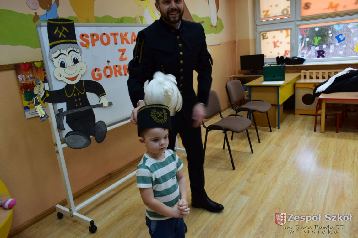 13.01.2023 r. w naszym przedszkolu gościliśmy górnika z Grupy Azoty Siarkopol Kopalni Siarki ,,Osiek”. Nasz gość ubrany w mundur galowy, zapoznał dzieci z częściami stroju górniczego, wszystkimi kolorami pióropuszy. Dzieci dowiedziały się również na czym polega praca górnika. Każdy przedszkolak mógł przymierzyć czapkę górniczą i otrzymał słodką niespodziankę.