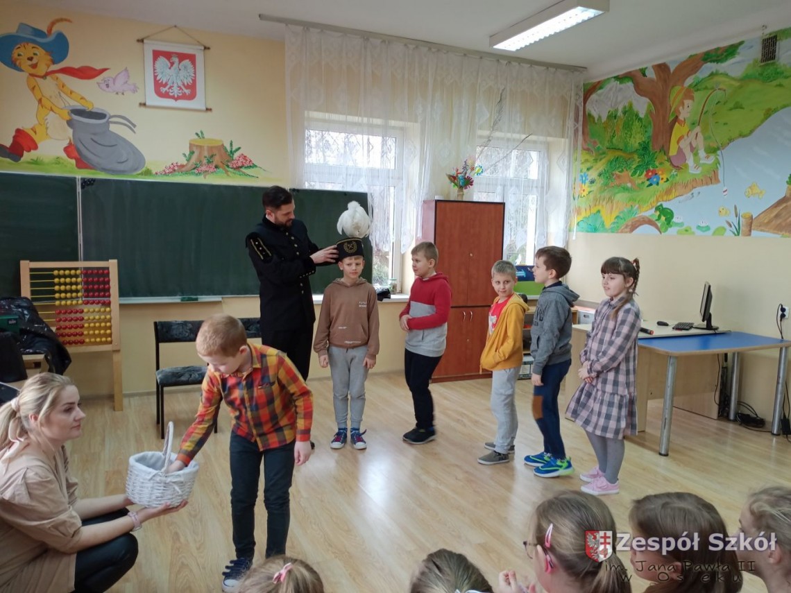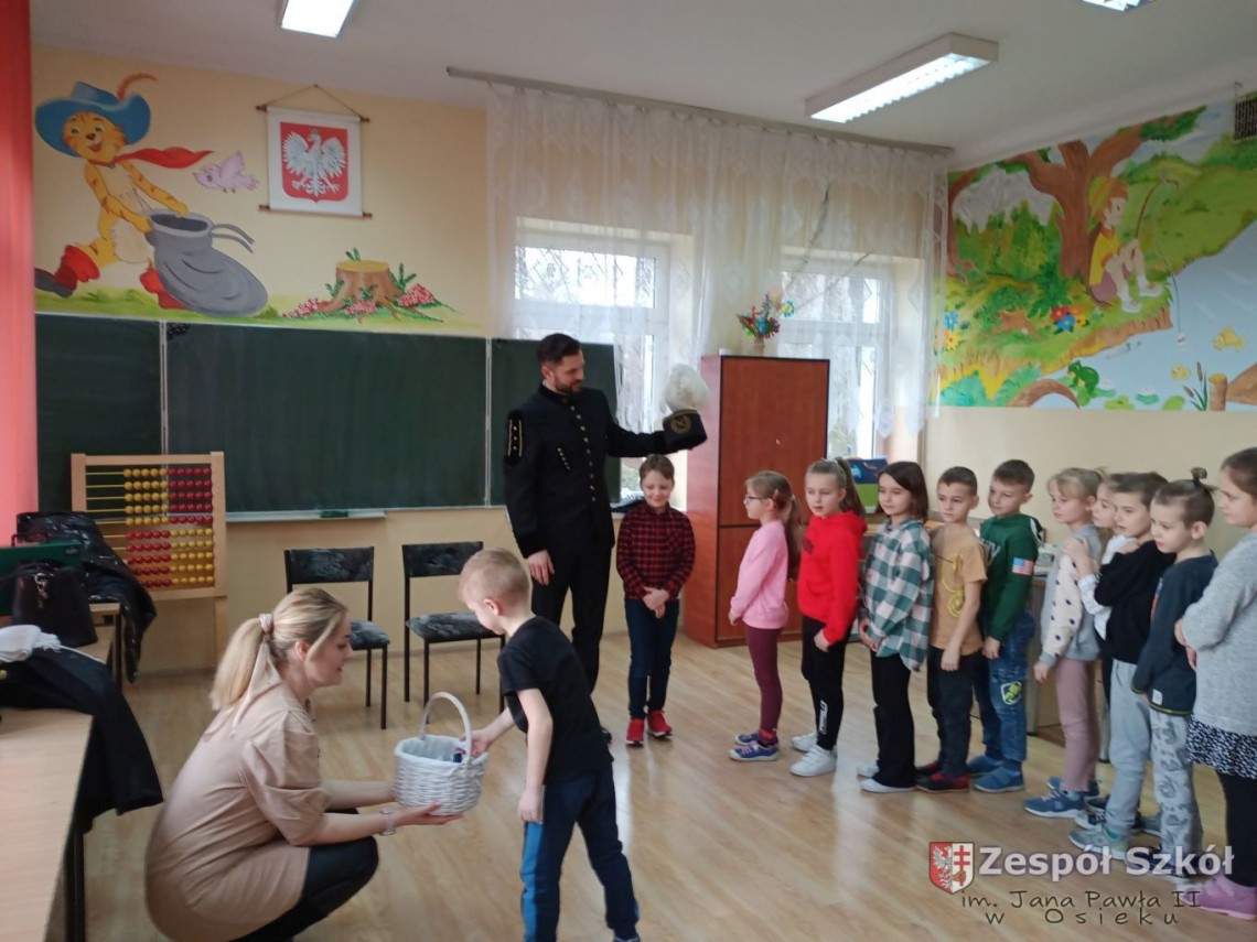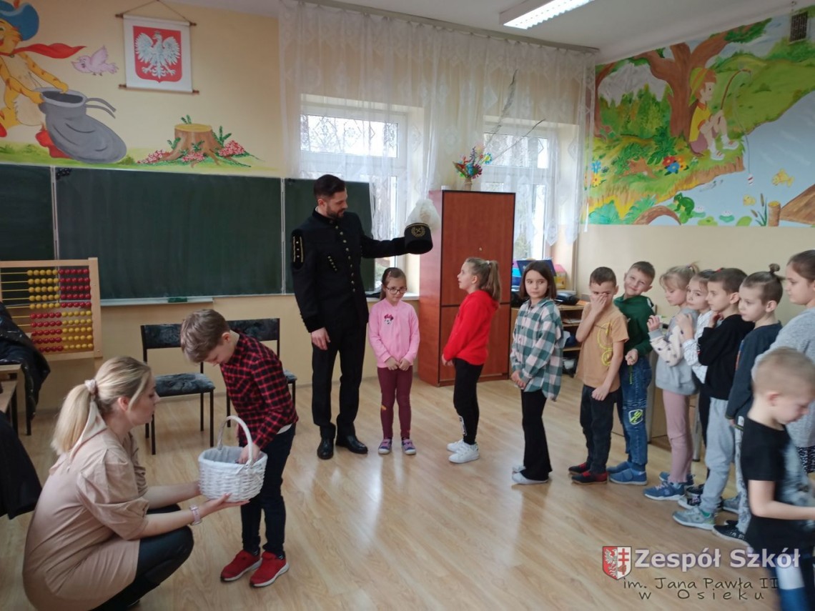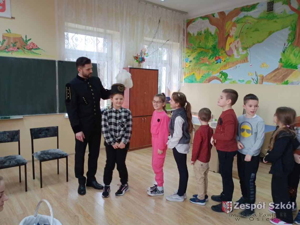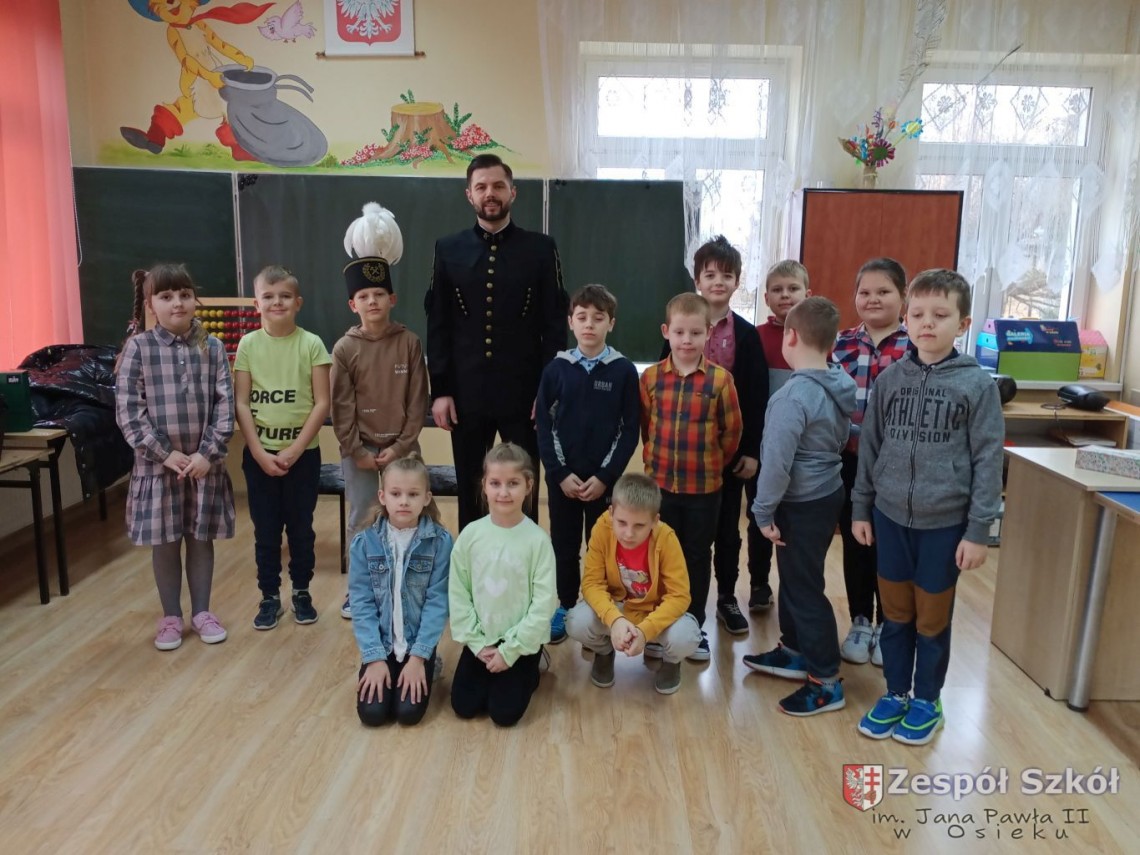 Z przodu czapka górnika zaopatrzona jest w godło górnicze na które składa się młotek i kilof. Narzędzia te służyły górnikom do rozbijania i drążenia szybów. Podczas rozmowy z Panem Norbertem, dzieci z klas I-III dowiedziały się jak nazywają się poszczególne części prezentowanego ubioru górnika i jakie znaczenia mają kolory piór na czapce górniczej. Pan Norbert opowiadał jaką metodą wydobywana jest siarka w Kopalni Osiek oraz jakie walory ma ten surowiec. Na koniec spotkania każde dziecko mogło przymierzyć czapkę górnika i zrobić pamiątkowe zdjęcie.