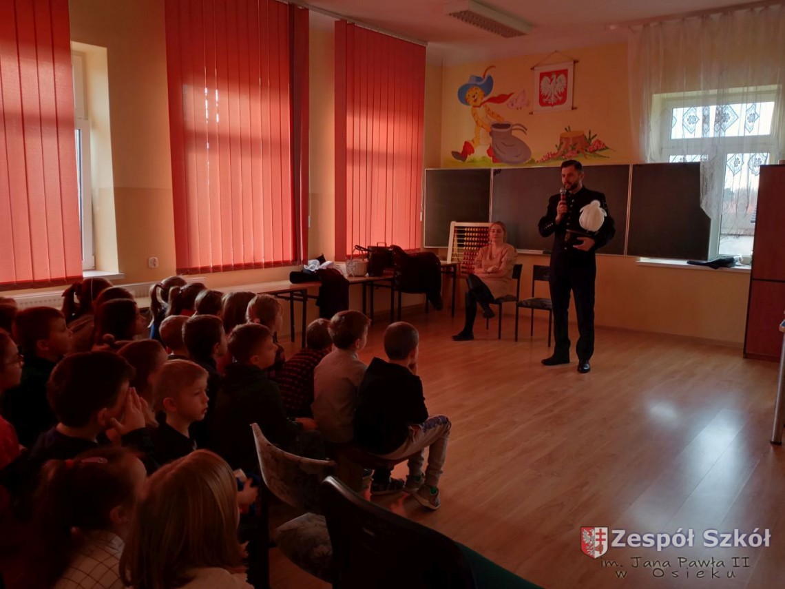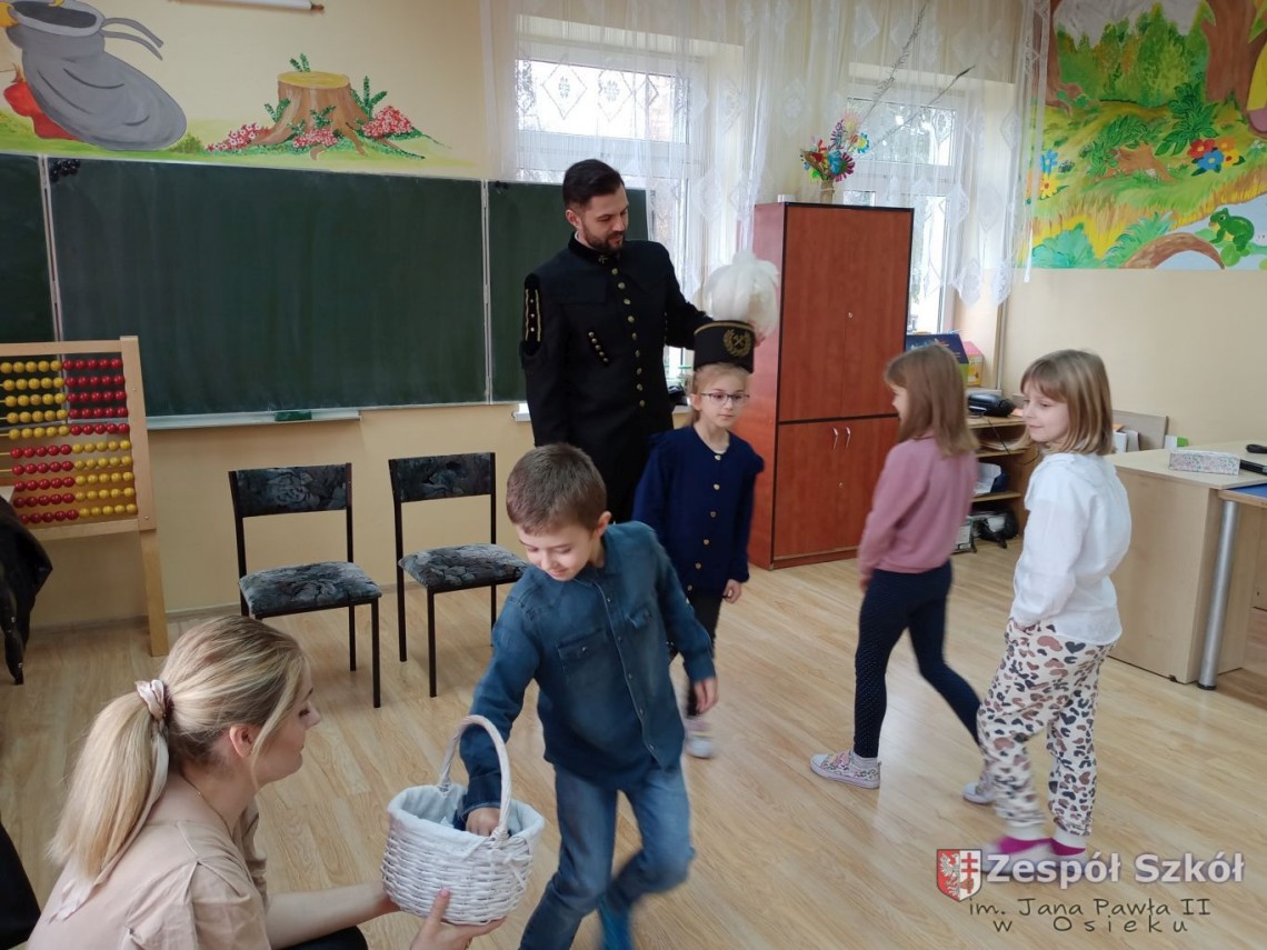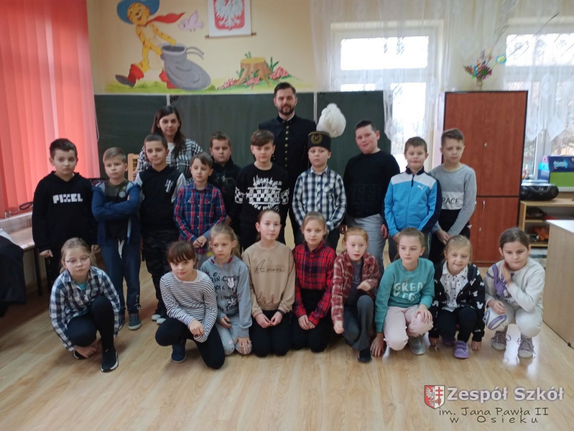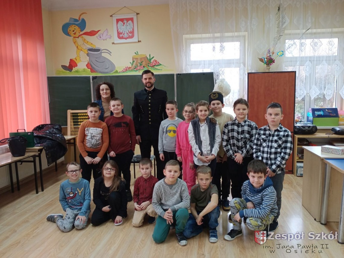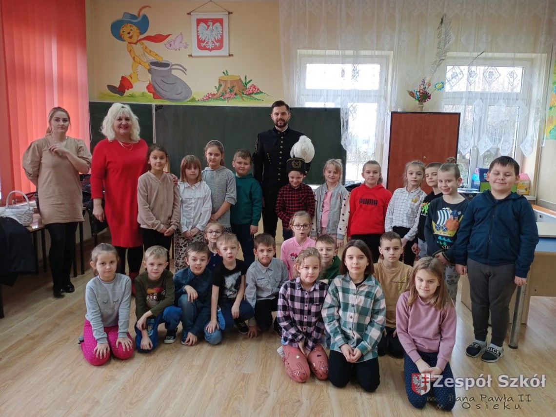 Z przodu czapka górnika zaopatrzona jest w godło górnicze na które składa się młotek i kilof. Narzędzia te służyły górnikom do rozbijania i drążenia szybów. Podczas rozmowy z Panem Norbertem, dzieci z klas I-III dowiedziały się jak nazywają się poszczególne części prezentowanego ubioru górnika i jakie znaczenia mają kolory piór na czapce górniczej. Pan Norbert opowiadał jaką metodą wydobywana jest siarka w Kopalni Osiek oraz jakie walory ma ten surowiec. Na koniec spotkania każde dziecko mogło przymierzyć czapkę górnika i zrobić pamiątkowe zdjęcie.