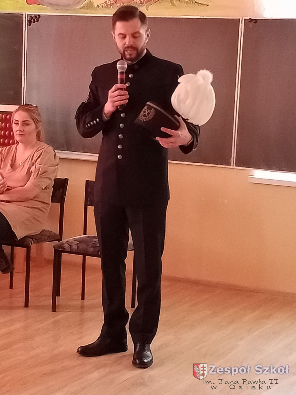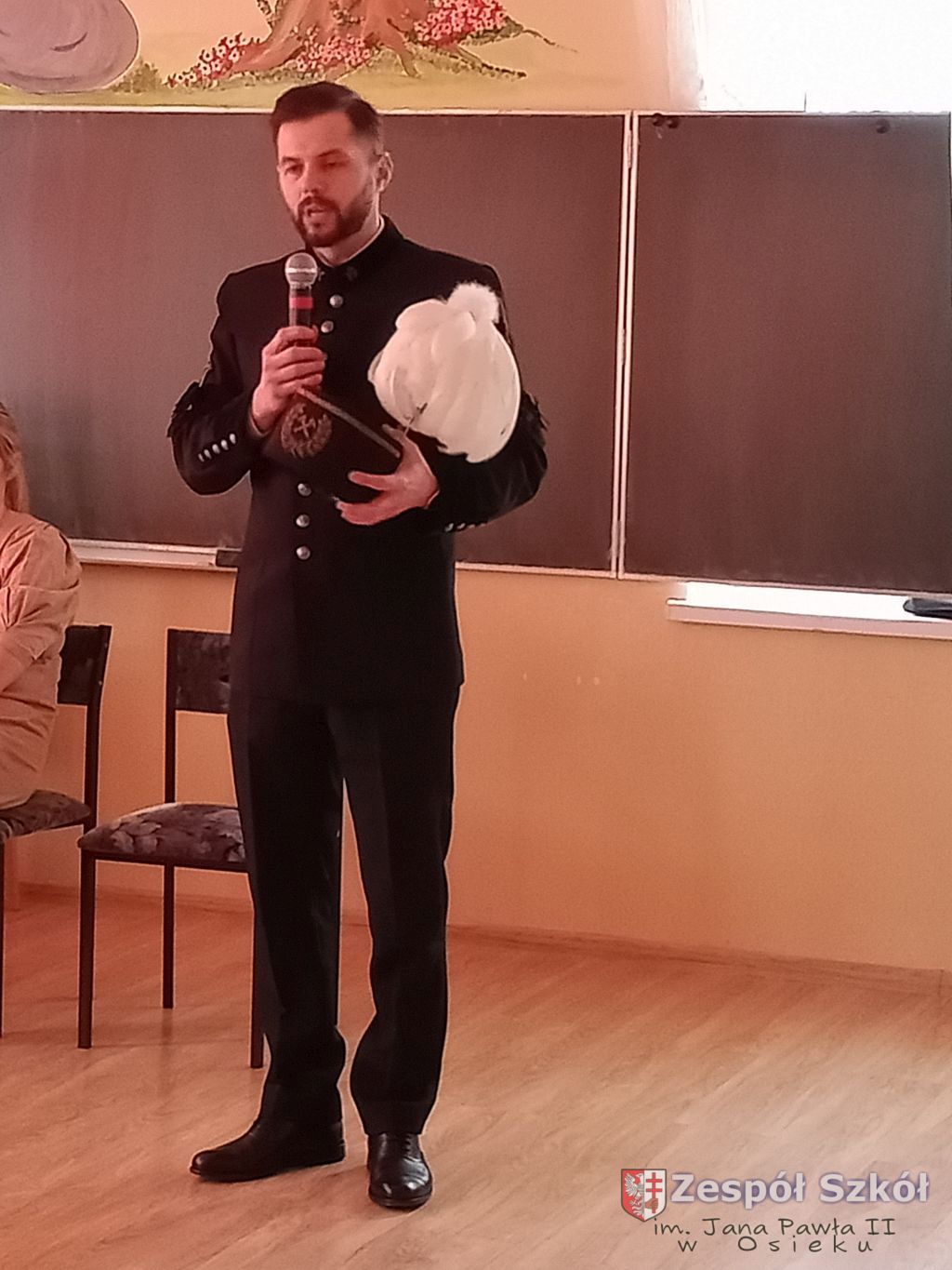Pan Norbert Seremak ubrany był w galowy mundur, a na jego czapce, która poprawnie nazywa się „czako” lśnił pióropusz z białych piór.
