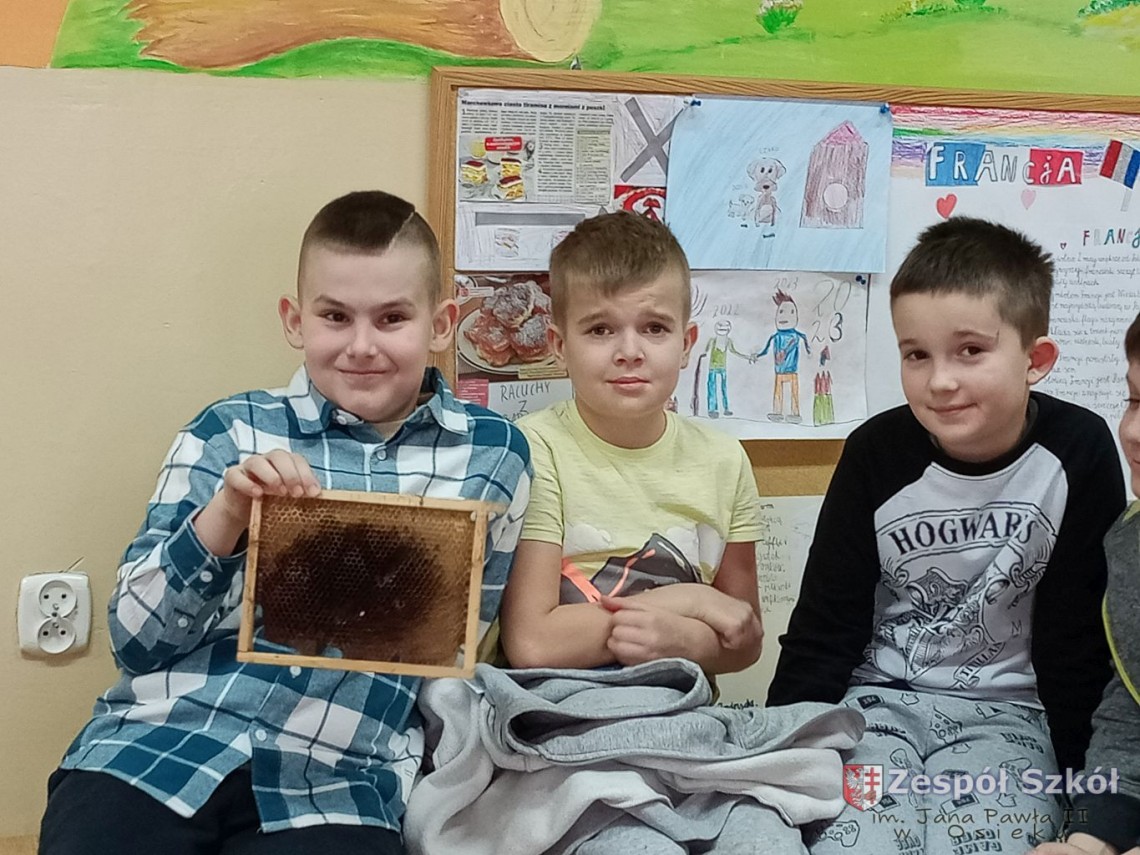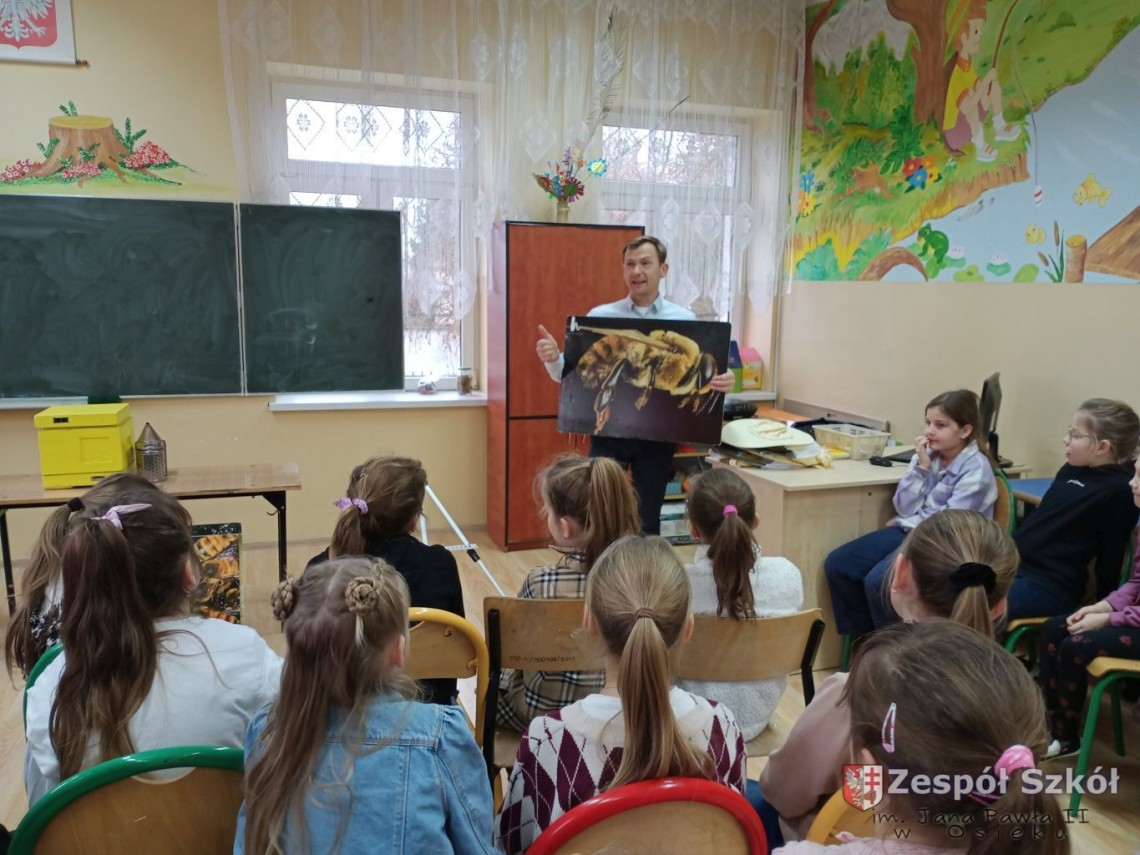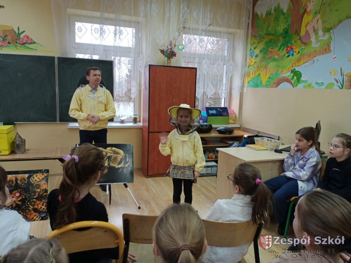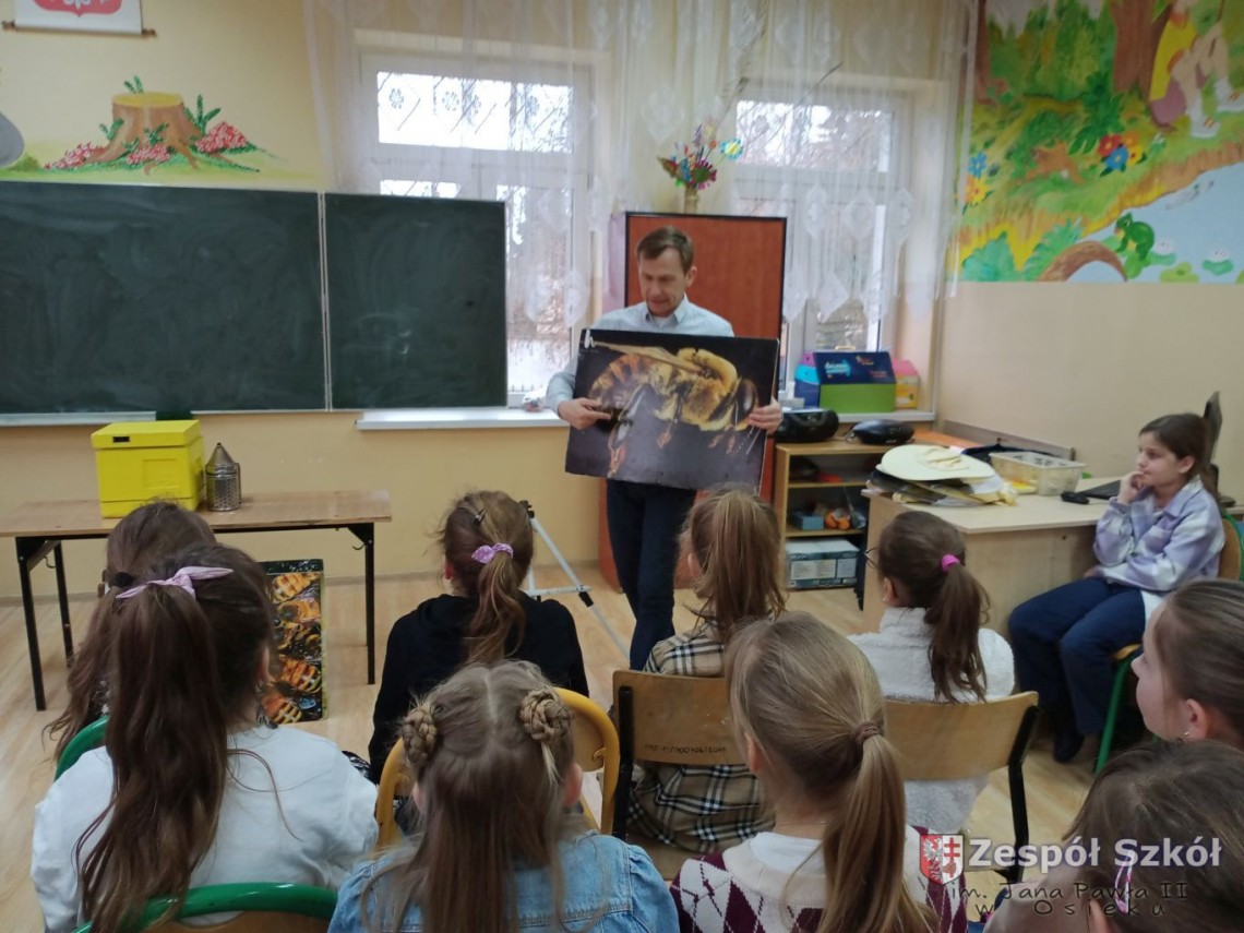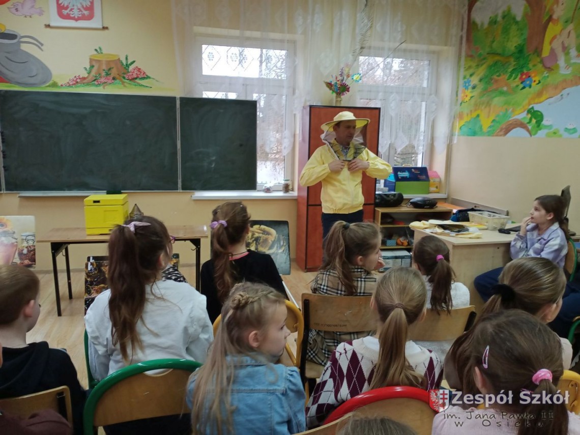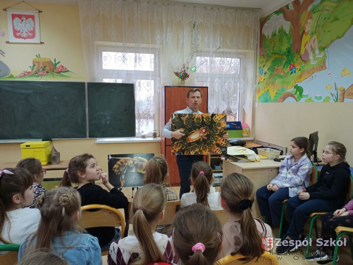 W dniu 25 stycznia 2023 r. uczniowie z klas 2a, 2b, 3, 4a i 4b uczestniczyli w spotkaniu z pszczelarzem, który bardzo ciekawie opowiadał o życiu pszczół i produkcji miodu. Zwracał on szczególną uwagę na role jakie spełniają w rodzinie pszczelej królowa, robotnice i trutnie. Uczniowie dowiedzieli się jak długo żyje pszczoła, ile zbierze miodu w czasie swojego życia, w jaki sposób pszczoły przenoszą zebrany nektar z kwiatów do ula i jak powstaje miód. Mieli niepowtarzalną okazję zobaczyć pszczoły z bliska w specjalnym szklanym ulu, jak również przymierzyć strój pszczelarza. Na zakończenie spotkania wszyscy zgodnie z instrukcją pszczelarza wykonali świece z wosku i otrzymali pamiątkowy certyfikat. Najważniejszym przesłaniem tego spotkania było uświadomienie dzieciom, jak ważne jest istnienie pszczół dla ludzi i świata.