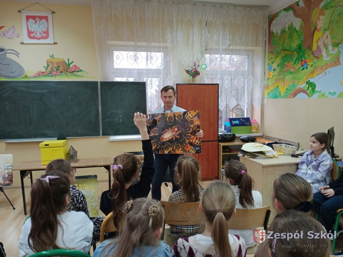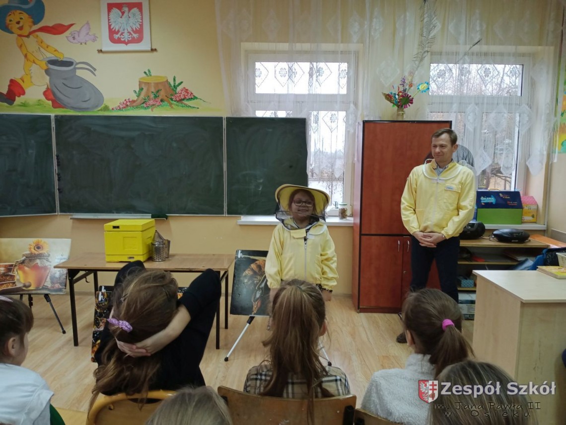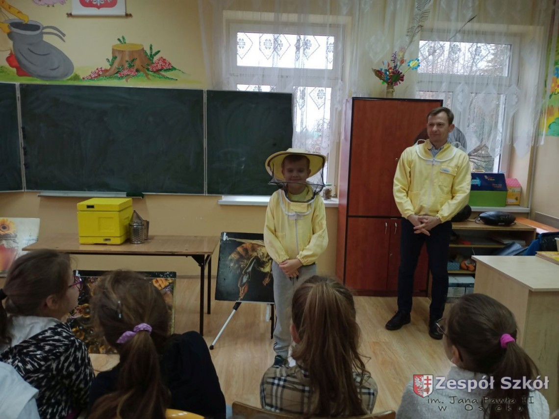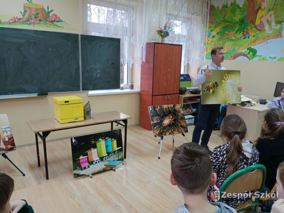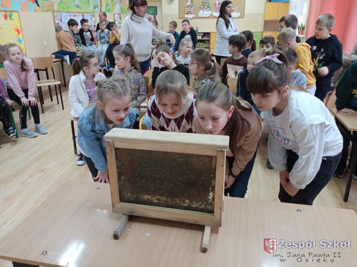 W dniu 25 stycznia 2023 r. uczniowie z klas 2a, 2b, 3, 4a i 4b uczestniczyli w spotkaniu z pszczelarzem, który bardzo ciekawie opowiadał o życiu pszczół i produkcji miodu. Zwracał on szczególną uwagę na role jakie spełniają w rodzinie pszczelej królowa, robotnice i trutnie. Uczniowie dowiedzieli się jak długo żyje pszczoła, ile zbierze miodu w czasie swojego życia, w jaki sposób pszczoły przenoszą zebrany nektar z kwiatów do ula i jak powstaje miód. Mieli niepowtarzalną okazję zobaczyć pszczoły z bliska w specjalnym szklanym ulu, jak również przymierzyć strój pszczelarza. Na zakończenie spotkania wszyscy zgodnie z instrukcją pszczelarza wykonali świece z wosku i otrzymali pamiątkowy certyfikat. Najważniejszym przesłaniem tego spotkania było uświadomienie dzieciom, jak ważne jest istnienie pszczół dla ludzi i świata.