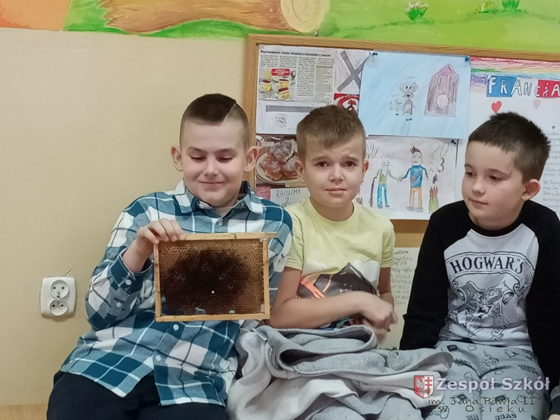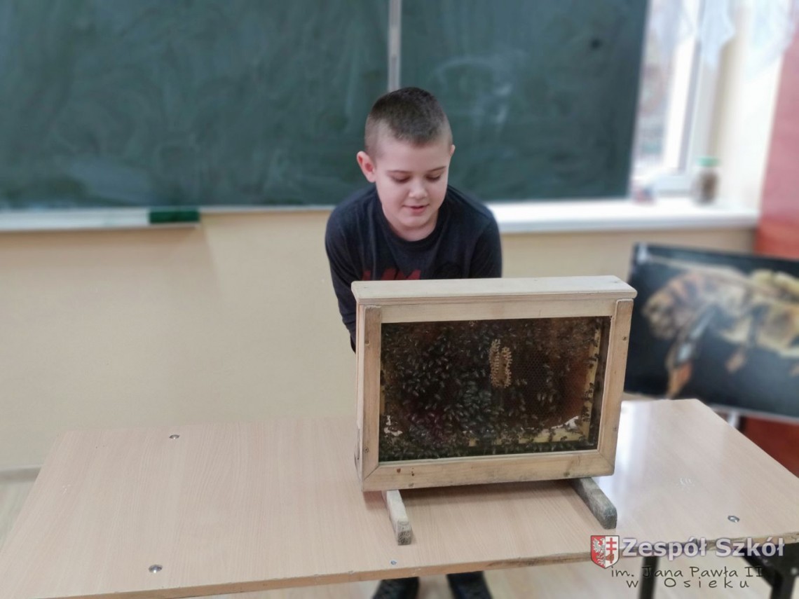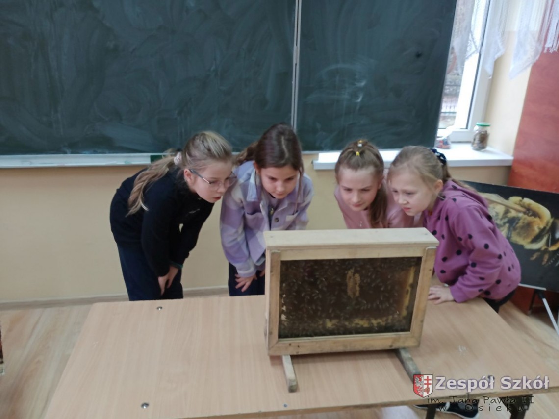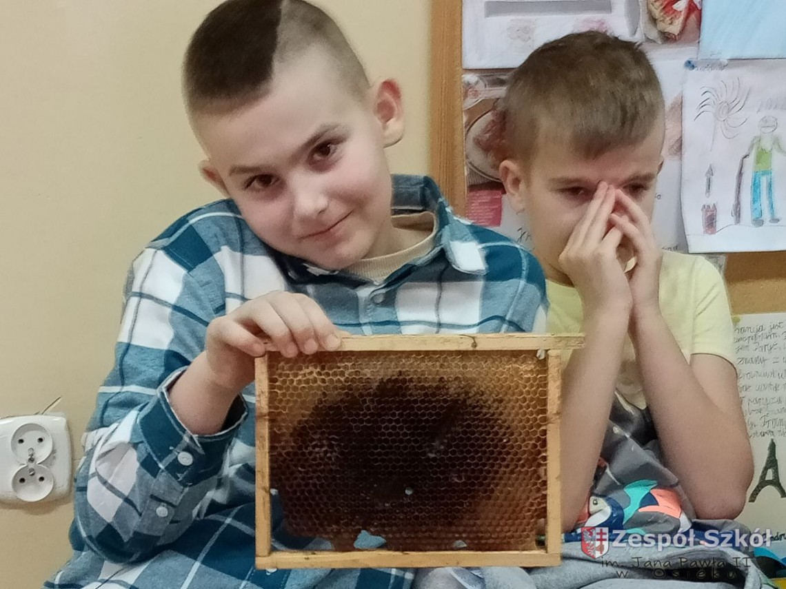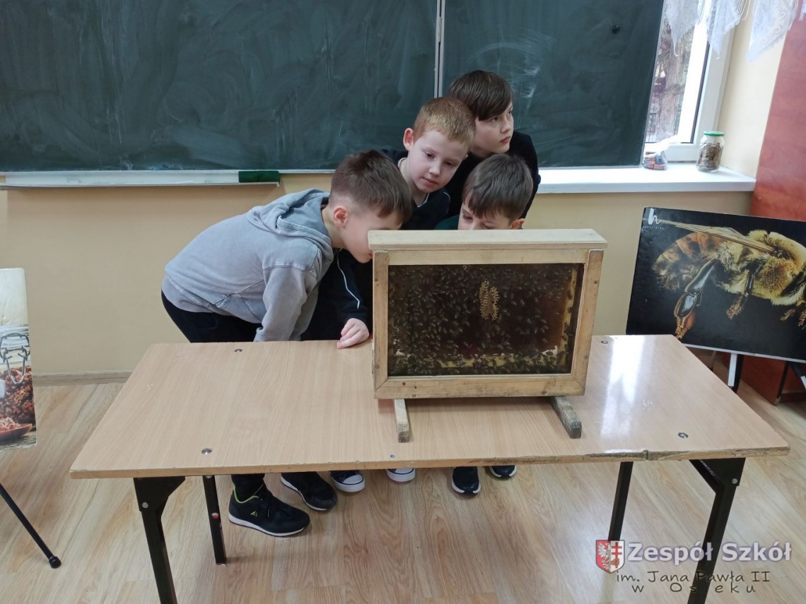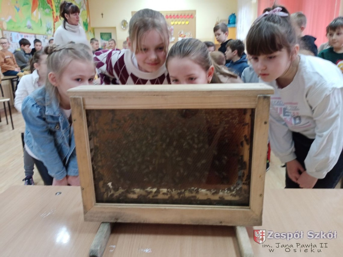 W dniu 25 stycznia 2023 r. uczniowie z klas 2a, 2b, 3, 4a i 4b uczestniczyli w spotkaniu z pszczelarzem, który bardzo ciekawie opowiadał o życiu pszczół i produkcji miodu. Zwracał on szczególną uwagę na role jakie spełniają w rodzinie pszczelej królowa, robotnice i trutnie. Uczniowie dowiedzieli się jak długo żyje pszczoła, ile zbierze miodu w czasie swojego życia, w jaki sposób pszczoły przenoszą zebrany nektar z kwiatów do ula i jak powstaje miód. Mieli niepowtarzalną okazję zobaczyć pszczoły z bliska w specjalnym szklanym ulu, jak również przymierzyć strój pszczelarza. Na zakończenie spotkania wszyscy zgodnie z instrukcją pszczelarza wykonali świece z wosku i otrzymali pamiątkowy certyfikat. Najważniejszym przesłaniem tego spotkania było uświadomienie dzieciom, jak ważne jest istnienie pszczół dla ludzi i świata.