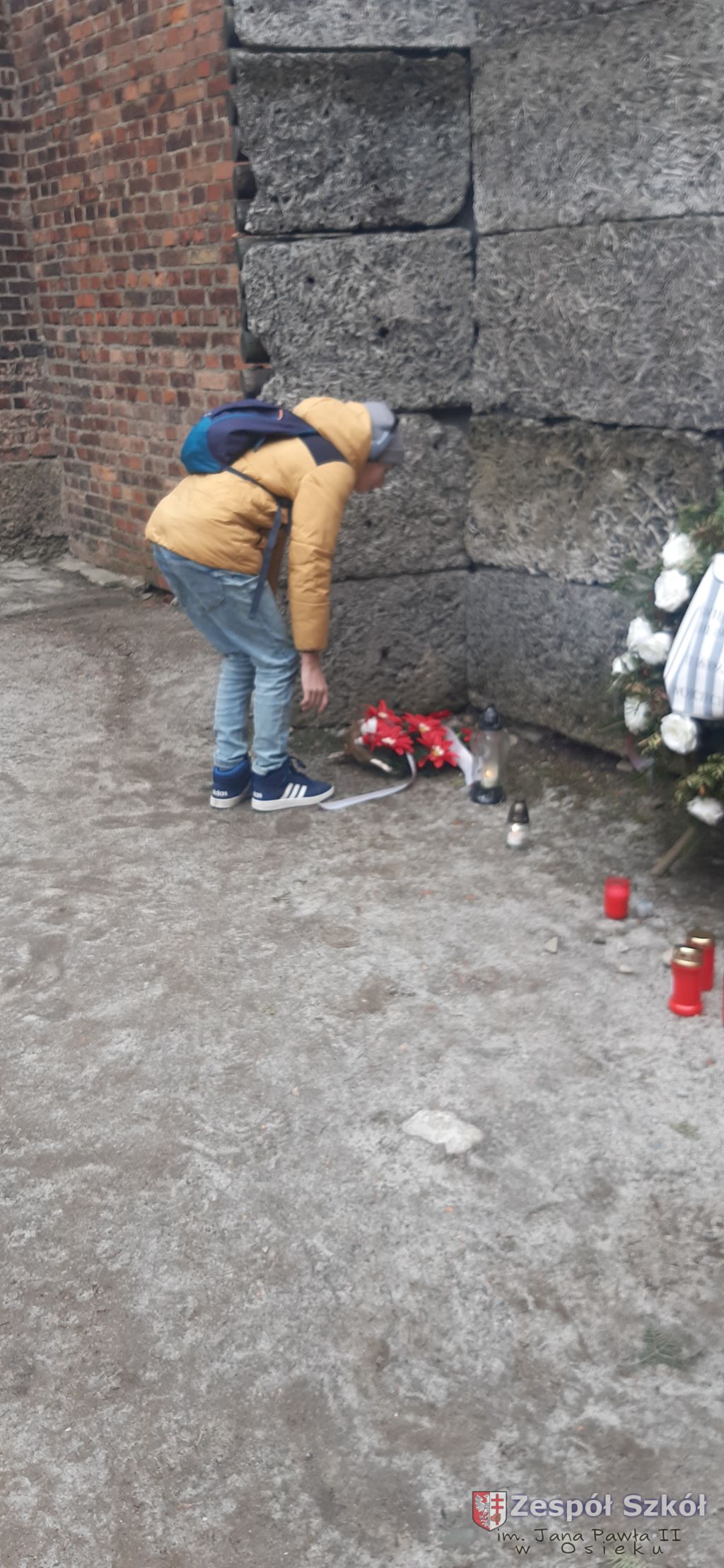 Po zwiedzeniu bloku 11, uczniowie złożyli wiązankę i pamiątkowy znicz pod Ścianą Śmierci, pod którą odbywały się egzekucje przez rozstrzelanie.